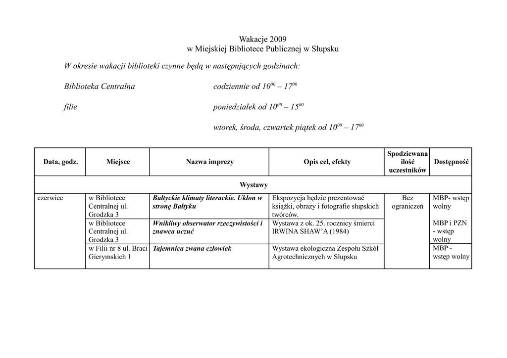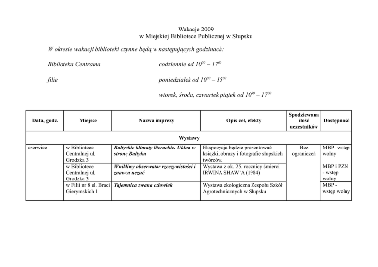 Wakacje 2009 w Miejskiej Bibliotece Publicznej w Słupsku W