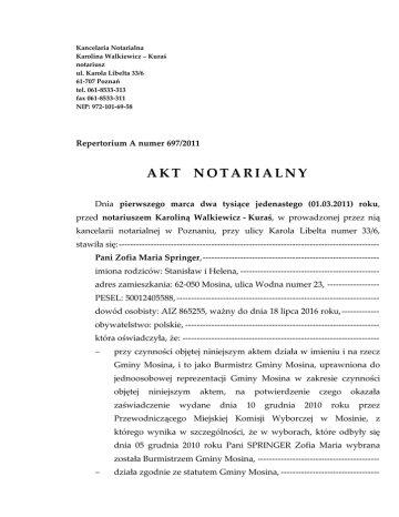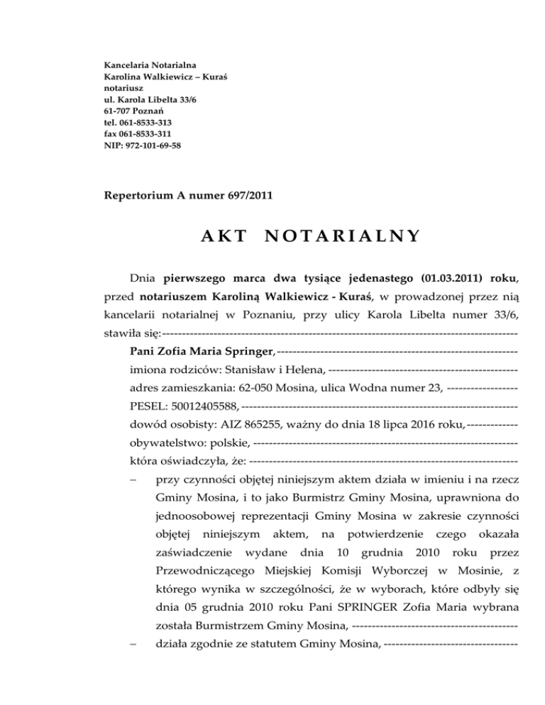 Kancelaria Notarialna Karolina Walkiewicz – Kuraś notariusz ul. Karola Libelta 33/6 61-707 Poznań tel. 061-8533-313 fax 061-8533-311 NIP: 972-101-69-58 Repertorium A numer 697/2011 AKT NOTARIALNY Dnia pierwszego marca dwa tysiące jedenastego (01.03.2011) roku, przed notariuszem Karoliną Walkiewicz - Kuraś, w prowadzonej przez nią kancelarii notarialnej w Poznaniu, przy ulicy Karola Libelta numer 33/6, stawiła się:-----------------------------------------------------------------------------------------Pani Zofia Maria Springer,------------------------------------------------------------imiona rodziców: Stanisław i Helena, -----------------------------------------------adres zamieszkania: 62-050 Mosina, ulica Wodna numer 23, -----------------PESEL: 50012405588, ---------------------------------------------------------------------dowód osobisty: AIZ 865255, ważny do dnia 18 lipca 2016 roku,------------obywatelstwo: polskie, ------------------------------------------------------------------która oświadczyła, że: ------------------------------------------------------------------- przy czynności objętej niniejszym aktem działa w imieniu i na rzecz Gminy Mosina, i to jako Burmistrz Gminy Mosina, uprawniona do jednoosobowej reprezentacji Gminy Mosina w zakresie czynności objętej niniejszym zaświadczenie aktem, wydane na dnia potwierdzenie 10 grudnia czego 2010 roku okazała przez Przewodniczącego Miejskiej Komisji Wyborczej w Mosinie, z którego wynika w szczególności, że w wyborach, które odbyły się dnia 05 grudnia 2010 roku Pani SPRINGER Zofia Maria wybrana została Burmistrzem Gminy Mosina, ----------------------------------------- działa zgodnie ze statutem Gminy Mosina, ---------------------------------- Kancelaria Notarialna Karolina Walkiewicz-Kuraś Notariusz zgodnie z dyspozycją art. 18 ust. 2 pkt 9) h) ustawy z dnia 08 marca 1990 roku o samorządzie gminnym (tekst jednolity: Dz.U. z 2001 roku Nr 142, poz. 1591 – z późniejszymi zmianami) oraz dyspozycją art. 22 ustawy z dnia 20 grudnia 1996 roku o gospodarce komunalnej (Dz.U. z 1997 roku Nr 9, poz. 43 – z późniejszymi zmianami) do dokonania czynności objętej niniejszym aktem wymagane są uchwały Rady Miejskiej w Mosinie, które to uchwały zostały przez Radę Miejską w Mosinie podjęte, na potwierdzenie czego okazała:--o Uchwałę nr IV/19/10 Rady Miejskiej w Mosinie z dnia 20 grudnia 2010 roku w sprawie likwidacji zakładu budżetowego o nazwie Zakład Usług Komunalnych w Mosinie w celu jego przekształcenia w spółkę prawa handlowego,------------------------ o Uchwałę nr IV/20/10 Rady Miejskiej w Mosinie z dnia 20 grudnia 2010 roku w sprawie utworzenia jednoosobowej spółki prawa handlowego, działającej pod firmą „Zakład Usług Komunalnych Sp. z o.o. w Mosinie”, ----------------------------------- zgodnie z treścią okazanej przy niniejszym akcie Uchwały nr LVII/397/10 Rady Miejskiej w Mosinie z dnia 26 marca 2010 roku w sprawie określenia zasad wnoszenia, cofania i zbywania udziałów i akcji w spółkach prawa handlowego przez Burmistrza Gminy Mosina do dokonania czynności objętej niniejszym aktem, polegającej w szczególności na wniesieniu wkładu niepieniężnego w postaci prawa własności nieruchomości objętych księgami wieczystymi pod oznaczeniami: KW NR 38 886., KW nr 38 888, KW nr 46 325 (bez uwzględnienia budynków posadowionych na nieruchomościach objętych księgami wieczystymi pod oznaczeniami KW NR 38 886., KW nr 38 888), w celu pokrycia udziału w spółce, wymagane komunalnego jest dokonanie przez biegłego wyceny wnoszonego rzeczoznawcę mienia posiadającego wymagane uprawnienia, która to wycena została przez takiego rzeczoznawcę dokonana, na potwierdzenie czego okazała operat szacunkowy nieruchomości 2 gruntowych zabudowanych Kancelaria Notarialna Karolina Walkiewicz-Kuraś Notariusz zlokalizowanych w Mosinie zapisanych w księgach wieczystych KW NR 38 886 cz., KW nr 38 888 cz., KW nr 46 325, sporządzony dnia 10 lutego 2011 roku przez Radosława Nowickiego – rzeczoznawcę majątkowego, uprawnienia numer 4951, z którego to dokumentu wynika w szczególności, że określono wartość rynkową gruntu przedmiotowych nieruchomości, jako przedmiotu prawa własności w kwocie: WG = 1 342 300 zł, słownie: jeden milion trzysta czterdzieści dwa tysiące trzysta złotych, i która to wycena nie dotyczy mienia wnoszonego, przez reprezentowaną przez nią Gminę Mosina, zgodnie z dyspozycją art. 23 ust. 1 ustawy z dnia 20 grudnia 1996 roku o gospodarce komunalnej, do zawiązywanej na podstawie niniejszego aktu Spółki, gdyż taka wycena zgodnie z obowiązującymi przepisami prawa i statutem Gminy Mosina nie jest wymagana,--------------------------------------------------------------------------- zgodnie z dyspozycją art. 46 ust. 3 ustawy z dnia 08 marca 1990 roku o samorządzie gminnym do dokonania czynności objętej niniejszym aktem wymagana jest kontrasygnata skarbnika Gminy (głównego księgowego budżetu) lub osoby przez niego upoważnionej, która to kontrasygnata została przez Skarbnika Gminy Mosina udzielona, na potwierdzenie czego okazała Oświadczenie wydane dnia 01 marca 2011 roku przez Skarbnika Gminy Mosina, ---------------------------------- do dokonania czynności objętej niniejszym aktem, poza powołanymi powyżej uchwałami oraz powołaną powyżej kontrasygnatą, nie jest wymagana zgoda żadnego innego organu reprezentowanej przez nią Gminy, jak również nie jest wymagane spełnienie jakichkolwiek innych wymogów formalnych przewidzianych przepisami prawa lub statutem Gminy Mosina. ----------------------------------------------------- Tożsamość stawającej notariusz ustaliła na podstawie okazanego dowodu tożsamości, którego serię i numer powołano powyżej.--------------------------------Stawająca oświadczyła, że dane wynikające z powołanego powyżej dowodu tożsamości są w pełni aktualne. ----------