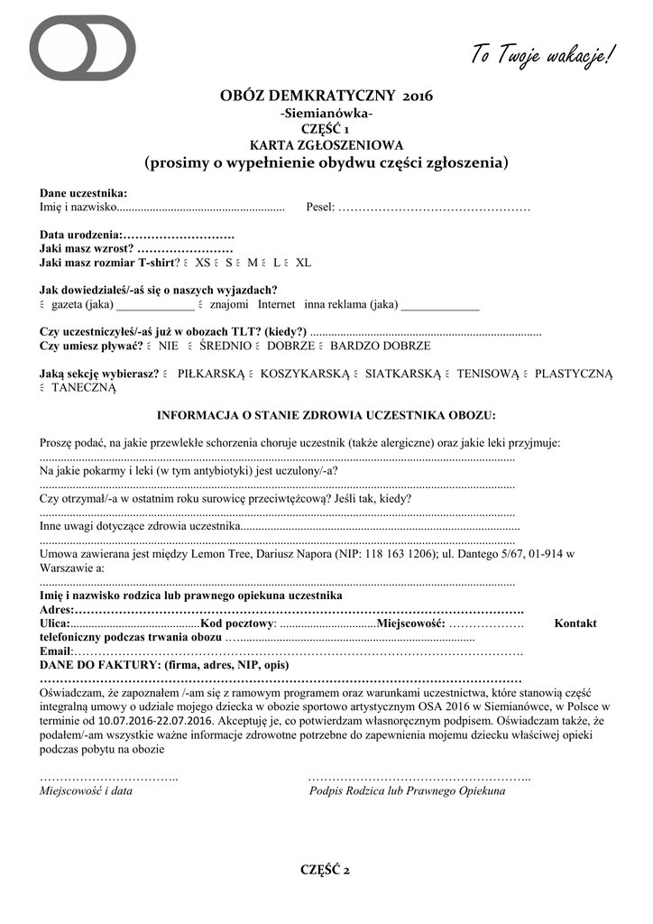 To Twoje wakacje! OBÓZ DEMKRATYCZNY 2016 -SiemianówkaCZĘŚĆ 1 KARTA ZGŁOSZENIOWA (prosimy o wypełnienie obydwu części zgłoszenia) Dane uczestnika: Imię i nazwisko........................................................ Pesel: ………………………………………… Data urodzenia:………………………. Jaki masz wzrost? …………………… Jaki masz rozmiar T-shirt? XS S M L XL Jak dowiedziałeś/-aś się o naszych wyjazdach? gazeta (jaka) _____________ znajomi Internet inna reklama (jaka) _____________ Czy uczestniczyłeś/-aś już w obozach TLT? (kiedy?) ............................................................................. Czy umiesz pływać? NIE ŚREDNIO DOBRZE BARDZO DOBRZE Jaką sekcję wybierasz? PIŁKARSKĄ KOSZYKARSKĄ SIATKARSKĄ TENISOWĄ PLASTYCZNĄ TANECZNĄ INFORMACJA O STANIE ZDROWIA UCZESTNIKA OBOZU: Proszę podać, na jakie przewlekłe schorzenia choruje uczestnik (także alergiczne) oraz jakie leki przyjmuje: .............................................................................................................................................................. Na jakie pokarmy i leki (w tym antybiotyki) jest uczulony/-a? .............................................................................................................................................................. Czy otrzymał/-a w ostatnim roku surowicę przeciwtężcową? Jeśli tak, kiedy? .............................................................................................................................................................. Inne uwagi dotyczące zdrowia uczestnika............................................................................................. .............................................................................................................................................................. Umowa zawierana jest między Lemon Tree, Dariusz Napora (NIP: 118 163 1206); ul. Dantego 5/67, 01-914 w Warszawie a: .............................................................................................................................................................. Imię i nazwisko rodzica lub prawnego opiekuna uczestnika Adres:…………………………………………………………………………………………………. Ulica:...........................................Kod pocztowy: ................................Miejscowość: ………………. Kontakt telefoniczny podczas trwania obozu .….............................................................................. Email:…………………………………………………………………………………………………. DANE DO FAKTURY: (firma, adres, NIP, opis) ………………………………………………………………………………………………………… Oświadczam, że zapoznałem /-am się z ramowym programem oraz warunkami uczestnictwa, które stanowią część integralną umowy o udziale mojego dziecka w obozie sportowo artystycznym OSA 2016 w Siemianówce, w Polsce w terminie od 10.07.2016-22.07.2016. Akceptuję je, co potwierdzam własnoręcznym podpisem. Oświadczam także, że podałem/-am wszystkie ważne informacje zdrowotne potrzebne do zapewnienia mojemu dziecku właściwej opieki podczas pobytu na obozie …………………………….. Miejscowość i data ……………………………………………….. Podpis Rodzica lub Prawnego Opiekuna CZĘŚĆ 2 To Twoje wakacje! WARUNKI UCZESTNICTWA W OBOZIE OSA 2016 W SIEMIANÓWCE -UMOWAObóz Sportowo Artystyczny OSA 2016 w okresie 10.07.2016-22.07.2016 organizowany jest przez Dariusza Napora, prowadzącego działalność gospodarczą pod firmą Lemon Tree Quality Language Services, Dariusz Napora, ul. Dantego 5/67, 01914 Warszawa NIP: 118 163 1206, I. ZAWARCIE UMOWY I WARUNKI PŁATNOŚCI 1.Zawarcie umowy o udział w obozie przez Klienta z Lemon Tree Quality Language Services, Dariusz Napora zwanym dalej Organizatorem następuje poprzez podpisanie Umowy uczestnictwa na zasadach określonych niniejszymi warunkami. Umowa oraz poniższe warunki stanowią integralną cześć Umowy zawartej miedzy Klientem a Organizatorem. 2. Klient zobowiązuje się do dokonania wpłat w ustalonych przez Organizatora terminach i wysokościach. Koszt obozu to 1820 zł brutto za każdego uczestnika obozu. W terminie siedmiu dni od dnia zawarcia umowy Klient wpłaca zaliczkę w wysokości 500zł za każdego uczestnika Do dnia 10 marca 2016 Klient wpłaca kwotę 660zł za każdego uczestnika obozu. Do dnia 10 maja 2016 Klient wpłaca kwotę 660zł za każdego uczestnika obozu 3. Miejsce spełnienia świadczenia pieniężnego przez Klienta, wynikającego z zwartej Umowy, jest wskazany przez Organizatora rachunek bankowy lub kasa Organizatora: Mbank: 36 1140 2004 0000 3002 3944 4215. 4. Niedokonanie wpłaty w określonym terminie powoduje skreślenie z listy uczestników i rozwiązanie umowy. II.ZMIANA CENY, PROGRAMU, TERMINU OBOZU 5. Organizator zastrzega sobie prawo do zmiany ceny i programu imprezy, spowodowane warunkami od niego niezależnymi np. zmiana kursu walut, cen paliw, zmiana taryf lub podatków. 6. Organizator zastrzega sobie prawo do zmiany programu przed rozpoczęciem obozu lub w uzasadnionych przypadkach także w trakcie jego trwania, jednakże zmiany te nie mogą powodować istotnych zmian postanowień umowy, a standard i zakres świadczeń zostanie zachowany. III.ODWOŁANIE OBOZU, REZYGNACJA Z UCZESTNICTWA W OBOZIE 7. Organizator zastrzega sobie prawo do odwołania imprezy na 7 dni przed jej rozpoczęciem, gdy nie osiągnie się wymaganego minimum uczestników lub w każdej chwili przed rozpoczęciem imprezy z przyczyn niezależnych od organizatora takich jak siła wyższa, związana z decyzją władz państwowych, niepokojów wewnętrznych, kataklizmów. Klientowi nie przysługuje z tego tytułu odszkodowanie, jedynie zwrot wpłaconej kwoty. 8. Ods