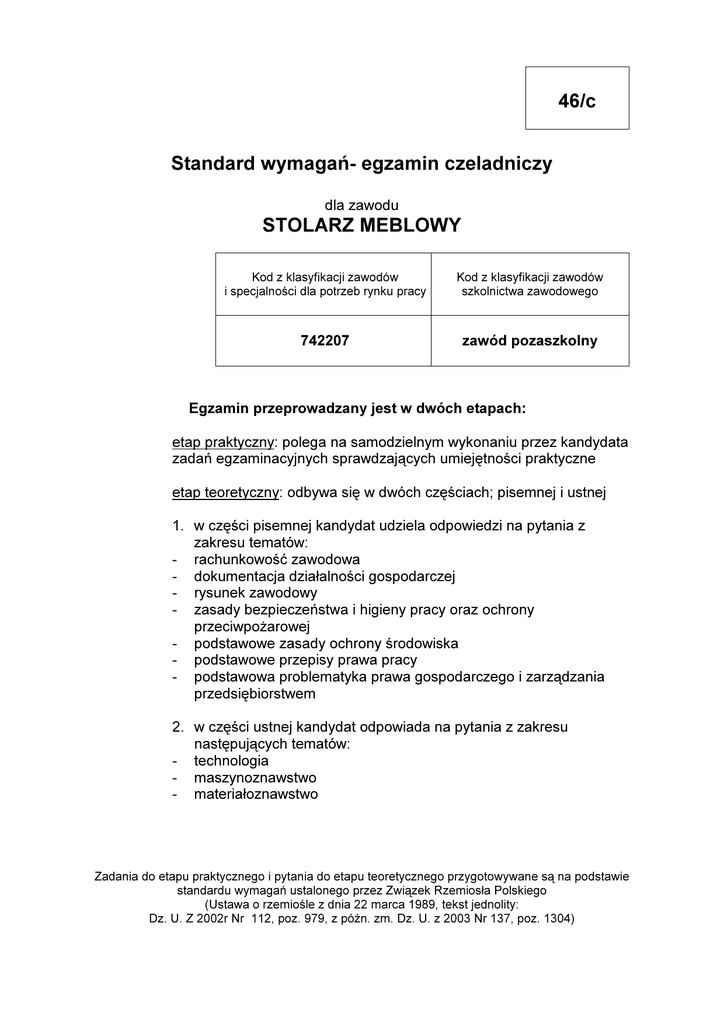 46/c Standard wymagań- egzamin czeladniczy STOLARZ MEBLOWY