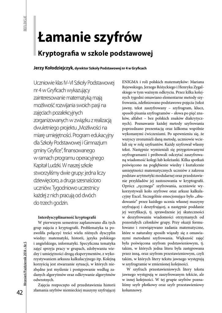 REFLEKSJE Łamanie szyfrów Kryptografia w szkole podstawowej Jerzy Kołodziejczyk, dyrektor Szkoły Podstawowej nr 4 w Gryficach Wrzesień/Październik 2014 • Nr 5 Uczniowie klas IV–VI Szkoły Podstawowej nr 4 w Gryficach wykazujący zainteresowanie matematyką mają możliwość rozwijania swoich pasji na zajęciach pozalekcyjnych zorganizowanych w związku z realizacją dwuletniego projektu „Możliwości na miarę umiejętności. Program edukacyjny dla Szkoły Podstawowej i Gimnazjum gminy Gryfice”, finansowanego w ramach programu operacyjnego Kapitał Ludzki. W naszej szkole stworzyliśmy dwie grupy: jedna liczy dziewięcioro, a druga szesnaścioro uczniów. Tygodniowo uczestnicy każdej z nich pracują od dwóch do trzech godzin. 42 Interdyscyplinarność kryptografii W pierwszym semestrze zaplanowano dla tych grup zajęcia z kryptografii. Problematyka ta pozwoliła połączyć treści wielu różnych dyscyplin wiedzy: matematyki, historii, języka polskiego i angielskiego, informatyki. Specyficzna tematyka zajęć sprzyja pracy w grupach, zdobywaniu wiedzy i umiejętności drogą eksperymentów, z wykorzystywaniem arkusza kalkulacyjnego itp. Kolejną korzyścią jest stwarzanie sytuacji, w których niezbędne jest myślenie i postępowanie według zadanych algorytmów oraz odkrywanie algorytmów odwrotnych. Zajęcia rozpoczęto od przedstawienia historii złamania szyfrów niemieckiej maszyny szyfrującej ENIGMA i roli polskich matematyków: Mariana Rejewskiego, Jerzego Różyckiego i Henryka Zygalskiego w tym ważnym odkryciu. Przez kilka kolejnych tygodni omawiano elementarne metody szyfrowania, zdefiniowano podstawowe pojęcia (tekst jawny, tekst zaszyfrowany – szyfrogram, klucz, sposób pisania szyfrogramów – słowa po pięć znaków, alfabet – bez polskich znaków diakrytycznych). Poznawanie każdej metody szyfrowania poprzedzano prezentacją oraz kilkoma wspólnie wykonanymi ćwiczeniami. Po upewnieniu się, że wszyscy zrozumieli daną metodę, uczniowie wcielali się w rolę szyfrantów. Każdy szyfrował własny tekst. Następnie wymieniali się przygotowanymi szyfrogramami i próbowali odczytać zaszyfrowaną wiadomość kolegi lub koleżanki. Kilka spotkań poświęcono na pogłębienie wiedzy i kształcenie umiejętności matematycznych uczniów z zakresu podstaw arytmetyki modularnej oraz przedstawienie przykładów jej zastosowania w kryptografii. Oprócz „ręcznego” szyfrowania, uczniowie wykorzystywali koło szyfrowe oraz arkusz kalkulacyjny Excel. Szczególnie emocjonujące było „zbudowanie” przez każdego ucznia własnej maszyny szyfrującej i deszyfrującej, a następnie poddanie jej weryfikacji, tj. sprawdzenie jej skuteczności w deszyfrowaniu wiadomości otrzymanych od pozostałych członków grupy. Przy okazji formułowano i rozwiązywano zadania matematyczne, które w naturalny sposób wiązały się z omawianymi metodami szyfrowania. Większość zajęć była poświęcona szyfrom podstawieniowym, tj. takim, w których jedna litera była zastępowana przez inną, oraz szyfrom przestawieniowym, czyli takim, w których litery tekstu jawnego występują w szyfrogramie w zmienionej kolejności. W szyfrach przestawieniowych litery tekstu jawnego występują w zaszyfrowanym tekście, ale w innej kolejności. W tej grupie szyfrów poznaliśmy szyfr płotkowy oraz szyfr przestawieniowy kolumnowy. Dla przykładu słowo koza przyjmie postać: Szyfr płotkowy Szyfr płotkowy wykorzystuje specyficzną formę zapisu „zygzakiem” (po skosie w dół i w górę). Jeśli zapiszemy frazę nasza szkoła jest wesoła w trzech wierszach, to czytając znaki poziomo otrzymamy szyfrogram tej informacji: naoeeaazskljswslszato, co pisane po pięć znaków (przyjmujemy umowę – tekst jawny zapisujemy małymi literami, szyfrogramy wielkimi, po pięć liter w jednym słowie): NAOEE AAZSK LJSWS LSZAT A. Kluczem w tej metodzie szyfrowania jest liczba wierszy. Jako ćwiczenie proponujemy zaszyfrowanie tej samej informacji przy pomocy czterech wierszy. Odczytanie informacji tak zaszyfrowanej pozostawiamy Czytelnikowi. Szyfr książkowy Szyfr książkowy to metoda szyfrowania liter, a nawet słów, za pomocą określonej książki. Każdą kolejną literę tekstu jawnego szyfrujemy za pomocą trzech liczb, pierwsza podaje numer strony, druga wiersza, a trzecia litery (lub słowa) w tym wierszu. Szyfrogram jest ciągiem trójek liczbowych, określających kolejne litery (słowa) ukrywanej informacji. Szyfr Cezara Ten szyfr wykorzystuje prostą zasadę zamiany liter: każda litera alfabetu zostaje zastąpiona literą, która jest w alfabecie o 3 pozycje dalej. Oczywiście alfabet należy traktować cyklicznie, tj. po literze z następną jest a, później b itd. Poniżej pokazano dwa alfabety (pisane małymi i wielkimi literami). Drugi powstał z przesunięcia pierwszego o 3 miejsca w prawo. Zdanie Liczba parzysta może być pierwsza po zaszyfrowaniu metodą Cezara będzie miało postać: OLFCE DSDUC BVWDP RCHEB FSLHU ZVCD. Jeśli informację zaszyfrowano za pomocą klucza 3, to do jej odszyfrowania potrzeba klucza – lub klucza dodatniego 23. Przyjmując klucz 13 – otrzymamy szyfr ROT13, który jest ciekawy z tego względu, że powtórne zaszyfrowanie szyfrogramu prowadzi do odszyfrowania wiadomości. Podczas omawiania szyfrów podobnych do szyfru Cezara uczniowie zauważyli, że wygodnie jest ponumerować litery alfabetu, a następnie, znając klucz, obliczyć numery liter, których użyją w szyfrogramach. Ten moment wykorzystano do zapoznania uczniów z podstawami arytmetyki modularnej. Omówiono dodawanie i mnożenie modulo 12 i modulo 26. Wybór modułu 12 wynikał z doświadczeń uczniów w posługiwaniu się zegarem. Uczniowie rozumieli, dlaczego 9+5 modulo 12 jest równe 2, a 3 . 5 modulo 12 jest równe 3. Ułatwiło to definiowanie tabelek dodawania i mnożenia przy innych modułach. Wybór modułu 26 był związany z liczbą liter w alfabecie (bez po