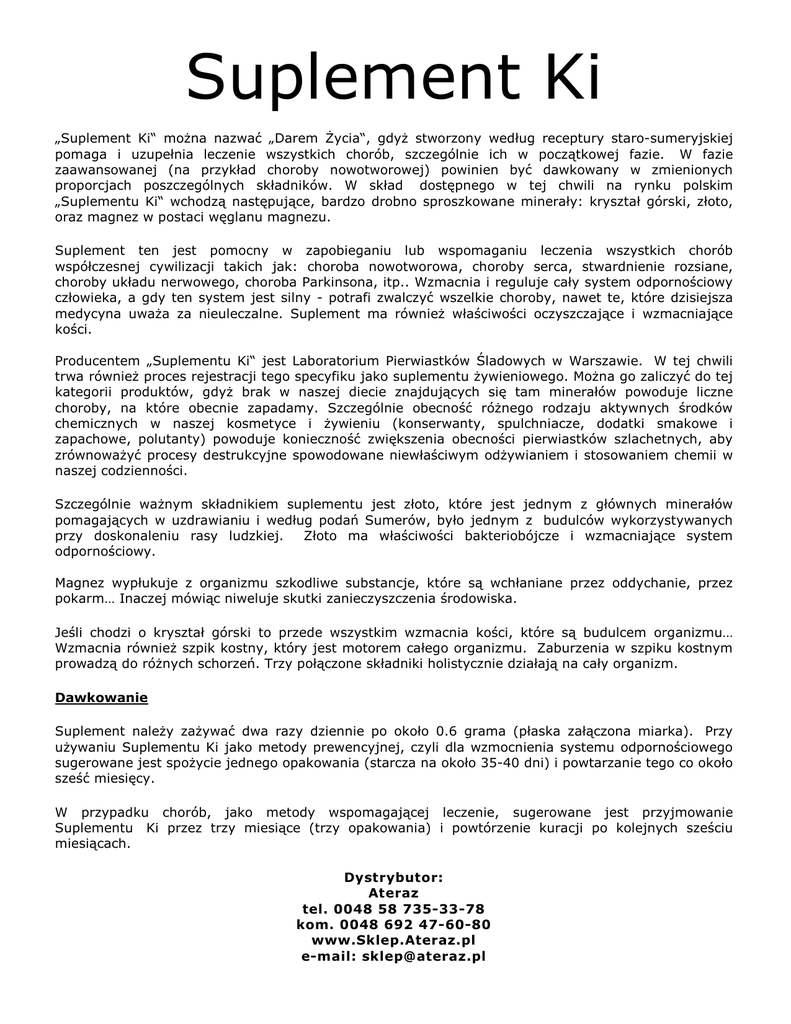 Suplement Ki „Suplement Ki“ można nazwać „Darem Życia“, gdyż stworzony według receptury staro-sumeryjskiej pomaga i uzupełnia leczenie wszystkich chorób, szczególnie ich w początkowej fazie. W fazie zaawansowanej (na przykład choroby nowotworowej) powinien być dawkowany w zmienionych proporcjach poszczególnych składników. W skład dostępnego w tej chwili na rynku polskim „Suplementu Ki“ wchodzą następujące, bardzo drobno sproszkowane minerały: kryształ górski, złoto, oraz magnez w postaci węglanu magnezu. Suplement ten jest pomocny w zapobieganiu lub wspomaganiu leczenia wszystkich chorób współczesnej cywilizacji takich jak: choroba nowotworowa, choroby serca, stwardnienie rozsiane, choroby układu nerwowego, choroba Parkinsona, itp.. Wzmacnia i reguluje cały system odpornościowy człowieka, a gdy ten system jest silny - potrafi zwalczyć wszelkie choroby, nawet te, które dzisiejsza medycyna uważa za nieuleczalne. Suplement ma również właściwości oczyszczające i wzmacniające kości. Producentem „Suplementu Ki“ jest Laboratorium Pierwiastków Śladowych w Warszawie. W tej chwili trwa również proces rejestracji tego specyfiku jako suplementu żywieniowego. Można go zaliczyć do tej kategorii produktów, gdyż brak w naszej diecie znajdujących się tam minerałów powoduje liczne choroby, na które obecnie zapadamy. Szczególnie obecność różnego rodzaju aktywnych środków chemicznych w naszej kosmetyce i żywieniu (konserwanty, spulchniacze, dodatki smakowe i zapachowe, polutanty) powoduje konieczność zwiększenia obecności pierwiastków szlachetnych, aby zrównoważyć procesy destrukcyjne spowodowane niewłaściwym odżywianiem i stosowaniem chemii w naszej codzienności. Szczególnie ważnym składnikiem suplementu jest złoto, które jest jednym z głównych minerałów pomagających w uzdrawianiu i według podań Sumerów, było jednym z budulców wykorzystywanych przy doskonaleniu rasy ludzkiej. Złoto ma właściwości bakteriobójcze i wzmacniające system odpornościowy. Magnez wypłukuje z organizmu szkodliwe substancje, które są wchłaniane przez oddychanie, przez pokarm… Inaczej mówiąc niweluje skutki zanieczyszczenia środowiska. Jeśli chodzi o kryształ górski to przede wszystkim wzmacnia kości, które są budulcem organizmu… Wzmacnia również szpik kostny, który jest motorem całego organizmu. Zaburzenia w szpiku kostnym prowadzą do różnych schorzeń. Trzy połączone składniki holistycznie działają na cały organizm. Dawkowanie Suplement należy zażywać dwa razy dziennie po około 0.6 grama (płaska załączona miarka). Przy używaniu Suplementu Ki jako metody prewencyjnej, czyli dla wzmocnienia systemu odpornościowego sugerowane jest spożycie jednego opakowania (starcza na około 35-40 dni) i powtarzanie tego co około sześć miesięcy. W przypadku chorób, jako metody wspomagającej leczenie, sugerowane jest przyjmowanie Suplementu Ki przez trzy miesiące (trzy opakowania) i powtórzenie kuracji po kolejnych sześciu miesiącach. Dystrybutor: Ateraz tel. 0048 58 735-33-78 kom. 0048 692 47-60-80 www.Sklep.Ateraz.pl e-mail: [email protected]