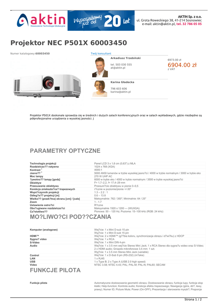 Projektor NEC P501X 60003450 Numer katalogowy:60003450 Twój konsultant Arkadiusz Trzebiński tel. 503 030 555 [email protected] NOWOŚĆ W OFERCIE 6973.00 zł 6904.00 zł z VAT Karina Gładecka 796 603 606 [email protected] Projektor P501X doskonale sprawdza się w średnich i dużych salach konferencyjnych oraz w salach wykładowych, gdzie niezbędne są półprofesjonalne urządzenia o wysokiej jasności. J PARAMETRY OPTYCZNE Technologia projekcji Rozdzielczo?? natywna Kontrast 1 Jasno?? 1 Moc lampy ?ywotno?? lampy [godz] Obiektyw Przesuwanie obiektywu Korekcja zniekszta?ce? trapezowych Wspó?czynnik projekcji Odleg?o?? projekcji [m] Wielko?? (przek?tna) ekranu [cm] / [cale] Zoom Ustawienie ostro?ci Obs?ugiwane rozdzielczo?ci Cz?stotliwo?? Panel LCD 3 x 1,6 cm (0,63") z MLA 1024 x 768 (XGA) 4000:1 5000 ANSI lumenów w trybie wysokiej jasno?ci / 4000 w trybie normalnym / 3000 w trybie eko 270 W UHP AC 6000 w trybie eko / 4000 w trybie normalnym / 3500 w trybie wysokiej jasno?ci F= 1,7–2,2, f= 17,4–29 mm Przesuni?cie obiektywu w pionie 0–0,5 r?cznie w poziomie/pionie +/-30° 1.3 – 2.2 : 1 0.6 – 13.8 Maksymalnie: 762 / 300"; Minimalnie: 64 / 25" 1 - 1.7 R?czne Maksymalnie 1920 x 1200 — (WUXGA) Pionowa: 50 – 120 Hz; Pozioma: 15–100 kHz (RGB: 24 kHz) MO?LIWO?CI POD??CZANIA Komputer (analogowe) HDMI™ Sygna? video S-Video Audio Control LAN USB Video Wej?cie: 1 x Mini D-sub 15 pin Wyj?cie: 1 x Mini D-sub 15 pin Wej?cie: 2 x HDMI™ (g??bia koloru, synchronizacja obrazu i d?wi?ku) z HDCP Wej?cie: 1 x RCA Wej?cie: 1 x Mini DIN 4-pin Wej?cie: 1 x 3.5 mm wej?cie Stereo Mini Jack; 1 x RCA Stereo dla sygna?u wideo oraz S-Video; 2 x HDMI audio; Gniazdo mikrofonowe 3,5 mm: 1 szt. Wyj?cie: 1 x 3.5 mm Stereo Mini Jack (variable) Wej?cie: 1 x D-Sub 9 pin (RS-232) (m?skie) 1 x RJ45 1 x Type B; 2 x Type A (USB 2.0 high speed) NTSC 3.58; NTSC 4.43; PAL; PAL-M; PAL-N; PAL60; SECAM FUNKCJE PILOTA Funkcje pilota Automatyczne dostosowanie geometrii obrazu; Dostosowanie obrazu; funkcja lupy; funkcja stop klatki; Help-function; Kontrola audio; Korekcja efektu trapezowego; Nawigacja (góra, dó?, lewy, prawy); Numer ID; Picture Mute; Power (On-OFF); Prezentacja i sterowanie myszk?; Proporcje Strona 1 / 2 obrazu; Sterowanie trybem ECO; Strona (nast?pna, poprzednia); Wybór ?ród?a sygna?u PARAMETRY ELEKTRYCZNE Zasilanie Pobór mocy [W] 100-240 V AC; 50 - 60 Hz 357 (High Bright ) / 292 (Normal) / 231 (Eco) / 10 (Stand-by) / 2.8 (Network Stand-by) / 0.4 (Power Savings Mode) PARAMETRY MECHANICZNE Wymiary [mm] Waga [kg] Poziom szumu [dB (A)] 398 x 115 x 282 (bez nó?ek i obiektywu) 4.1 30 / 37 (Eco / Normal) ERGONOMIA Bezpiecze?stwo i ergonomia G?o?niki [W] CE; ErP; RoHS ; TÜV GS 1 x 16 (mono) DODATKOWE FUNKCJE Cechy Specjalne Automatyczny start i automatyczne wy??czanie; Automatyczny tryb ECO; Blokada klawiszy OSD; Funkcja Direct Power-Off; Funkcja identyfikatora sterowania (Control ID); Funkcja lupy; Funkcja Widnows Media Drive; Funkcja Windows Media Connect; Funkcja wirtualnego pilota; Funkcja wy?wietlania przez USB wraz z sygna?em audio; Funkcja zdalnego pulpitu; Funkcja zegara; Gniazdo zabezpieczaj?ce typu K-Slot; Help Function; Keystone Correction(H=±30°, V=±30°); Kontrast 4000:1 z technologi? Iris; Korekcja zniekszta?ce? poduszkowych; Menu OSD w 27 j?zykach; Mo?liwo?? wy?wietlania plików bezpo?rednio z pami?ci FLASH;NaViSet Administrator 2 ; Opcjalane logo u?ytkownika; Opcjonalna sie? W-LAN typu Plug&Play; os?ona obiektywu; Plansza kontrolna; Programowa korekcja geometrii; Projektor sieciowy z Windows 7; Przesuwanie obiektywu w pionie +50%; R?czna regulacja kompensacji koloru ?ciany; Sterowanie mysz? dzi?ki funkcji wy?wietlania przez USB (USB Display); Sterowanie przez przegl?dark? WWW; Symulacja standardu DICOM ; Szybki start; Timer czasu wy??czenia; Unikalne funkcje ograniczenia poboru energii; Wybór wej?cia sygna?u; Zabezpieczenie has?em GREEN FEATURES Wydajno?? energetyczna Materia?y ekologiczne Normy ekologiczne Automatyczny start i automatyczne wy??czanie; Automatyczny tryb ECO; Funkcja 40% AV Mute; Funkcja Direct Power-Off; Funkcja zegara; Licznik Carbon savings; Timer czasu wy??czenia; Tryb oszcz?dzania energii: 0,4 W; Zielony przycisk na pilocie ECO i AV mute Instrukcje do pobrania w wersji elektronicznej; Opakowania Eko Zgodno?? z ErP; Zgodno?? z RoHs GWARANCJA Na projektor Na lamp? 3 lata (gwarancja europejska) 6 miesi?cy, maksymalnie. 1000 godzin ZAWARTO?? OPAKOWANIA Zawarto?? opakowania Kabel Sygna?owy Mini D-SUB (1,8 m); Kabel zasilaj?cy (1,8 m); Krótka instrukcja obs?ugi; Oprogramowanie narz?dziowe; Pilot (RD-448E); Projektor; Security Sticker; Users Manual WYPOSA?ENIE DODATKOWE Dost?pne akcesoria Adapter do Intel® WiDi (NP01WR); Darmowy program do bezprzewodowego przesy?ania obrazu (Wireless Image Utility ); Lampa (NP23LP); Modu? sieci bezprzewodowej WLAN NP02LM2 (Europa) / NP02LM3 (Rosja); Os?ona na przewód (NP03CV); Uniwersalne uchwyty sufitowe (NP01/02/03/04/05UCM) Strona 2 / 2 Powered by TCPDF (www.tcpdf.org)