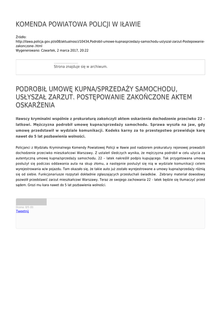 KOMENDA POWIATOWA POLICJI W IŁAWIE Źródło: http://ilawa.policja.gov.pl/o08/aktualnosci/10434,Podrobil-umowe-kupnasprzedazy-samochodu-uslyszal-zarzut-Postepowaniezakonczone-.html Wygenerowano: Czwartek, 2 marca 2017, 20:22 Strona znajduje się w archiwum. PODROBIŁ UMOWĘ KUPNA/SPRZEDAŻY SAMOCHODU, USŁYSZAŁ ZARZUT. POSTĘPOWANIE ZAKOŃCZONE AKTEM OSKARŻENIA Iławscy kryminalni wspólnie z prokuraturą zakończyli aktem oskarżenia dochodzenie przeciwko 22 – latkowi. Mężczyzna podrobił umowę kupna/sprzedaży samochodu. Sprawa wyszła na jaw, gdy umowę przedstawił w wydziale komunikacji. Kodeks karny za to przestępstwo przewiduje karę nawet do 5 lat pozbawienia wolności. Policjanci z Wydziału Kryminalnego Komendy Powiatowej Policji w Iławie pod nadzorem prokuratury rejonowej prowadzili dochodzenie przeciwko mieszkańcowi Warszawy. Z ustaleń śledczych wynika, że mężczyzna podrobił w celu użycia za autentyczną umowę kupna/sprzedaży samochodu. 22 – latek nakreślił podpis kupującego. Tak przygotowana umową posłużył się podczas oddawania auta na skup złomu, a następnie posłużył się nią w wydziale komunikacji celem wyrejestrowania w/w pojazdu. Tam okazało się, że takie auto już zostało wyrejestrowane a umowy kupna/sprzedaży różnią się od siebie. Funkcjonariusze rozpytali dokładnie zgłaszających przesłuchali świadków. Zebrany materiał dowodowy pozwolił przedstawić zarzut mieszkańcowi Warszawy. Teraz ze swojego zachowania 22 - latek będzie się tłumaczyć przed sądem. Grozi mu kara nawet do 5 lat pozbawienia wolności. Ocena: 0/5 (0) Tweetnij
