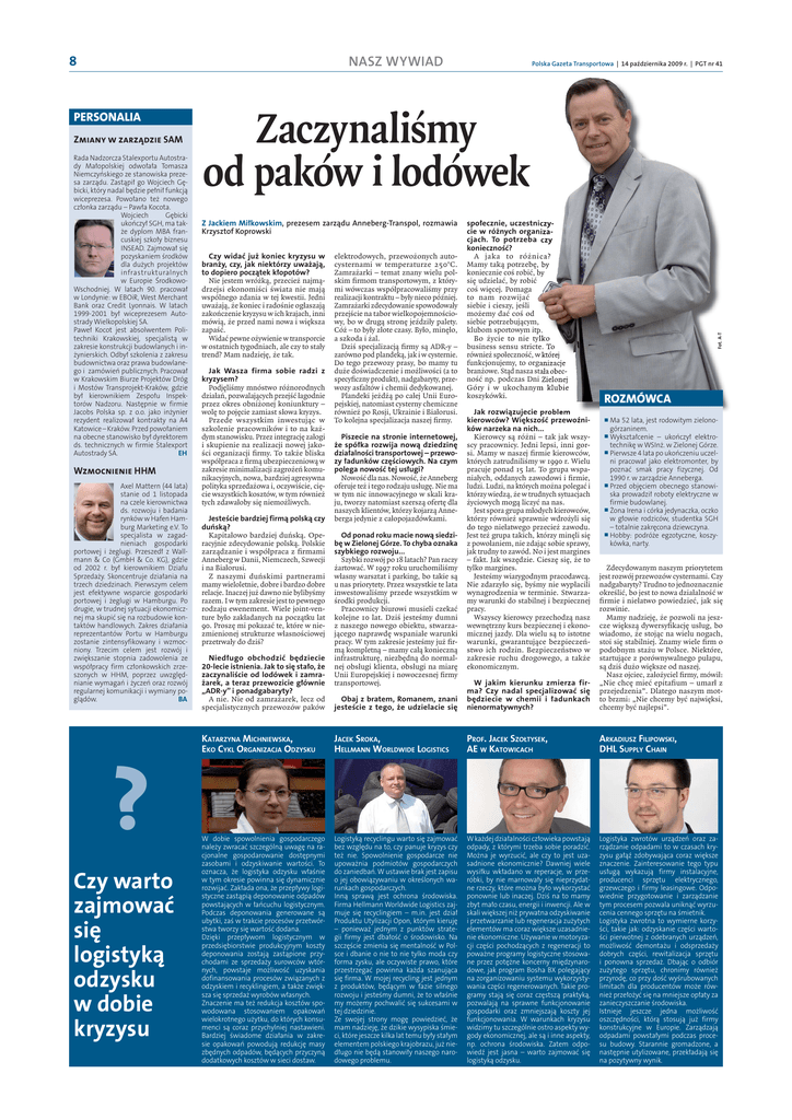 8 NASZ WYWIAD Zmiany w zarządzie SAM Rada Nadzorcza Stalexportu Autostrady Małopolskiej odwołała Tomasza Niemczyńskiego ze stanowiska prezesa zarządu. Zastąpił go Wojciech Gębicki, który nadal będzie pełnił funkcją wiceprezesa. Powołano też nowego członka zarządu – Pawła Kocota. Wojciech Gębicki ukończył SGH, ma także dyplom MBA francuskiej szkoły biznesu INSEAD. Zajmował się pozyskaniem środków dla dużych projektów infrastrukturalnych w Europie ŚrodkowoWschodniej. W latach 90. pracował w Londynie: w EBOiR, West Merchant Bank oraz Credit Lyonnais. W latach 1999-2001 był wiceprezesem Autostrady Wielkopolskiej SA. Paweł Kocot jest absolwentem Politechniki Krakowskiej, specjalistą w zakresie konstrukcji budowlanych i inżynierskich. Odbył szkolenia z zakresu budownictwa oraz prawa budowlanego i zamówień publicznych. Pracował w Krakowskim Biurze Projektów Dróg i Mostów Transprojekt-Kraków, gdzie był kierownikiem Zespołu Inspektorów Nadzoru. Następnie w firmie Jacobs Polska sp. z o.o. jako inżynier rezydent realizował kontrakty na A4 Katowice – Kraków. Przed powołaniem na obecne stanowisko był dyrektorem ds. technicznych w firmie Stalexport Autostrady SA. EH Wzmocnienie HHM Axel Mattern (44 lata) stanie od 1 listopada na czele kierownictwa ds. rozwoju i badania rynków w Hafen Hamburg Marketing e.V. To specjalista w zagadnieniach gospodarki portowej i żeglugi. Przeszedł z Wallmann & Co (GmbH & Co. KG), gdzie od 2002 r. był kierownikiem Działu Sprzedaży. Skoncentruje działania na trzech dziedzinach. Pierwszym celem jest efektywne wsparcie gospodarki portowej i żeglugi w Hamburgu. Po drugie, w trudnej sytuacji ekonomicznej ma skupić się na rozbudowie kontaktów handlowych. Zakres działania reprezentantów Portu w Hamburgu zostanie zintensyfikowany i wzmocniony. Trzecim celem jest rozwój i zwiększanie stopnia zadowolenia ze współpracy firm członkowskich zrzeszonych w HHM, poprzez uwzględnianie wymagań i życzeń oraz rozwój regularnej komunikacji i wymiany poglądów. BA Zaczynaliśmy od paków i lodówek Z Jackiem Miłkowskim, prezesem zarządu Anneberg-Transpol, rozmawia Krzysztof Koprowski Czy widać już koniec kryzysu w branży, czy, jak niektórzy uważają, to dopiero początek kłopotów? Nie jestem wróżką, przecież najmądrzejsi ekonomiści świata nie mają wspólnego zdania w tej kwestii. Jedni uważają, że koniec i radośnie ogłaszają zakończenie kryzysu w ich krajach, inni mówią, że przed nami nowa i większa zapaść. Widać pewne ożywienie w transporcie w ostatnich tygodniach, ale czy to stały trend? Mam nadzieję, że tak. Jak Wasza firma sobie radzi z kryzysem? Podjęliśmy mnóstwo różnorodnych działań, pozwalających przejść łagodnie przez okres obniżonej koniunktury – wolę to pojęcie zamiast słowa kryzys. Przede wszystkim inwestując w szkolenie pracowników i to na każdym stanowisku. Przez integrację załogi i skupienie na realizacji nowej jakości organizacji firmy. To także bliska współpraca z firmą ubezpieczeniową w zakresie minimalizacji zagrożeń komunikacyjnych, nowa, bardziej agresywna polityka sprzedażowa i, oczywiście, cięcie wszystkich kosztów, w tym również tych zdawałoby się niemożliwych. Jesteście bardziej firmą polską czy duńską? Kapitałowo bardziej duńską. Operacyjnie zdecydowanie polską. Polskie zarządzanie i współpraca z firmami Anneberg w Danii, Niemczech, Szwecji i na Białorusi. Z naszymi duńskimi partnerami mamy wieloletnie, dobre i bardzo dobre relacje. Inaczej już dawno nie bylibyśmy razem. I w tym zakresie jest to pewnego rodzaju ewenement. Wiele joint-venture było zakładanych na początku lat 90. Proszę mi pokazać te, które w niezmienionej strukturze własnościowej przetrwały do dziś? elektrodowych, przewożonych autocysternami w temperaturze 250°C. Zamrażarki – temat znany wielu polskim firmom transportowym, z którymi wówczas współpracowaliśmy przy realizacji kontraktu – były nieco później. Zamrażarki zdecydowanie spowodowały przejście na tabor wielkopojemnościowy, bo w drugą stronę jeździły palety. Cóż – to były złote czasy. Było, minęło, a szkoda i żal. Dziś specjalizacją firmy są ADR-y – zarówno pod plandeką, jak i w cysternie. Do tego przewozy prasy, bo mamy tu duże doświadczenie i możliwości (a to specyficzny produkt), nadgabaryty, przewozy asfaltów i chemii dedykowanej. Plandeki jeżdżą po całej Unii Europejskiej, natomiast cysterny chemiczne również po Rosji, Ukrainie i Białorusi. To kolejna specjalizacja naszej firmy. Piszecie na stronie internetowej, że spółka rozwija nową dziedzinę działalności transportowej – przewozy ładunków częściowych. Na czym polega nowość tej usługi? Nowość dla nas. Nowość, że Anneberg oferuje też i tego rodzaju usługę. Nie ma w tym nic innowacyjnego w skali kraju, tworzy natomiast szerszą ofertę dla naszych klientów, którzy kojarzą Anneberga jedynie z całopojazdówkami. Od ponad roku macie nową siedzibę w Zielonej Górze. To chyba oznaka szybkiego rozwoju... Szybki rozwój po 18 latach? Pan raczy żartować. W 1997 roku uruchomiliśmy własny warsztat i parking, bo takie są u nas priorytety. Przez wszystkie te lata inwestowaliśmy przede wszystkim w środki produkcji. Pracownicy biurowi musieli czekać kolejne 10 lat. Dziś jesteśmy dumni z naszego nowego obiektu, stwarzającego naprawdę wspaniałe warunki pracy. W tym zakresie jesteśmy już firmą kompletną – mamy całą konieczną infrastrukturę, niezbędną do normalnej obsługi klienta, obsługi na miarę Unii Europejskiej i nowoczesnej firmy transportowej. społecznie, uczestniczycie w różnych organizacjach. To potrzeba czy konieczność? A jaka to różnica? Mamy taką potrzebę, by koniecznie coś robić, by się udzielać, by robić coś więcej. Pomaga to nam rozwijać siebie i cieszy, jeśli możemy dać coś od siebie potrzeb