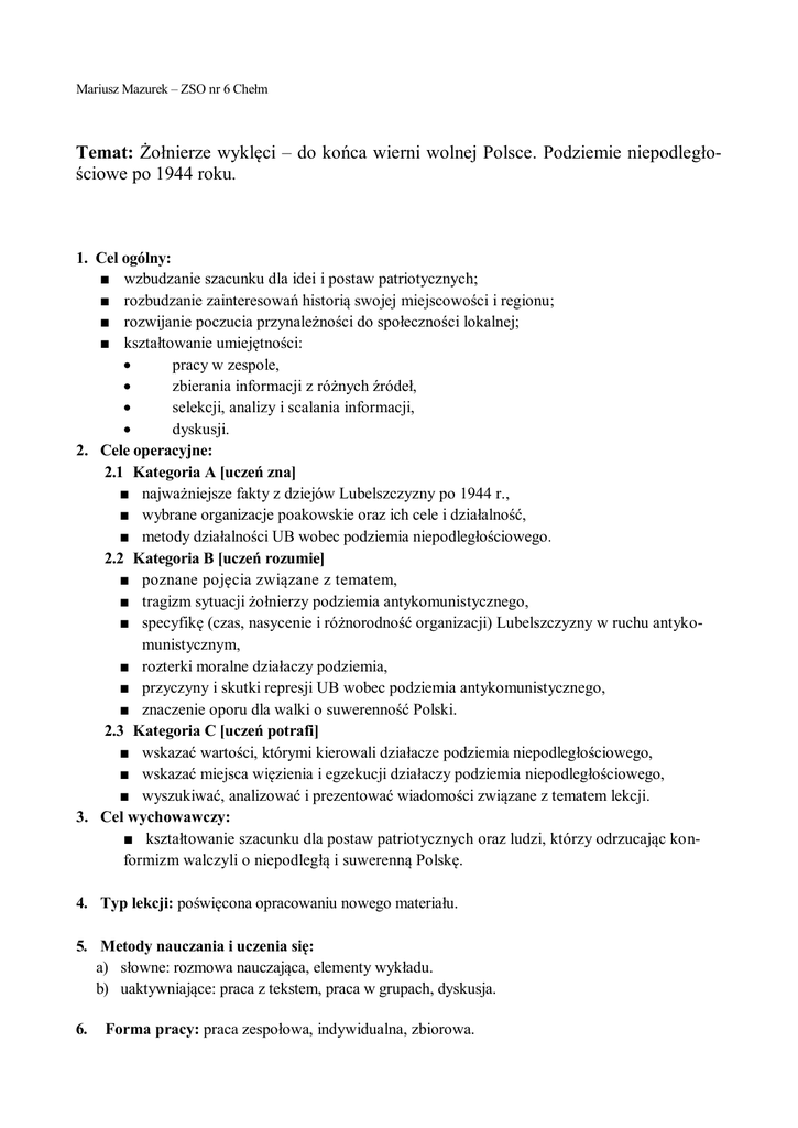 Mariusz Mazurek – ZSO nr 6 Chełm Temat: Żołnierze wyklęci – do końca wierni wolnej Polsce. Podziemie niepodległościowe po 1944 roku. 1. Cel ogólny: ■ wzbudzanie szacunku dla idei i postaw patriotycznych; ■ rozbudzanie zainteresowań historią swojej miejscowości i regionu; ■ rozwijanie poczucia przynależności do społeczności lokalnej; ■ kształtowanie umiejętności: pracy w zespole, zbierania informacji z różnych źródeł, selekcji, analizy i scalania informacji, dyskusji. 2. Cele operacyjne: 2.1 Kategoria A [uczeń zna] ■ najważniejsze fakty z dziejów Lubelszczyzny po 1944 r., ■ wybrane organizacje poakowskie oraz ich cele i działalność, ■ metody działalności UB wobec podziemia niepodległościowego. 2.2 Kategoria B [uczeń rozumie] ■ poznane pojęcia związane z tematem, ■ tragizm sytuacji żołnierzy podziemia antykomunistycznego, ■ specyfikę (czas, nasycenie i różnorodność organizacji) Lubelszczyzny w ruchu antykomunistycznym, ■ rozterki moralne działaczy podziemia, ■ przyczyny i skutki represji UB wobec podziemia antykomunistycznego, ■ znaczenie oporu dla walki o suwerenność Polski. 2.3 Kategoria C [uczeń potrafi] ■ wskazać wartości, którymi kierowali działacze podziemia niepodległościowego, ■ wskazać miejsca więzienia i egzekucji działaczy podziemia niepodległościowego, ■ wyszukiwać, analizować i prezentować wiadomości związane z tematem lekcji. 3. Cel wychowawczy: ■ kształtowanie szacunku dla postaw patriotycznych oraz ludzi, którzy odrzucając konformizm walczyli o niepodległą i suwerenną Polskę. 4. Typ lekcji: poświęcona opracowaniu nowego materiału. 5. Metody nauczania i uczenia się: a) słowne: rozmowa nauczająca, elementy wykładu. b) uaktywniające: praca z tekstem, praca w grupach, dyskusja. 6. Forma pracy: praca zespołowa, indywidualna, zbiorowa. 7. Środki dydaktyczne: ■ Nagrania: http://www.youtube.com/watch?v=NqqjL1YesbE (Atlas polskiego podziemia niepodległościowego 1944 – 1956; autor: Radio Szczecin) http://www.youtube.com/watch?feature=player_embedded&v=6B9I3nzi0Fo#! (De Press – Myśmy rebelianci) prystupa_reformacka.mp3; kowalczuk_reformacka.mp3 – nagrania pochodzą ze zbiorów Muzeum Chełmskiego film: „175/32” ■ Atlas polskiego podziemia niepodległościowego 1944 – 1956, Warszawa – Lublin 2007 ■ Komputer i projektor ■ Materiały pomocnicze ■ Biogramy E. Fieldorfa, W. Pileckiego, D. Siedzikówny: http://pl.wikipedia.org/wiki/Witold_Pilecki http://pl.wikipedia.org/wiki/Danuta_Siedzikówna http://pl.wikipedia.org/wiki/Emil_Fieldorf 7. Literatura merytoryczna dla nauczyciela (wybór): ■ Szubarczyk P., „Powiedzcie mojej babci, że zachowałam się jak trzeba”… Danuta Siedzikówna „Inka” (*3 IX 1928 † 28 VIII 1946), Warszawa 2008, IPN ■ Cyra A., Wysocki W., Rotmistrz Witold Pilecki, Warszawa 1997 ■ Pawłowicz J., Rotmistrz Witold Pilecki 1901 – 1948, Warszawa 2008 ■ Generał August Emil Fieldorf „Nil”, wybór i opracowanie Wiesława Młynarczyk, Monika Koszyńska, Warszawa 2009, (seria „Materiały edukacyjne” IPN, t. 4) ■ http://www.pilecki.ipn.gov.pl ■ http://fieldorf.pl ■ http://www.inka.witryna.info/ 8. Komentarz: Scenariusz lekcji przeznaczony jest dla klas pierwszych szkół ponadgimnazjalnych, można go również wykorzystać na zajęciach pozalekcyjnych w klasach trzecich gimnazjum. Konspekt nie jest napisany pod kątem konkretnego podręcznika, nie odwołuje się też do tekstów jednego z nich. Autorzy podręczników różną ilość miejsca poświęcają kwestii podziemia niepodległościowego lat 1944 – 56, stąd może zaistnieć potrzeba sięgnięcia do tekstów dodatkowych (pomocniczych). Konspekt zakłada, że uczniowie znają zmiany ustrojowe, polityczne i społeczne, które zaszły w powojennej Polsce oraz cele i działalność władz komunistycznych, a także rozumieją sytuację w jakiej znalazły się władze Polski Podziemnej i szeregowi żołnierze podziemia. 9. Proponowany przebieg lekcji: Czynności porządkowe – uczniowie na początku lekcji zajmują miejsca zgodnie z podziałem na grupy. Lekcję zaczynamy od obejrzenia nagrania Atlas polskiego podziemia niepodległościowego 1944 – 1956 (autor: Radio Szczecin). Następnie pytamy uczniów: Jaka była sytuacja polityczna na wyzwolonych spod okupacji niemieckiej ziemiach polskich? Jakimi motywami kierował się generał Okulicki wydając rozkaz rozwiązujący AK? Jakie zadania stawiał przed żołnierzami podziemia poakowskiego? Prowadzący koryguje ewentualne nieścisłości w wypowiedzi uczniów i uzupełnia je. Następnie wyjaśnia temat zajęć i przedstawia ich cele. Rozdaje także materiały pomocnicze potrzebne w toku lekcji. Następnie w formie krótkiego, syntetycznego wykładu przedstawia organizacje antykomunistyczne aktywnie działające pod koniec wojny na ziemiach polskich, ze szczególnym uwzględnieniem Lubelszczyzny i jej specyfiki. W kolejnym etapie polecamy uczniom zapoznanie się z biogramami A. Fieldorfa, W. Pileckiego i D. Siedzikówny (mogą to być materiały dołączone do niniejszego konspektu lub biogramy z Wikipedii), by mogli dokonać charakterystyki postaw tych bohaterów podziemia niepodległościowego. Uczniowie powinni wskazać również pewną wspólną formację patriotyczną wynikającą ze wspólnoty wychowania i wartości. Nauczyciel rozdaje grupom „Atlas polskiego podziemia niepodległościowego 1944-1956” (lub kserokopie wybranych stron). Istnieje możliwość zróżnicowania przekazanych grupom informacji w przypadku wykorzystania kserokopii i wzajemnego uzupełniania informacji w trakcie prezentacji wyników prac grup. Grupy pracują nad zagadnieniami: Jakie organizacje działały na Lubelszczyźnie? Jaka była ich liczebność? Jak oceniają szanse zwycięstwa podziemia niepodległościowego? Co zdecydowało o podjęciu tej walki? Jakich efektów się spodziewano? Jakie wartości przyśw
