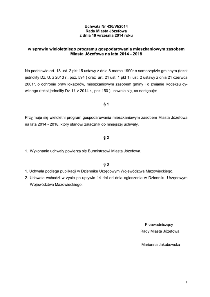 Uchwała Nr 436/VI/2014 Rady Miasta Józefowa z dnia 19 września 2014 roku w sprawie wieloletniego programu gospodarowania mieszkaniowym zasobem Miasta Józefowa na lata 2014 - 2018 Na podstawie art. 18 ust. 2 pkt 15 ustawy z dnia 8 marca 1990r o samorządzie gminnym (tekst jednolity Dz. U. z 2013 r., poz. 594 ) oraz art. 21 ust. 1 pkt 1 i ust. 2 ustawy z dnia 21 czerwca 2001r. o ochronie praw lokatorów, mieszkaniowym zasobem gminy i o zmianie Kodeksu cywilnego (tekst jednolity Dz. U. z 2014 r., poz.150 ) uchwala się, co następuje: §1 Przyjmuje się wieloletni program gospodarowania mieszkaniowym zasobem Miasta Józefowa na lata 2014 - 2018, który stanowi załącznik do niniejszej uchwały. §2 1. Wykonanie uchwały powierza się Burmistrzowi Miasta Józefowa. §3 1. Uchwała podlega publikacji w Dzienniku Urzędowym Województwa Mazowieckiego. 2. Uchwała wchodzi w życie po upływie 14 dni od dnia ogłoszenia w Dzienniku Urzędowym Województwa Mazowieckiego. Przewodniczący Rady Miasta Józefowa Marianna Jakubowska 1 UZASADNIENIE do uchwały Rady Miasta Józefowa w sprawie wieloletniego programu gospodarowania mieszkaniowym zasobem Miasta Józefowa na lata 2014-2018 Ustawa z dnia 21 czerwca 2001r. o ochronie praw lokatorów, mieszkaniowym zasobie gminy i o zmianie Kodeksu Cywilnego (tekst jednolity Dz. U. z 2014 r., poz. 150 ) nałożyła na rady gmin obowiązek uchwalenia wieloletniego programu gospodarowania mieszkaniowym zasobem gminy. Zgodnie z ustawą program powinien być opracowany, na co najmniej 5 kolejnych lat i powinien obejmować następujący zakres tematyczny: 1) prognozę wielkości oraz stanu technicznego mieszkaniowego zasobu gminy w kolejnych latach, 2) analizę potrzeb oraz plan remontów i modernizacji budynków mieszkalnych z podziałem na kolejne lata, 3) planowaną sprzedaż lokali w kolejnych latach, 4) zasady polityki czynszowej, 5) sposób i zasady zarządzania lokalami i budynkami wchodzącymi w skład mieszkaniowego zasobu gminy oraz przewidywane zmiany w zakresie zarządzania tym zasobem, 6) źródła finansowania gospodarki mieszkaniowej w kolejnych latach, 7) wysokość wydatków w kolejnych latach na mieszkaniowy zasób gminy, 8) opis innych działań mających na celu poprawę wykorzystania i racjonalizację gospodarowania mieszkaniowym zasobem gminy. W związku z upływem okresu obowiązywania uchwały Rady Miasta Józefowa 189/V/08 z dnia 4 grudnia 2008 r. w sprawie programu gospodarowania mieszkaniowym zasobem Miasta Józefowa na lata 2009 – 2013 wystąpiła konieczność opracowania programu na kolejne 5 lat. Przewodniczący Rady Miasta Józefowa Marianna Jakubowska 2 Załącznik do Uchwały Nr 436/VI/2014 Rady Miasta Józefowa z dnia 19 września 2014 roku w sprawie: wieloletniego programu gospodarowania mieszkaniowym zasobem Miasta Józefowa na lata 2014 - 2018. Opracowanie „Wieloletniego programu gospodarowania mieszkaniowy zasobem Miasta Józefowa” stanowi realizację obowiązku, który nakłada ustawa z dnia z dnia 21 czerwca 2001r. o ochronie praw lokatorów, mieszkaniowym zasobem gminy i o zmianie Kodeksu cywilnego (tekst jednolity Dz. U. z 2014 r., poz.150 ). Zgodnie z art. 4 ww. ustawy tworzenie warunków do zaspakajania potrzeb mieszkaniowych gminy należy do podstawowych zadań własnych gminy, która na zasadach i w przypadkach przewidzianych w tej ustawie zapewnia lokale socjalne i lokale zamienne a także zaspakaja potrzeby mieszkaniowe gospodarstw domowych o niskich dochodach. Zasady wynajmowania lokali z mieszkaniowego zasobu Gminy Miasta Józefowa uregulowane są w odrębnej uchwale Rady Miasta Józefowa nr 352/V/2010 z dnia 16 września 2010 r. Pomoc mieszkaniowa zgodnie z powyższą uchwałą adresowana jest do następujących członków wspólnoty mieszkaniowej: • osób, które utraciły mieszkanie w wyniku zdarzeń losowych: klęski żywiołowej, katastrofy lub pożaru, • gospodarstw domowych, którym Miasto jest zobowiązane dostarczyć lokal socjalny na mocy wyroku sądu; • osób zamieszkujących w lokalach usytuowanych w budynkach, które wymagają opróżnienia w związku z koniecznością rozbiórki lub remontu na podstawie decyzji organu nadzoru budowlanego, bądź zamieszkujących w budynkach przeznaczonych do rozbiórki ze względu na planowane inwestycje miejskie, • gospodarstw domowych o niskich dochodach lub pozostających w trudnych warunkach mieszkaniowych. Ponadto na lokale socjalne oczekują osoby, których sytuacja zdrowotna, rodzinna czy społeczna jest wyjątkowo trudna. Lokale socjalne wynajmowane są na czas określony, nie dłuższy niż 1 rok. Istotnym problemem Józefowa, mającym wpływ na politykę mieszkaniową jest wzrastająca ilość osób o niskich dochodach. W związku z powyższym istnieje potrzeba udzielania pomocy mieszkaniowej szerszej grupie osób, w tym obowiązek dostarczania większej liczby lokali socjalnych. 3 PODSTAWA PRAWNA OPRACOWANIA Wieloletni Program Gospodarowania Mieszkaniowym Zasobem Gminy Miasta Józefowa jest podstawowym dokumentem obejmującym działania operacyjne pozwalające na efektywne gospodarowanie mieszkaniowym zasobem Gminy. Dokument opracowywany jest na 5 najbliższych lat. Zgodnie z art. 21 Ustawy o ochronie praw lokatorów, mieszkaniowym zasobie gminy i o zmianie Kodeksu cywilnego z dnia 21 czerwca 2001 r. (t.j. Dz. U. z 2014 r., poz. 150), dokument ten obejmuje następujące zagadnienia: 1. prognozę zawierającą wielkość oraz stan techniczny mieszkaniowego zasobu gminy, uwzględniając jednocześnie podział na lokale socjalne i mieszkalne, 2. analizę potrzeb remontowych i modernizacji budynków, która wynika z ich stanu technicznego, 3. planowaną sprzedaż lokali i nieruchomości pozyskanych po planowych rozbiórkach budynków, 4. zasady polityki czynszowej, 5. zasady zarządzania mieszkaniowym zasobem gminy, 6. źródła finansowania gospodarki mieszkaniowej gminy, 7. wysokość wydatków gospodarki mieszkaniowej, 8. opis innych dzia