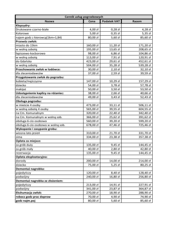 Nazwa Cennik usług pogrzebowych Cena Podatek VAT Klepsydry: Drukowane czarno-białe Kolorowe najem godz z kierowcą(1km=1,84) Przewóz zwłok: miasto do 15km w wolną sobotę łapiszewo-kocborowo w wolną sobotę do Gdańska w wolną sobotę Przechowanie zwłok w lodówce: dla zleceniodawców Przygotowanie zwłok do pogrzebu: kobieta/mężczyzna dziecko makijaż Udostępnienie kaplicy na różaniec: dla zleceniodawców Obsługa pogrzebu: w mieście 4 osoby w wolną sobotę 4 osoby na Cm. Komunalnym na Cm. Komunalnym w wolną sob. obsługa 6-cio osobowa obsługa 6-cio osobowa w wolną sob. Wykopanie i zasypanie grobu: wiosna lato jesień zima Opłata za miejsce: za grób duży za grób mały rezerwacja Opłata eksploatacyjna: dorosły dziecko Demontaż nagrobka: pojedyńczy podwójny Demontaż nagrobka ze złożeniem: pojedyńczy podwójny Ekshumacja zwłok: robocz godz prac doprow godz najm.poj Razem 4,00 zł 5,00 zł 80,00 zł 0,28 zł 0,35 zł 5,60 zł 4,28 zł 5,35 zł 85,60 zł 160,00 zł 195,00 zł 98,00 zł 113,00 zł 423,00 zł 504,00 zł 30,00 zł 37,00 zł 11,20 zł 13,65 zł 6,86 zł 7,91 zł 29,61 zł 35,28 zł 2,10 zł 2,59 zł 171,20 zł 208,65 zł 104,86 zł 120,91 zł 452,61 zł 539,28 zł 32,10 zł 39,59 zł 147,00 zł 54,00 zł 50,00 zł 38,00 zł 49,00 zł 10,29 zł 3,78 zł 3,50 zł 2,66 zł 3,43 zł 157,29 zł 57,78 zł 53,50 zł 40,66 zł 52,43 zł 473,00 zł 565,00 zł 320,00 zł 366,00 zł 560,00 zł 678,00 zł 33,11 zł 39,55 zł 22,40 zł 25,62 zł 39,20 zł 47,46 zł 506,11 zł 604,55 zł 342,40 zł 391,62 zł 599,20 zł 725,46 zł 310,00 zł 334,00 zł 21,70 zł 23,38 zł 331,70 zł 357,38 zł 135,00 zł 40,00 zł 135,00 zł 9,45 zł 2,80 zł 9,45 zł 144,45 zł 42,80 zł 144,45 zł 200,00 zł 75,00 zł 14,00 zł 5,25 zł 214,00 zł 80,25 zł 120,00 zł 240,00 zł 8,40 zł 16,80 zł 128,40 zł 256,80 zł 213,00 zł 341,00 zł 270,00 zł 70,00 zł 80,00 zł 14,91 zł 23,87 zł 18,90 zł 4,90 zł 5,60 zł 227,91 zł 364,87 zł 288,90 zł 74,90 zł 85,60 zł