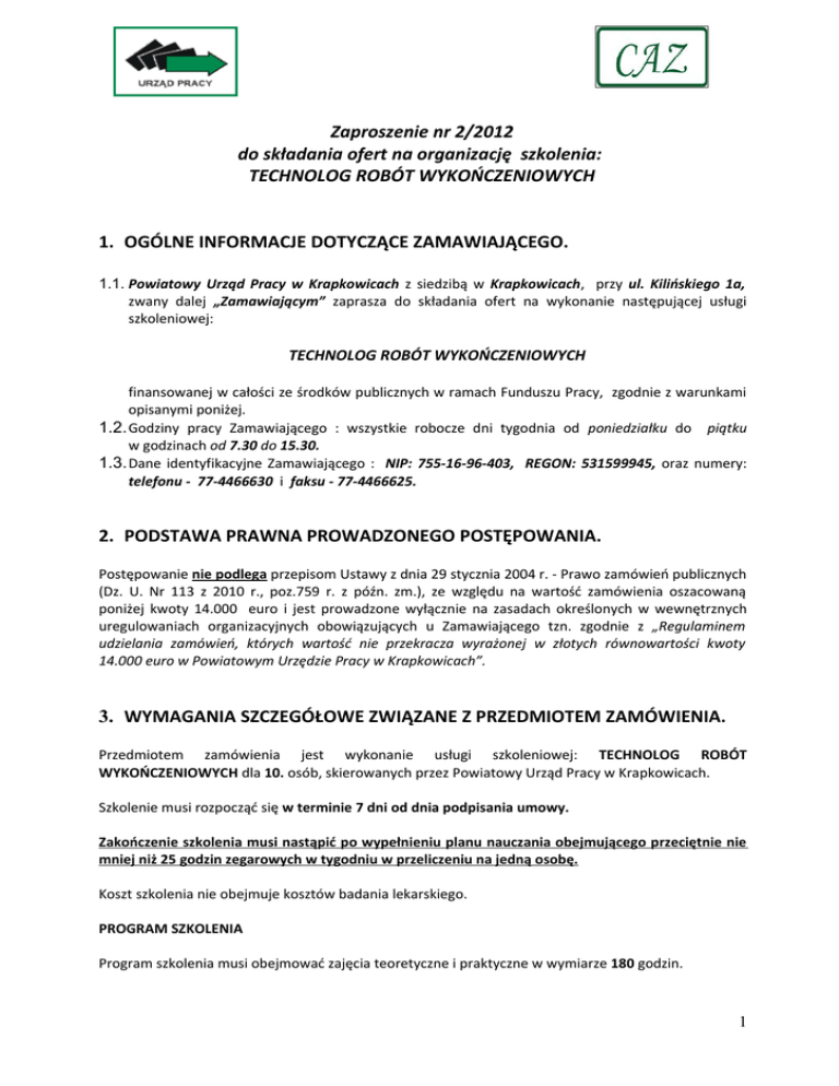 Zaproszenie nr 2/2012 do składania ofert na organizację szkolenia: TECHNOLOG ROBÓT WYKOŃCZENIOWYCH 1. OGÓLNE INFORMACJE DOTYCZĄCE ZAMAWIAJĄCEGO. 1.1. Powiatowy Urząd Pracy w Krapkowicach z siedzibą w Krapkowicach, przy ul. Kilińskiego 1a, zwany dalej „Zamawiającym” zaprasza do składania ofert na wykonanie następującej usługi szkoleniowej: TECHNOLOG ROBÓT WYKOŃCZENIOWYCH finansowanej w całości ze środków publicznych w ramach Funduszu Pracy, zgodnie z warunkami opisanymi poniżej. 1.2. Godziny pracy Zamawiającego : wszystkie robocze dni tygodnia od poniedziałku do piątku w godzinach od 7.30 do 15.30. 1.3. Dane identyfikacyjne Zamawiającego : NIP: 755-16-96-403, REGON: 531599945, oraz numery: telefonu - 77-4466630 i faksu - 77-4466625. 2. PODSTAWA PRAWNA PROWADZONEGO POSTĘPOWANIA. Postępowanie nie podlega przepisom Ustawy z dnia 29 stycznia 2004 r. - Prawo zamówień publicznych (Dz. U. Nr 113 z 2010 r., poz.759 r. z późn. zm.), ze względu na wartość zamówienia oszacowaną poniżej kwoty 14.000 euro i jest prowadzone wyłącznie na zasadach określonych w wewnętrznych uregulowaniach organizacyjnych obowiązujących u Zamawiającego tzn. zgodnie z „Regulaminem udzielania zamówień, których wartość nie przekracza wyrażonej w złotych równowartości kwoty 14.000 euro w Powiatowym Urzędzie Pracy w Krapkowicach”. 3. WYMAGANIA SZCZEGÓŁOWE ZWIĄZANE Z PRZEDMIOTEM ZAMÓWIENIA. Przedmiotem zamówienia jest wykonanie usługi szkoleniowej: TECHNOLOG ROBÓT WYKOŃCZENIOWYCH dla 10. osób, skierowanych przez Powiatowy Urząd Pracy w Krapkowicach. Szkolenie musi rozpocząć się w terminie 7 dni od dnia podpisania umowy. Zakończenie szkolenia musi nastąpić po wypełnieniu planu nauczania obejmującego przeciętnie nie mniej niż 25 godzin zegarowych w tygodniu w przeliczeniu na jedną osobę. Koszt szkolenia nie obejmuje kosztów badania lekarskiego. PROGRAM SZKOLENIA Program szkolenia musi obejmować zajęcia teoretyczne i praktyczne w wymiarze 180 godzin. 1 Zajęcia teoretyczne: Zajęcia teoretyczne muszą obejmować 26 godzin programu szkolenia. Godzina zajęć teoretycznych oznacza 45 minut. W ramach zajęć teoretycznych uczestnicy szkolenia muszą nabyć wiedzę co najmniej w następującym zakresie: a) zasady bhp na stanowisku pracy technologa robót wykończeniowych, b) technologia prac, c) dokumentacja prac technologa robót wykończeniowych w tym zapoznanie z rysunkiem zawodowym, d) materiałoznawstwo, Zajęcia praktyczne: Zajęcia praktyczne muszą obejmować 154 godziny programu szkolenia. Godzina zajęć praktycznych oznacza 60 minut. Zajęcia praktyczne będą realizowane na obiekcie użyteczności publicznej wskazanym przez Zamawiającego znajdującym się na terenie Krapkowic. W ramach zajęć praktycznych uczestnicy szkolenia, w celu uzyskania niezbędnych umiejętności do wykonywania pracy na stanowisku technologa robót wykończeniowych, będą wykonywać następujące czynności: a) usunięcie farby zalegającej na ścianach i sufitach, b) przygotowanie powierzchni pod instalację elektryczną, tzn: wykuwanie bruzd i przygotowanie otworów pod puszki w ścianach i sufitach, c) równanie ścian, filarów, podciągów, słupów tynkiem cementowo-wapiennym, d) uzupełnianie gipsem otworów po wykonaniu instalacji elektrycznej, e) wykonanie gładzi na ścianach i sufitach po uprzednim zamontowaniu niezbędnych narożników f) przygotowanie podłoża pod malowanie, g) szlifowanie, naniesienie warstwy gruntującej, h) malowanie ścian i sufitów, i) usunięcie z podłóg istniejącej nawierzchni wykonanej z wykładziny lub płytek PCV, j) przygotowanie nawierzchni do ułożenia paneli podłogowych, k) wykonanie nowej nawierzchni podłóg poprzez ułożenie paneli podłogowych i montaż listew przypodłogowych. Materiały i sprzęt: Wykonawca zobowiązuje się zapewnić w odpowiedniej ilości i jakości materiały, produkty, sprzęt itp. niezbędne do prawidłowej realizacji zamówienia. Przykładowe materiały, które mają zostać dostarczone kursantom w ilości i jakości zapewniającej prawidłową realizację zajęć praktycznych przeprowadzonych na wskazanym przez Zamawiającego obiekcie użyteczności publicznej: Tabela nr 1 L. p. Nazwa materiału Uwagi 1. Gładź gipsowa W ilości i jakości zależnej od potrzeb. 2. Narożniki perforowane W ilości i jakości zależnej od potrzeb 3. Farba emulsyjna – biała (typu Nobiles lub równoważna) W ilości i jakości zależnej od potrzeb. 2 4. W ilości i jakości zależnej od potrzeb. 5. Farba emulsyjna – kolor jesień 13 (typu Nobiles lub równoważna) Płyn do gruntowania 6. Tynk cementowo-wapienny W ilości i jakości zależnej od potrzeb. 7. Gips budowlany W ilości i jakości zależnej od potrzeb. 8. Folia do zabezpieczenia okien i drzwi W ilości i jakości zależnej od potrzeb. 9. Taśmy papierowe W ilości i jakości zależnej od potrzeb 10. Inne materiały niezbędne do prawidłowej realizacji zajęć praktycznych W ilości i jakości zależnej od potrzeb. W ilości i jakości zależnej od potrzeb. Łączna powierzchnia przeznaczona na realizację zajęć praktycznych w zakresie nabycia umiejętności malowania ścian wynosi ok. 250 m2. Łączna powierzchnia przeznaczona na realizację zajęć praktycznych w zakresie nabycia umiejętności malowania sufitów wynosi ok. 110 m2. Łączna powierzchnia przeznaczona na realizację zajęć praktycznych w zakresie nabycia umiejętności układania paneli podłogowych i montażu listew przypodłogowych wynosi ok. 110 m2 UWAGA: Materiały niezbędne do realizacji zajęć praktycznych w zakresie nabycia umiejętności układania paneli podłogowych i montażu listew przypodłogowych zostaną dostarczone przez Zamawiającego. Powyższy opis zawiera orientacyjne informacje na temat miejsca zajęć praktycznych. W trakcie realizacji zajęć praktycznych mogą wyniknąć dodatkowe czynności niezbędne do wykonania w celu zapewnienia pra