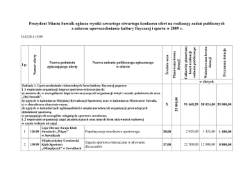 Prezydent Miasta Suwałk ogłasza wyniki czwartego otwartego konkursu ofert na realizację zadań publicznych z zakresu upowszechniania kultury fizycznej i sportu w 2009 r. Przyznana dotacja Wnioskowana kwota dotacji Całkowity planowany koszt realizacji zadania publicznego Nazwa zadania publicznego zgłoszonego w ofercie Planowana kwota dotacji Nazwa podmiotu zgłaszającego ofertę Średnia ocen Lp. Numer oferty O.4120-115/09 2 Międzyszkolny Uczniowski 130/09 Klub Sportowy „Olimpijczyk” w Suwałkach Zajęcia sportowo rekreacyjne w pływaniu dla uczniów 37,00 35 000,00 w złotych Zadanie 1. Upowszechnianie róŜnorodnych form kultury fizycznej poprzez: 1.1 wspieranie organizacji imprez sportowo-rekreacyjnych: a) masowych, w szczególności imprez towarzyszących organizacji świąt i rocznic państwowych oraz „Dni Suwałk”, b) ujętych w kalendarzu Miejskiej Rywalizacji Sportowej oraz w kalendarzu Mistrzostw Suwałk, c) o charakterze charytatywnym, X d) ujętych w kalendarzach ogólnopolskich i międzynarodowych organizacji prowadzących działalność sportową, e) propagujących szczególne osiągnięcia sportowe suwalczan, 1.2 wspieranie organizacji zajęć pozalekcyjnych oraz innych form aktywności ruchowej w czasie wolnym od zajęć Liga Obrony Kraju Klub 1 126/09 Strzelecki „Wigry” Popularyzacja strzelectwa sportowego 38,00 w Suwałkach 91 465,59 58 024,00 35 000,00 1 425,00 1 400,00 22 500,00 12 000,00 8 800,00 2 925,00 3 138/09 Automobilklub Suwalski Organizacja zawodów „Barbórka Suwalska 2009” 35,00 10 920,59 4 570,00 2 000,00 4 Ludowy Międzyszkolny 121/09 Uczniowski Klub Sportowy „Olimpik” w Suwałkach V Turniej zapaśniczy młodzików i młodziczek w zapasach w stylu wolnym o Puchar Naczelnika Wydziału Oświaty, Wychowania i Sportu Urzędu Miejskiego w Suwałkach 33,00 2 185,00 1 758,00 1 200,00 5 133/09 Klub Szachowy „JAVENA HAŃCZA” Upowszechnianie róŜnorodnych form kultury fizycznej poprzez wspieranie organizacji imprez sportowo rekreacyjnych [4 imprezy szachowe] 32,67 7 600,00 4 000,00 2 000,00 6 136/09 Powiatowy Szkolny Związek Sportowy w Suwałkach 32,33 9 371,00 8 371,00 7 000,00 7 Uczniowski Międzyszkolny 125/09 Klub Szachowy „JaćwieŜ” w Suwałkach 31,33 2 300,00 1 400,00 700,00 8 Ludowy Uczniowski Klub 131/09 Sportowy „Hańcza” w Suwałkach Organizacja Halowych Zawodów w Lekkiej Atletyce dla Szkół Podstawowych i Gimnazjów o Puchar Prezydenta Miasta Suwałk X edycja [2 imprezy] 29,33 2 100,00 1 500,00 1 200,00 9 Ludowy Uczniowski Klub 123/09 Sportowy „Hańcza” w Suwałkach Upowszechnianie róŜnorodnych form kultury fizycznej poprzez wspieranie organizacji imprez sportowo rekreacyjnych ujętych w kalendarzu Miejskiej Rywalizacji Sportowej [w tym Animator Sportu] 29,00 3 300,00 1 800,00 1 000,00 Jesienne biegi przełajowe z okazji Święta Niepodległości - 11 Listopada 2009 w Suwałkach 28,67 1 720,00 1 720,00 1 000,00 Wspieranie organizacji zajęć pozalekcyjnych w badmintonie 28,67 17 100,00 12 100,00 4 800,00 Miejskie Towarzystwo 10 127/09 Krzewienia Kultury Fizycznej w Suwałkach 11 132/09 Suwalski Klub Badmintona Organizacja 22 imprez sportowo-rekreacyjnych w ramach rywalizacji miejskiej i wojewódzkiej Organizacja zawodów szachowych w Suwałkach oraz zajęcia pozalekcyjne dla uczniów suwalskich szkół [4 imprezy] 13 14 Uczniowski Klub Sportowy „Orły” w Suwałkach Organizacja rozgrywek I Ligi Unihokeja Seniorów w sezonie 2009/2010 rundzie zimowo-wiosennej [2 imprezy] 28,00 1 144,00 780,00 700,00 Ludowy Uczniowski Klub 124/09 Sportowy „Hańcza” w Suwałkach Wspieranie organizacji zajęć pozalekcyjnych w piłce 28,00 ręcznej dziewcząt [6 turniejów] 2 300,00 2 100,00 1 500,00 Stowarzyszenie Lokalne Salezjańskiej Organizacji 137/09 Sportowej „SALOS” w Suwałkach Organizacja Mikołajkowego Turnieju Piłki NoŜnej Chłopców Organizacja Międzynarodowego Turnieju Tenisa Stołowego Organizacja Niepodległościowego Turnieju Piłki Siatkowej Dziewcząt i Koszykówki Chłopców 6 000,00 4 500,00 1 700,00 58 332,00 17 014,00 5 000,00 35,67 38 454,00 8 454,00 3 500,00 Regionalne Mistrzostwa w Warcabach Stupolowych 33,67 Osób Niepełnosprawnych 3 278,00 1 160,00 1 000,00 16 600,00 7 400,00 500,00 Zadanie 2. Upowszechnianie kultury fizycznej i rozwój sportu kwalifikowanego osób niepełnosprawnych poprzez: 2.1 wspieranie organizacji imprez sportowych i sportowo-rekreacyjnych, w tym integracyjnych, 2.2 wspieranie udziału osób niepełnosprawnych w krajowym i międzynarodowym współzawodnictwie sportowym, 2.3 wspieranie organizacji szkolenia zawodników niepełnosprawnych 1 Miejskie Towarzystwo 129/09 Krzewienia Kultury Fizycznej w Suwałkach 2 135/09 3 Miejskie Towarzystwo 128/09 Krzewienia Kultury Fizycznej w Suwałkach Klub Sportowy „Jaćwing” – Suwałki Suwałki, 12 października 2009 r. Organizacja XX Spartakiady Dzieci i MłodzieŜy Specjalnej Troski Organizacja zajęć sportowo-rekreacyjnych dla Ośrodka Terapii Ruchowej Osób III Wieku 27,00 X 24,00 5 000,00 12 134/09
