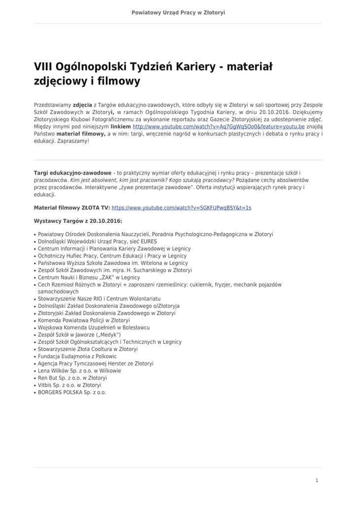 Powiatowy Urząd Pracy w Złotoryi VIII Ogólnopolski Tydzień Kariery - materiał zdjęciowy i filmowy Przedstawiamy zdjęcia z Targów edukacyjno-zawodowych, które odbyły się w Złotoryi w sali sportowej przy Zespole Szkół Zawodowych w Złotoryi, w ramach Ogólnopolskiego Tygodnia Kariery, w dniu 20.10.2016. Dziękujemy Złotoryjskiego Klubowi Fotograficznemu za wykonanie reportażu oraz Gazecie Złotoryjskiej za udostepnienie zdjęć. Między innymi pod niniejszym linkiem http://www.youtube.com/watch?v=Aq7GgWqSOo0&feature=youtu.be znajdą Państwo materiał filmowy, a w nim: targi, wręczenie nagród w konkursach plastycznych i debata o rynku pracy i edukacji. Zapraszamy! Targi edukacyjno-zawodowe – to praktyczny wymiar oferty edukacyjnej i rynku pracy – prezentacje szkół i pracodawców. Kim jest absolwent, kim jest pracownik? Kogo szukają pracodawcy? Pożądane cechy absolwentów przez pracodawców. Interaktywne „żywe prezentacje zawodowe”. Oferta instytucji wspierających rynek pracy i edukacji. Materiał filmowy ZŁOTA TV: https://www.youtube.com/watch?v=SGKFUPwqBSY&t=1s Wystawcy Targów z 20.10.2016: ● ● ● ● ● ● ● ● ● ● ● ● ● ● ● ● ● ● ● ● ● ● Powiatowy Ośrodek Doskonalenia Nauczycieli, Poradnia Psychologiczno-Pedagogiczna w Złotoryi Dolnośląski Wojewódzki Urząd Pracy, sieć EURES Centrum Informacji i Planowania Kariery Zawodowej w Legnicy Ochotniczy Hufiec Pracy, Centrum Edukacji i Pracy w Legnicy Państwowa Wyższa Szkoła Zawodowa im. Witelona w Legnicy Zespół Szkół Zawodowych im. mjra. H. Sucharskiego w Złotoryi Centrum Nauki i Biznesu „ŻAK” w Legnicy Cech Rzemiosł Różnych w Złotoryi + zaproszeni rzemieślnicy: cukiernik, fryzjer, mechanik pojazdów samochodowych Stowarzyszenie Nasze RIO i Centrum Wolontariatu Dolnośląski Zakład Doskonalenia Zawodowego o/Złotoryja Złotoryjski Zakład Doskonalenia Zawodowego w Złotoryi Komenda Powiatowa Policji w Złotoryi Wojskowa Komenda Uzupełnień w Bolesławcu Zespół Szkół w Jaworze („Medyk”) Zespół Szkół Ogólnokształcących i Technicznych w Legnicy Stowarzyszenie Złota Cooltura w Złotoryi Fundacja Eudajmonia z Polkowic Agencja Pracy Tymczasowej Herster ze Złotoryi Lena Wilków Sp. z o.o. w Wilkowie Ren But Sp. z o.o. w Złotoryi Vitbis Sp. z o.o. w Złotoryi BORGERS POLSKA Sp. z o.o. 1 Powiatowy Urząd Pracy w Złotoryi 2