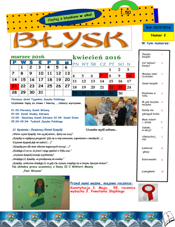 1,50 u! m w ok ie k s y ł b Czytaj z Rok 2015/2016 Numer 2 W tym numerze: Święto książki 1. Co? Gdzie? Kiedy? 2. Między nami Uczniami 3. Smak książki 3 Rozmowy w toku 4. Uczniowie łapią za słowa i tworzą ….chmury wyrazowe. M jak muzyka muzyka 5. 21.03-Pierwszy Dzień Wiosny Każdy ma 5. 07.04– Dzień Służby Zdrowia jakiegoś bzika marzec 2016 P W Ś 7 1 2 8 9 C 3 P 4 S 5 kwiecień 2016 N PN WT ŚR CZ PT SO N 6 10 11 12 13 1 2 3 4 14 15 16 17 18 19 20 11 21 22 23 24 25 26 27 18 5 12 6 13 7 14 8 15 9 16 10 17 19 20 21 22 23 24 28 29 30 31 26 27 28 29 30 25 Pierwszy dzień Tygodnia Języka Polskiego 10.04- Światowy Dzień Zdrowia 22.04– Dzień Ziemi Mam talent i.. piszę 25.04-29.04– Tydzień Języka Polskiego 23 kwietnia– Światowy Dzień Książki Uczniów myśli zebrane... „Warto czytać książki. One są jak mistrz , który nas uczy”. „Książka to najlepszy przyjaciel. Gdy się w niej zanurzam, zapominam o smutkach(…) 6. Szkoła w akcji! 7. Uśmiechnij się! 7. Łamacze 8. "Czytanie książek daje mi radość.(…)” "„Książka jest dla mnie zbiorem magicznych rzeczy(…)” „Dziękuję Ci za to, że jesteś i mogę spędzać z Tobą czas.” głowy „Czytanie książek rozwija wyobraźnię”. „Dziękuję Ci, książko, za przekazaną mi wiedzę.” Kolorowanki 9. Łamigłówki 10 . „Książko, serdecznie dziękuję Ci, że gdy Cię czytam, znajduję się w innym, lepszym świecie”. Na okładce praca uczennicy z klasy II C Wiktorii Masny „Pani Wiosna” Przed nami ważne, majowe rocznice: Konstytucja 3. Maja, 95. rocznica wybuchu 3. Powstania Śląskiego 1. . 2. Szkoła pełna talentów 8 marca klasy IV-VI wzięły udział w szalonym ,,Mam Talent’’ i zaprezentowały wiele zadziwiających, czasem zabawnych piosenek, skeczów, tańców i wierszy. Okazało się, że w naszej szkole jest naprawdę dużo utalentowanych dzieci. Jury miały bardzo trudne zadanie z dokonaniem wyboru zwycięzców. W ramach przerwy piątoklasistki pięknie zagrały na dzwonkach. W końcu wybrano zwycięską klasę, którą okazała się VIA, pokazując zabawny taniec z udziałem barwnych strojów i peruk. Widzowie podczas tego tańca klaskali najgłośniej. Myślę, że każdy z oglądających występy był zachwycony. Ja z chęcią obejrzałabym ,,Mam Talent’’ jeszcze raz. Hania Kurdziel klasa VI B Najmłodsi świętują pierwszy dzień wiosny wiosny Z okazji Pierwszego Dnia Wiosny klasa I b przygotowana przez panią K. Brzoza zorganizowała dla klas I – III teatrzyk kukiełkowy. Uczniowie świetnie się bawili oglądając przedstawienie oraz słuchając piosenek wykonanych przez uczniów z klasy I c. Później odbył się konkurs: wiedzy, sportowy oraz zabawy i pląsy. W tym dniu klasy wybrały się również na wiosenny spacer gdzie wspólnie pożegnali zimę paląc wcześniej przygotowaną marzannę. Wszystkim dopisywał dobry humor, gdyż świeciło piękne słońce. Pierwszy dzień wiosny spędziliśmy bardzo przyjemnie. Gminny Turniej Piłki Nożnej Nasze „złotka” 12 kwietnia 2016r. odbył się Gminny Turniej Piłki Nożnej dziewcząt. Udział w zawodach wzięło 6 szkół podstawowych. Drużyna z naszej szkoły zajęła I miejsce. Skład drużyny: Patrycja Gruszka, Tatarczyk Wiktoria, Kosek Wiktoria, Angelika Krentusz, Paulina Mędrak, Julia Łuksza, Emilia Knop, Emilia Witek, Nikola Urbaś, Patrycja Snoch, Natalia Adamiak, Jagoda Salamon. Królową strzelców została Wiktoria Tatarczyk uczennica klasy VI B. Zwycięzcom gratulujemy i życzymy dalszych sukcesów. Opiekę nad drużyną sprawowała pani Ewelina Kłosek. 3. 21 –22 kwietnia dziennikarki szkolnej gazetki „Błysk” przeprowadziły wśród uczniów dwie ankiety. Jedna dotyczyła dbania o przyrodę ,a druga pytała o to, czym jest dla uczniów patriotyzm? Wyniki ankiet są bardzo optymistyczne. Poświęcenie dla narodu. Obrona Ojczyzny. Odpowiednie zachowanie podczas śpiewanie hymnu. Jest miłością do Ojczyzny. Walka za kraj. Szacunek do państwa. Udział w wyborach. Sondę przeprowadziły: Karolina Potracka, Emilka Witek, Maja Kowalska, Patrycja Snoch, Wiktoria Tatarczyk, Angelika Krentusz. Wykres wykonały: Wiktoria Tatarczyk i Karolina Potracka. Szalona książka Jakiś czas temu byłam w bibliotece szkolnej i sięgnęłam po książkę pod tytułem ,, Tsatsiki i Mamuśka” Moni Linsson. Już okładka przyciągnęła moją uwagę. Taka szalona, a jednak ładna. Tsatsiki jest sympatycznym, ale szalonym chłopcem. Jego mama Mamuśka, która gra na gitarze basowej, gra również w zespole rockowym. Ich życie jest pełne przygód. Może miałbyś ochotę przeżyć je razem z nimi? Dominika Błasiak klasa III A 4. Wywiad z Panią Krystyną Pytel-szkolna higienistką W kwietniu przypadają dwie ważne daty związane ze służbą zdrowia. 7 kwietnia obchodzimy Dzień Służby Zdrowia, a 10 Światowy Dzień Zdrowia. Są to doskonałe okazje, by porozmawiać ze szkolną przedstawicielką służby zdrowia, Panią Krystyną Pytel. Zawsze chciałam być pomocną, potrzebną (…) Z najgorszych sytuacji zawsze można wyjść z podniesioną głową. Gazetka szkolna Błysk”: Dzień dobry, jesteśmy dziennikarkami szkolnej gazetki „Błysk”. Czy mogłybyśmy przeprowadzić z Panią wywiad? Pani Krystyna Pytel: Dobrze, słucham Was. Bardzo mi miło, że mnie odwiedziłyście. „Błysk”: Co oznacza dla Pani służba zdrowia? K.P.: „Służba zdrowia” to jest takie określenie, które oznacza, że mamy służyć pacjentom, chorym. Obecnie nie mówi się już „służba zdrowia”, lecz Narodowy Fundusz Zdrowia, bo my wszyscy jesteśmy za pracę wynagradzani ,a „służby”, to się mówi tak potocznie, A , że my zajmujemy się zdrowiem , to nazywamy to „służba zdrowia”. „Błysk”: Jaką rolę odgrywa higienistka w szkole? K.P.: Określenie „higienistka” już się nie powinno funkcjonować, tylko pielęgniarka. Potocznie nazywa się nas higienistkami szkolnymi.