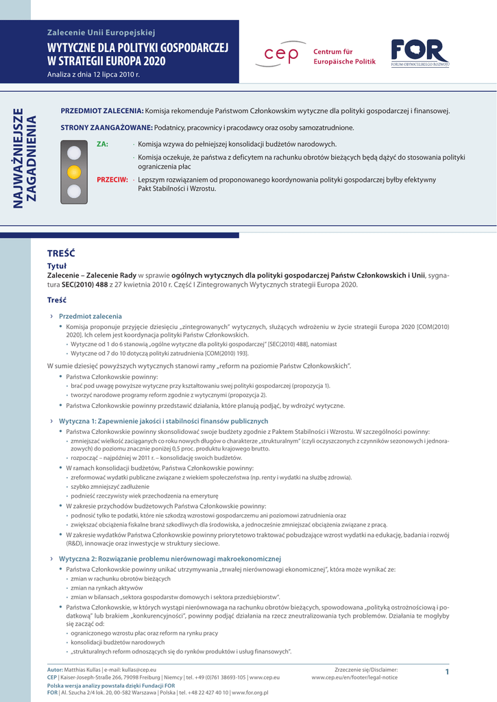Zalecenie Unii Europejskiej WYTYCZNE DLA POLITYKI GOSPODARCZEJ W STRATEGII EUROPA 2020 Analiza z dnia 12 lipca 2010 r. NAJWAŻNIEJSZE ZAGADNIENIA PRZEDMIOT ZALECENIA: Komisja rekomenduje Państwom Członkowskim wytyczne dla polityki gospodarczej i finansowej. STRONY ZAANGAŻOWANE: Podatnicy, pracownicy i pracodawcy oraz osoby samozatrudnione. ZA: ∙ Komisja wzywa do pełniejszej konsolidacji budżetów narodowych. ∙ Komisja oczekuje, że państwa z deficytem na rachunku obrotów bieżących będą dążyć do stosowania polityki ograniczenia płac PRZECIW: ∙ Lepszym rozwiązaniem od proponowanego koordynowania polityki gospodarczej byłby efektywny Pakt Stabilności i Wzrostu. TREŚĆ Tytuł Zalecenie – Zalecenie Rady w sprawie ogólnych wytycznych dla polityki gospodarczej Państw Członkowskich i Unii, sygnatura SEC(2010) 488 z 27 kwietnia 2010 r. Część I Zintegrowanych Wytycznych strategii Europa 2020. Treść ›› Przedmiot zalecenia • Komisja proponuje przyjęcie dziesięciu „zintegrowanych” wytycznych, służących wdrożeniu w życie strategii Europa 2020 [COM(2010) 2020]. Ich celem jest koordynacja polityki Państw Członkowskich. • Wytyczne od 1 do 6 stanowią „ogólne wytyczne dla polityki gospodarczej” [SEC(2010) 488], natomiast • Wytyczne od 7 do 10 dotyczą polityki zatrudnienia [COM(2010) 193]. W sumie dziesięć powyższych wytycznych stanowi ramy „reform na poziomie Państw Członkowskich”. • Państwa Członkowskie powinny: • brać pod uwagę powyższe wytyczne przy kształtowaniu swej polityki gospodarczej (propozycja 1). • tworzyć narodowe programy reform zgodnie z wytycznymi (propozycja 2). • Państwa Członkowskie powinny przedstawić działania, które planują podjąć, by wdrożyć wytyczne. ›› Wytyczna 1: Zapewnienie jakości i stabilności finansów publicznych • Państwa Członkowskie powinny skonsolidować swoje budżety zgodnie z Paktem Stabilności i Wzrostu. W szczególności powinny: • zmniejszać wielkość zaciąganych co roku nowych długów o charakterze „strukturalnym” (czyli oczyszczonych z czynników sezonowych i jednorazowych) do poziomu znacznie poniżej 0,5 proc. produktu krajowego brutto. • rozpocząć – najpóźniej w 2011 r. – konsolidację swoich budżetów. • W ramach konsolidacji budżetów, Państwa Członkowskie powinny: • zreformować wydatki publiczne związane z wiekiem społeczeństwa (np. renty i wydatki na służbę zdrowia). • szybko zmniejszyć zadłużenie • podnieść rzeczywisty wiek przechodzenia na emeryturę • W zakresie przychodów budżetowych Państwa Członkowskie powinny: • podnosić tylko te podatki, które nie szkodzą wzrostowi gospodarczemu ani poziomowi zatrudnienia oraz • zwiększać obciążenia fiskalne branż szkodliwych dla środowiska, a jednocześnie zmniejszać obciążenia związane z pracą. • W zakresie wydatków Państwa Członkowskie powinny priorytetowo traktować pobudzające wzrost wydatki na edukację, badania i rozwój (R&D), innowacje oraz inwestycje w struktury sieciowe. ›› Wytyczna 2: Rozwiązanie problemu nierównowagi makroekonomicznej • Państwa Członkowskie powinny unikać utrzymywania „trwałej nierównowagi ekonomicznej”, która może wynikać ze: • zmian w rachunku obrotów bieżących • zmian na rynkach aktywów • zmian w bilansach „sektora gospodarstw domowych i sektora przedsiębiorstw”. • Państwa Członkowskie, w których wystąpi nierównowaga na rachunku obrotów bieżących, spowodowana „polityką ostrożnościową i podatkową” lub brakiem „konkurencyjności”, powinny podjąć działania na rzecz zneutralizowania tych problemów. Działania te mogłyby się zacząć od: • ograniczonego wzrostu płac oraz reform na rynku pracy • konsolidacji budżetów narodowych • „strukturalnych reform odnoszących się do rynków produktów i usług finansowych”. Autor: Matthias Kullas | e-mail: [email protected] CEP | Kaiser-Joseph-Straße 266, 79098 Freiburg | Niemcy | tel. +49 (0)761 38693-105 | www.cep.eu Polska wersja analizy powstała dzięki Fundacji FOR FOR | Al. Szucha 2/4 lok. 20, 00-582 Warszawa | Polska | tel. +48 22 427 40 10 | www.for.org.pl Zrzeczenie się/Disclaimer: www.cep.eu/en/footer/legal-notice 1 Zalecenie Unii Europejskiej WYTYCZNE DLA POLITYKI GOSPODARCZEJ W STRATEGII EUROPA 2020 Analiza z dnia 12 lipca 2010 r. ›› Wytyczna 3: Zmniejszenie nierównowag w strefie euro • Państwa należące do strefy euro, mające deficyt na rachunku obrotów bieżących wynikający z braku „konkurencyjności”, powinny dążyć do „znaczącego” zmniejszenia go w kolejnych latach. W tym celu powinny szczególnie zmniejszać realne jednostkowe koszty pracy. • Członkowie strefy euro z nadwyżką na rachunku obrotów bieżących powinni usuwać przeszkody ograniczające indywidualny popyt wewnętrzny • Państwa strefy euro powinny również dążyć do zmniejszenia „zbytniego nagromadzenia zadłużenia prywatnego” oraz „różnic w poziomie inflacji”. ›› Wytyczna 4: Optymalizacja pomocy na rzecz badań, rozwoju i innowacji, wzmocnienie trójkąta wiedzy i uwolnienie potencjału gospodarki cyfrowej • By mocniej wesprzeć działalność badawczo-rozwojową i innowacyjną, Państwa Członkowskie powinny nakierować swoje „systemy wsparcia innowacji” na „poważne wyzwania społeczne” (np. dostawy energii, efektywność wykorzystania zasobów, zmiany klimatu, starzenie się, ochronę zdrowia i zabezpieczenie społeczne). • Państwa Członkowskie powinny wzmocnić tzw. „trójkąt wiedzy” (edukację, badania, innowacje). • Państwa członkowskie powinny poprawić jakość edukacji poprzez: • zapewnianie obywatelom szerokiego wachlarza umiejętności • zadbanie o wystarczającą liczbę absolwentów kierunków matematycznych, inżynierskich i związanych z naukami ścisłymi • Państwa członkowskie powinny promować badania poprzez: •