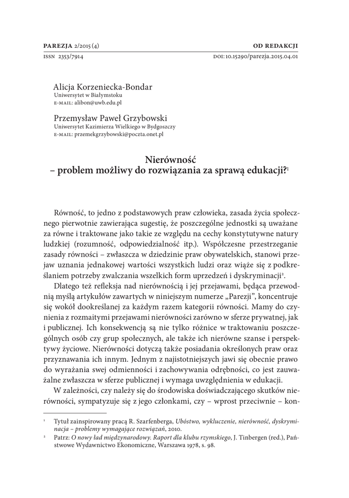 parezja · 2/2015(4) · od redakcji · parezja 2/2015 (4) issn 2353/7914 od redakcji doi: 10.15290/parezja.2015.04.01 Alicja Korzeniecka-Bondar Uniwersytet w Białymstoku e-mail: [email protected] Przemysław Paweł Grzybowski Uniwersytet Kazimierza Wielkiego w Bydgoszczy e-mail: [email protected] Nierówność – problem możliwy do rozwiązania za sprawą edukacji? Równość, to jedno z podstawowych praw człowieka, zasada życia społecznego pierwotnie zawierająca sugestię, że poszczególne jednostki są uważane za równe i traktowane jako takie ze względu na cechy konstytutywne natury ludzkiej (rozumność, odpowiedzialność itp.). Współczesne przestrzeganie zasady równości – zwłaszcza w dziedzinie praw obywatelskich, stanowi przejaw uznania jednakowej wartości wszystkich ludzi oraz wiąże się z podkreślaniem potrzeby zwalczania wszelkich form uprzedzeń i dyskryminacji. Dlatego też refleksja nad nierównością i jej przejawami, będąca przewodnią myślą artykułów zawartych w niniejszym numerze „Parezji”, koncentruje się wokół dookreślanej za każdym razem kategorii równości. Mamy do czynienia z rozmaitymi przejawami nierówności zarówno w sferze prywatnej, jak i publicznej. Ich konsekwencją są nie tylko różnice w traktowaniu poszczególnych osób czy grup społecznych, ale także ich nierówne szanse i perspektywy życiowe. Nierówności dotyczą także posiadania określonych praw oraz przyznawania ich innym. Jednym z najistotniejszych jawi się obecnie prawo do wyrażania swej odmienności i zachowywania odrębności, co jest zauważalne zwłaszcza w sferze publicznej i wymaga uwzględnienia w edukacji. W zależności, czy należy się do środowiska doświadczającego skutków nierówności, sympatyzuje się z jego członkami, czy – wprost przeciwnie – kon Tytuł zainspirowany pracą R. Szarfenberga, Ubóstwo, wykluczenie, nierówność, dyskryminacja – problemy wymagające rozwiązań, 2010. Patrz: O nowy ład międzynarodowy. Raport dla klubu rzymskiego, J. Tinbergen (red.), Państwowe Wydawnictwo Ekonomiczne, Warszawa 1978, s. 98. · a. korzeniecka-bondar, p. p. grzybowski · testuje się czyjeś prawo do równego traktowania, kwestia nierówności bywa postrzegana jako istotny problem społeczny, któremu należy zaradzić lub jako wydumany postulat, którego racjonalność można dowolnie podważać. Dlatego też dyskusje o nierównościach wiążą się z kontrowersjami, dylematami identyfikacyjnymi uczestników sporów i implikacjami edukacyjnymi, z którymi muszą się zmierzyć zwłaszcza pracownicy systemu oświaty. Już u zarania realizacji idei równości, to jest w czasach kształtowania się republikańskiej wspólnoty społecznej, równość istniała tylko w sferze moralnej, ideowej i kulturowej. Rozwój poszczególnych społeczeństw nie jest możliwy bez uznania zróżnicowań i nierówności społecznych, zaś rezygnacja z trącącego totalitaryzmem dążenia do ujednolicania jednostek i grup społecznych paradoksalnie przyczynia się do zmniejszenia napięć społecznych. Dylematem staje się więc dążenie do równości, a realne doświadczanie konsekwencji nierówności jest nie tylko systemowym (instytucjonalnym) wyzwaniem, ale także wyznacznikiem perspektyw poszczególnych osób, które w zależności od tego, na jak duże nierówności własne są w stanie wyrazić zgodę, będą funkcjonować harmonijnie lub buntować się przeciwko utrwalającemu nierówności systemowi społecznemu. Stąd już tylko krok do poszukiwania ideologicznych okoliczności dyskryminacji z powodu nierównych praw i możliwości oraz do poszukiwania sposobów uwzględnienia tych okoliczności w projektowaniu działań choćby tylko na stykach edukacji wielokulturowej i międzykulturowej. Z edukacyjnych wyzwań związanych z nierównościami zdają sobie sprawę autorzy artykułów zamieszczonych w tym numerze „Parezji”. Wychodząc z założenia, że szkoła powinna być miejscem edukacji w duchu równości szans wszystkich uczniów, zwracają uwagę na potrzebę poszanowania praw człowieka w oparciu o idee uniwersalizmu, integracji społeczno-kulturowej w duchu obywatelskości – co jest szczególnie ważne dla uczniów wywodzących się ze środowisk defaworyzowanych. Numer otwiera artykuł, w którym Tomasz Leś i Małgorzata Kozak przedstawili Filozoficzno-prawne aspekty uzasadnienia prawa do równości w edukacji. Szczególną uwagę skupili na następujących kwestiach: podstawowe problemy związane z uzasadnieniem prawa do równości w edukacji, uwzględniające w szczególności relacyjny i normatywny aspekt zasady równości i prawa do edukacji (w tym podejmowane w historii filozofii próby uzasadnienia wspomnianego prawa) oraz analiza zabezpieczającego zasadę Patrz: J. Kuczyński, Młodość Europy i wieczność Polski, Centrum Uniwersalizmu przy Uniwersytecie Warszawskim, Wyższa Szkoła Ekologii i Zarządzania, Warszawa 1999, s. 144. Patrz: O nowy ład…, s. 99. parezja · 2/2015(4) · od redakcji · równości ustawodawstwa polskiego (w tym, faktyczne bariery w realizacji tej zasady na gruncie polskiego systemu oświaty). Anna Dąbrowska w tekście Równi i równiejsi. Kompetencja komunikacyjna i edukacyjne paradoksy podjęła próbę odpowiedzi na pytanie, czym jest kompetencja komunikacyjna oraz przedstawiła przykłady praktyki edukacyjnej, które w wątpliwość podają wspierającą rolę szkoły w rozwijaniu umiejętności językowych dzieci. Autorka pisze krytycznie: „Edukacja językowa w szkole paradoksalnie nie sprzyja rozwojowi kompetencji komunikacyjnej uczniów. Umiejętności komunikacyjne kształtowane są głównie poprzez doświadczenia językowe zdobyte poza szkołą, zależne od kapitału społeczno-kulturowego środowiska rodzinnego dziecka. Jednocześnie egzekwowaniu i ocenie podlegają umiejętności językowe uczniów. W tej sytuacji znacznie większe szanse na sukces w szkole mają dz