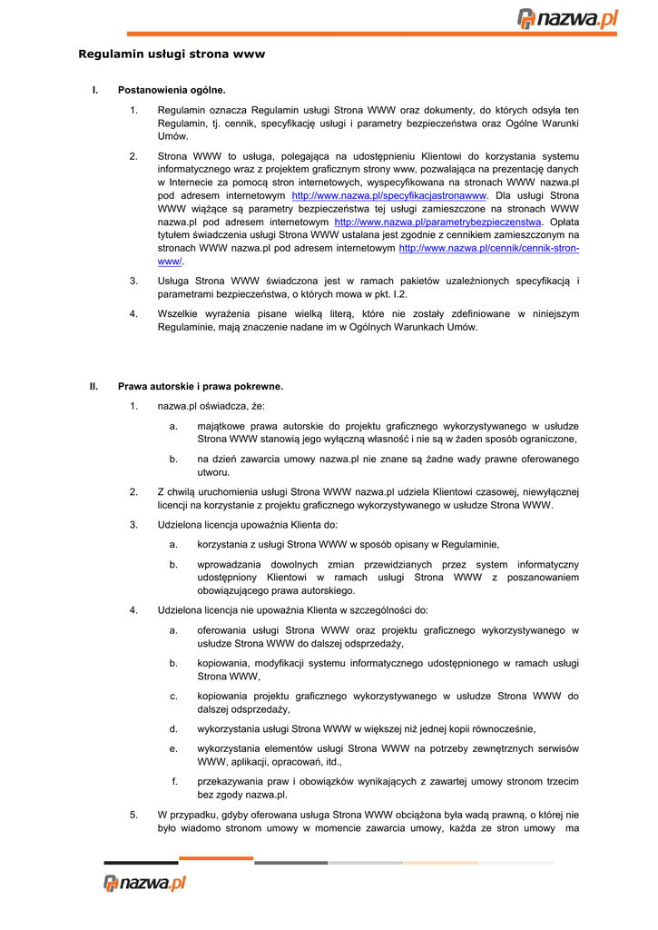 Regulamin usługi strona www I. II. Postanowienia ogólne. 1. Regulamin oznacza Regulamin usługi Strona WWW oraz dokumenty, do których odsyła ten Regulamin, tj. cennik, specyfikację usługi i parametry bezpieczeństwa oraz Ogólne Warunki Umów. 2. Strona WWW to usługa, polegająca na udostępnieniu Klientowi do korzystania systemu informatycznego wraz z projektem graficznym strony www, pozwalająca na prezentację danych w Internecie za pomocą stron internetowych, wyspecyfikowana na stronach WWW nazwa.pl pod adresem internetowym http://www.nazwa.pl/specyfikacjastronawww. Dla usługi Strona WWW wiążące są parametry bezpieczeństwa tej usługi zamieszczone na stronach WWW nazwa.pl pod adresem internetowym http://www.nazwa.pl/parametrybezpieczenstwa. Opłata tytułem świadczenia usługi Strona WWW ustalana jest zgodnie z cennikiem zamieszczonym na stronach WWW nazwa.pl pod adresem internetowym http://www.nazwa.pl/cennik/cennik-stronwww/. 3. Usługa Strona WWW świadczona jest w ramach pakietów uzależnionych specyfikacją i parametrami bezpieczeństwa, o których mowa w pkt. I.2. 4. Wszelkie wyrażenia pisane wielką literą, które nie zostały zdefiniowane w niniejszym Regulaminie, mają znaczenie nadane im w Ogólnych Warunkach Umów. Prawa autorskie i prawa pokrewne. 1. nazwa.pl oświadcza, że: a. majątkowe prawa autorskie do projektu graficznego wykorzystywanego w usłudze Strona WWW stanowią jego wyłączną własność i nie są w żaden sposób ograniczone, b. na dzień zawarcia umowy nazwa.pl nie znane są żadne wady prawne oferowanego utworu. 2. Z chwilą uruchomienia usługi Strona WWW nazwa.pl udziela Klientowi czasowej, niewyłącznej licencji na korzystanie z projektu graficznego wykorzystywanego w usłudze Strona WWW. 3. Udzielona licencja upoważnia Klienta do: 4. 5. a. korzystania z usługi Strona WWW w sposób opisany w Regulaminie, b. wprowadzania dowolnych zmian przewidzianych przez system informatyczny udostępniony Klientowi w ramach usługi Strona WWW z poszanowaniem obowiązującego prawa autorskiego. Udzielona licencja nie upoważnia Klienta w szczególności do: a. oferowania usługi Strona WWW oraz projektu graficznego wykorzystywanego w usłudze Strona WWW do dalszej odsprzedaży, b. kopiowania, modyfikacji systemu informatycznego udostępnionego w ramach usługi Strona WWW, c. kopiowania projektu graficznego wykorzystywanego w usłudze Strona WWW do dalszej odsprzedaży, d. wykorzystania usługi Strona WWW w większej niż jednej kopii równocześnie, e. wykorzystania elementów usługi Strona WWW na potrzeby zewnętrznych serwisów WWW, aplikacji, opracowań, itd., f. przekazywania praw i obowiązków wynikających z zawartej umowy stronom trzecim bez zgody nazwa.pl. W przypadku, gdyby oferowana usługa Strona WWW obciążona była wadą prawną, o której nie było wiadomo stronom umowy w momencie zawarcia umowy, każda ze stron umowy ma Regulamin usługi strona www prawo do rozwiązania umowy za zwrotem całości wniesionych przez Klienta na rzecz nazwa.pl opłat za usługę Strona WWW. Zwrot opłat nie wyłącza uprawnienia Klienta będącego Konsumentem do dochodzenia innych roszczeń zgodnie z obowiązującymi przepisami. III. IV. 6. W przypadku opisanym w pkt II. 5 całkowita odpowiedzialność nazwa.pl wobec Klienta nie może przekroczyć wniesionej przez Klienta na rzecz nazwa.pl opłaty. Ograniczenie to nie ma zastosowania w przypadku Klienta będącego Konsumentem. 7. Klient wyraża zgodę na umieszczenie na stronie internetowej stworzonej z wykorzystaniem usługi Strona WWW oznaczenia „Copyright © [bieżący rok] nazwa.pl” lub innego oznaczenia wskazującego na usługodawcę, jego ofertę lub usługę, z wykorzystaniem której powstała strona WWW Klienta. Zamawianie usługi Strona WWW. 1. Zamówienie usługi Strona WWW polega na wypełnieniu przez Klienta elektronicznego wniosku zamówienia usługi. 2. Złożenie zamówienia jest równoznaczne z zawarciem umowy pomiędzy Klientem a nazwa.pl o świadczenie usługi Strona WWW na warunkach wskazanych w Regulaminie na czas trwania Okresu Abonamentowego, o ile inne zapisy Regulaminu nie stanowią inaczej. 3. Zawierając umowę na podstawie zapisów Regulaminu (tj. w zależności od okoliczności: zamawiając usługę, dokonując wpłaty lub przystępując do korzystania z usługi opłaconej za pośrednictwem osoby trzeciej) Klient oświadcza, iż zapoznał się i akceptuje w całości Regulamin. 4. nazwa.pl zobowiązuje się do aktywowania usługi Strona WWW na warunkach określonych w prawidłowo złożonym zamówieniu usługi Strona WWW oraz do wystawienia proformy tytułem utrzymania usługi. 5. Usługa Strona WWW aktywowana jest na 14 dniowy Okres Próbny liczony od daty zamówienia usługi. Klient będący Konsumentem oświadcza, że żąda aktywacji usługi przed upływem 14 dni od daty prawidłowego złożenia zamówienia. 6. Limit transferu możliwy do osiągnięcia w trakcie trwania Okresu Próbnego mierzony na warstwie IP w kierunku z i do usługi nie może przekroczyć 10 GB danych. nazwa.pl zastrzega sobie prawo wprowadzenia limitu wysyłanych wiadomości email przy wykorzystaniu usługi, ograniczając liczbę wiadomości email do 50 dziennie w trakcie trwania Okresu Próbnego. nazwa.pl zastrzega sobie prawo wprowadzenia limitów parametrów usługi wiążących w trakcie trwania Okresu Próbnego wskazanych w parametrach bezpieczeństwa, o których mowa w pkt. I.2. Zmiana pakietu. 1. W trakcie bieżącego Okresu Abonamentowego Klient za dodatkową opłatą może zmienić dotychczasowy pakiet na pakiet o wyższej cenie, o ile taki istnieje i jest wskazany w specyfikacji usługi. 2. Zmiana pakietu na pakiet o wyższej cenie jest możliwa po zgłoszeniu zmiany poprzez dyspozycję w Panelu Klienta. nazwa.pl wystawi Klientowi proformę obejmującą różnicę pomiędzy ceną wyższego pakietu a opłatą uiszczoną przez Klienta za usługę, proporcjonalnie do liczby dni pozos