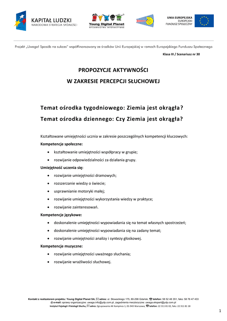Klasa III / Scenariusz nr 30 PROPOZYCJE AKTYWNOŚCI W ZAKRESIE PERCEPCJI SŁUCHOWEJ Temat ośrodka tygodniowego: Ziemia jest okrągła? Temat ośrodka dziennego: Czy Ziemia jest okrągła? Kształtowane umiejętności ucznia w zakresie poszczególnych kompetencji kluczowych: Kompetencje społeczne:  kształtowanie umiejętności współpracy w grupie;  rozwijanie odpowiedzialności za działania grupy. Umiejętność uczenia się:  rozwijanie umiejętności dramowych;  rozszerzanie wiedzy o świecie;  usprawnianie motoryki małej;  rozwijanie umiejętności wykorzystania wiedzy w praktyce;  rozwijanie zainteresowań. Kompetencje językowe:  doskonalenie umiejętności wypowiadania się na temat własnych spostrzeżeń;  doskonalenie umiejętności wypowiadania się na zadany temat;  rozwijanie umiejętności analizy i syntezy głoskowej. Kompetencje muzyczne:  rozwijanie umiejętności uważnego słuchania;  rozwijanie wrażliwości słuchowej. Kontakt z realizatorem projektu: Young Digital Planet SA, adres: ul. Słowackiego 175, 80-298 Gdańsk, telefon: 58 52 48 351, faks: 58 76 47 433 e-mail: sprawy organizacyjne: [email protected], zagadnienia merytoryczne: [email protected] Instytut Fizjologii i Patologii Słuchu, adres: Zgrupowania AK Kampinos 1, 01-943 Warszawa, telefon: 22 311 81 02, faks: 22 311 81 18 1 Klasa III / Scenariusz nr 30 PRZEBIEG ZAJĘĆ 1. Zajęcia wstępne a. Zajęcia porządkowe  Powitanie Uczniowie tworzą koło, trzymają się za ręce. Spacerują w rytm muzyki. Kiedy muzyka milknie, siadają, starając się nie puszczać dłoni osób, które mają obok siebie. Nauczyciel dołącza do grupy. Następnie ściska dłoń dziecka po lewej stronie. W ten sposób kolejne osoby przekazują sobie „iskierkę”.  Ustalenie daty Nauczyciel przygotowuje siedem piłek różnej wielkości, informuje uczniów, która piłka, jaki dzień tygodnia oznacza. Następnie rozrzuca piłki. Uczniowie stają za piłką, która odpowiada aktualnemu dniu tygodnia. Wybrany uczeń wypowiada w odpowiedniej kolejności nazwy miesięcy, kolejny - pór roku. Pozostali uczniowie, uważnie słuchając, sprawdzają, czy wszystkie nazwy zostały wymienione. Dyżurni ustalają dzisiejszą datę i zapisują ją na tablicy.  Przygotowanie do zajęć Nauczyciel rzuca piłeczkę do wybranego ucznia. Uczeń wypowiada nazwę przedmiotu/przyboru, który wszyscy mają położyć przed sobą. Następnie rzuca piłkę do dowolnie wybranej osoby, która podaje nazwę kolejnego przedmiotu. Zabawa trwa do momentu, aż uczniowie uznają, że wszystkie potrzebne przedmioty zostały wypakowane z tornistrów.  Ustalenie listy obecności Uczniowie ustawiają się w rzędzie, plecami zwróceni do nauczyciela. Prowadzący odczytuje listę obecności – wymawia imiona i nazwiska uczniów głoskami. Dziecko, które usłyszy swoje nazwisko, odwraca się i zgłasza swoją obecność. Po odwróceniu się wszystkich uczniów, chętny uczeń liczy, ile jest osób w klasie. Kontakt z realizatorem projektu: Young Digital Planet SA, adres: ul. Słowackiego 175, 80-298 Gdańsk, telefon: 58 52 48 351, faks: 58 76 47 433 e-mail: sprawy organizacyjne: [email protected], zagadnienia merytoryczne: [email protected] Instytut Fizjologii i Patologii Słuchu, adres: Zgrupowania AK Kampinos 1, 01-943 Warszawa, telefon: 22 311 81 02, faks: 22 311 81 18 2 Klasa III / Scenariusz nr 30 b. Obserwacja przyrody  Uczniowie podchodzą do okna i obserwują przyrodę (jeśli pogoda na to pozwoli, można otworzyć okno). Następnie zamykają oczy i wsłuchują się w odgłosy dobiegające z otoczenia.  Uczniowie wypełniają kartę pracy nr 1: - w formie rysunkowej przedstawiają swoje obserwacje. Następnie przypominają, jakie dźwięki z otoczenia usłyszeli. Starają się je naśladować.  Uczniowie wspólnie omawiają, jaka jest pogoda, co zaobserwowali i usłyszeli interesującego w przyrodzie, co ich zaciekawiło, zaskoczyło, zadziwiło. c. Przedstawienie celu i tematu zajęć  Nauczyciel wybiera największą piłkę, jaka znajduje się w klasie, i prosi uczniów, aby zastanowili się, z czym im się ona kojarzy. Dzieci wymieniają swoje skojarzenia. Na słowa: „Ziemia”, „kula ziemska”, nauczyciel przedstawia temat zajęć. Jeśli takie słowa skojarzenia nie padną, prowadzący prezentuje globus.  Nauczyciel przedstawia uczniom temat zajęć: Czy Ziemia jest okrągła? 2. Praca poznawcza a. Obserwacja Uczniowie oglądają globusy przygotowane przez nauczyciela. W miarę możliwości odczytują nazwy kontynentów i oceanów. Następnie przyglądają się globusom z góry. Opowiadają, co widzą z tej perspektywy. Nauczyciel ukierunkowuje obserwacje uczniów pytaniami: o Jaki kształt ma Ziemia? o Jakiego koloru jest najwięcej? Jak – ze względu na ten kolor – nazwalibyście naszą planetę? b. Kojarzenie Nauczyciel prezentuje zdjęcia satelitarne Ziemi, podsumowuje obserwacje uczniów słowami: Kontakt z realizatorem projektu: Young Digital Planet SA, adres: ul. Słowackiego 175, 80-298 Gdańsk, telefon: 58 52 48 351, faks: 58 76 47 433 e-mail: sprawy organizacyjne: [email protected], zagadnienia merytoryczne: [email protected] Instytut Fizjologii i Patologii Słuchu, adres: Zgrupowania AK Kampinos 1, 01-943 Warszawa, telefon: 22 311 81 02, faks: 22 311 81 18 3 Klasa III / Scenariusz nr 30 Ziemia w kosmosie wygląda jak wielka piłka. Nie jest jednak tak okrągła jak globus, ale lekko spłaszczona na górze i na dole, pośrodku zaś wybrzusza się. Dzięki swojemu kształtowi Ziemia może obracać się wokół siebie, a jednocześnie krążyć wokół Słońca po swojej drodze zwanej orbitą. Dzięki ruchowi ziemi wokół siebie mamy dzień i noc. Jej wędrówce wokół Słońca zawdzięczamy pory roku. Ruch Ziemi wokół własnej osi trwa dobę (czyli tyle, ile dzień i noc razem), a ruch wokół Słońca przez rok (365 dni) – dlatego w czasie drogi połowa planety jest zwrócona do Słońca, a druga – nie. W tej części z