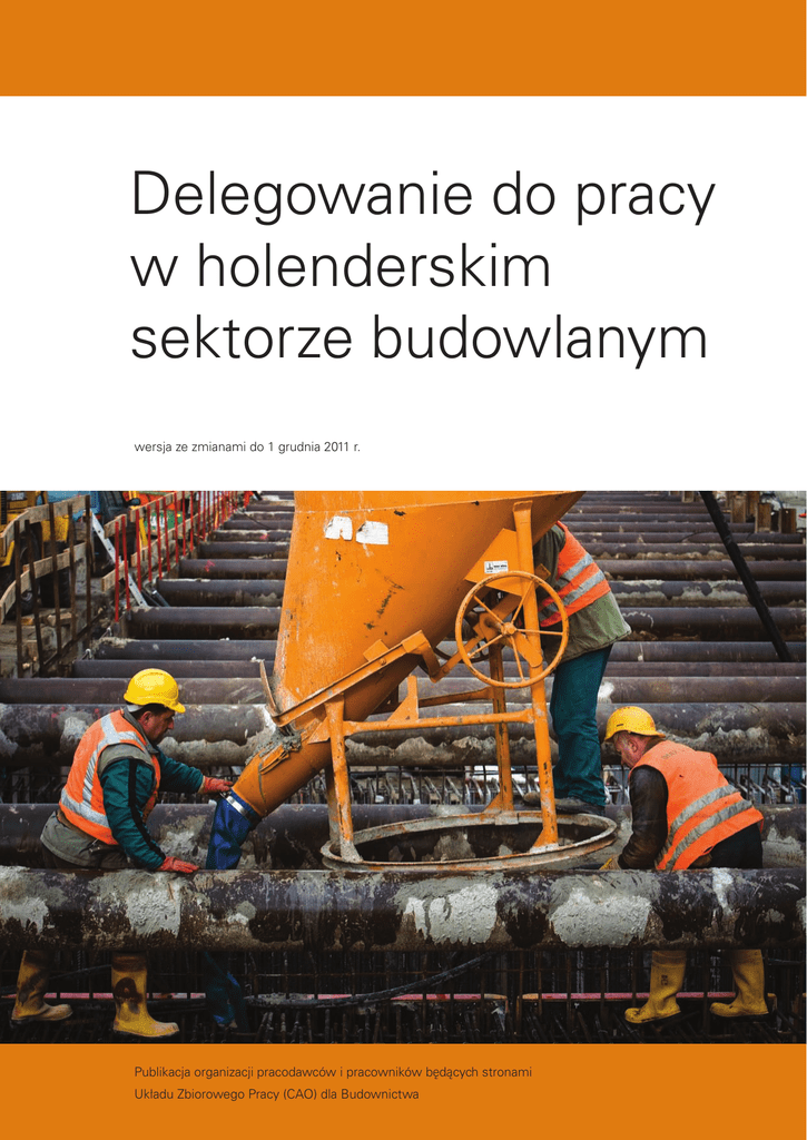 Delegowanie do pracy w holenderskim sektorze budowlanym wersja ze zmianami do 1 grudnia 2011 r. Publikacja organizacji pracodawców i pracowników będących stronami Układu Zbiorowego Pracy (CAO) dla Budownictwa Jakie przepisy CAO obowiązują w przypadku zatrudnienia pracowników zagranicznych? Szczegółowe informacje Pracownik zagraniczny Zatrudniony w Obowiązujące zawarł umowę o pracę z Holandii w postanowienia CAO zagranicznym holenderskim CAO dla Budownictwa, Niniejsza broszura, przedsiębiorstwem przedsiębiorstwie art. 92: Pracownicy rozdział 1 i 2 budowlanym budowlanym zagraniczni zagranicznym CAO dla Budownictwa, Niniejsza broszura, przedsiębiorstwie art. 92: Pracownicy rozdział 1 i 2 budowlanym, zagraniczni które przyjęło w Holandii zlecenie na prace budowlane zagraniczną agencją pracy tymczasowej, która: holenderskim CAO dla Budownictwa, Niniejsza broszura, sektorze budowlanym przedsiębiorstwie art. 92: Pracownicy rozdział 1 i 2 lub stanowi część budowlanym zagraniczni* holenderskim ABU-CAO dla Niniejsza broszura, agencją pracy przedsiębiorstwie Pracowników rozdział 1 i 3 tymczasowej budowlanym Tymczasowych, - specjalizuje się w koncernu budowlanego - jest innego rodzaju art. 46: Pracownicy tymczasowi z zagraniczną umową o pracę (WAGA); w uzupełnieniu – pewne części CAO dla Budownictwa * Jeśli agencja pracy tymczasowej specjalizująca się w sektorze budowlanym jest członkiem ABU lub NBBU, wówczas obowiązuje w całości ABU-CAO lub NBBU-CAO dla Pracowników Tymczasowych oraz pewne części CAO dla Budownictwa. W powyższych przypadkach odsyłamy do rozdziału 1 i 3 niniejszej broszury. Delegowanie do pracy w holenderskim sektorze budowlanym - 1 grudnia 2011 2 Sytuacje, które nie zostały omówione w tej broszurze Pracownik zagraniczny Zatrudniony w Obowiązujące zawarł umowę o pracę z Holandii w postanowienia CAO zagraniczną agencją holenderskim pracy tymczasowej przedsiębiorstwie Szczegółowe informacje budowlanym, za pośrednictwem holenderskiej agencji pracy tymczasowej, która: - specjalizuje się CAO dla Budownictwa Pełna wersja CAO w sektorze budowlanym (w całości)* lub stanowi część koncernu budowlanego - jest innego rodzaju ABU-CAO lub NBBU-CAO Broszura ‘Praca agencją pracy dla Pracowników tymczasowa w tymczasowej Tymczasowych (w holenderskim całości) oraz pewne budownictwie’ części CAO dla Budownictwa holenderską agencją pracy tymczasowej, która: holenderskim CAO dla Budownictwa w sektorze przedsiębiorstwie (w całości)* budowlanym lub budowlanym - specjalizuje się Pełna wersja CAO stanowi część koncernu budowlanego holenderskim ABU-CAO lub NBBU-CAO Broszura ‘Praca agencją pracy przedsiębiorstwie dla Pracowników tymczasowa w tymczasowej budowlanym Tymczasowych (w holenderskim całości) oraz pewne budownictwie’ - jest innego rodzaju części CAO dla Budownictwa holenderskim holenderskim CAO dla Budownictwa przedsiębiorstwem przedsiębiorstwie (w całości) budowlanym budowlanym Pełna wersja CAO * Jeśli agencja pracy tymczasowej specjalizująca się w sektorze budowlanym jest członkiem ABU lub NBBU, wówczas obowiązuje w całości ABU-CAO lub NBBU-CAO dla Pracowników Tymczasowych oraz pewne części CAO dla Budownictwa. W powyższych przypadkach odsyłamy do broszury ‘Praca tymczasowa w holenderskim budownictwie’. Delegowanie do pracy w holenderskim sektorze budowlanym - 1 grudnia 2011 3 Spis treści 1 Wstęp 5 1.1 O broszurze 5 1.2 Ważne pojęcia 6 2 Delegowanie do pracy przez zagraniczne przedsiębiorstwo budowlane 8 2.1 Wstęp 8 2.2 Czas pracy i czas wolny 8 2.3 Wynagrodzenie 10 2.4 Dodatki i rekompensaty 12 2.5 Zdrowie i bezpieczeństwo 16 3 Delegowanie do pracy przez zagraniczną agencję pracy tymczasowej 17 3.1 Wstęp 17 3.2 Pracownicy wykwalifikowani i nowozatrudnieni 18 3.3 Czas pracy i czas wolny 18 3.4 Wynagrodzenie 20 3.5 Dodatki i rekompensaty 22 3.6 Zdrowie i bezpieczeństwo 26 4 Adresy 27 4.1 Strony CAO dla Budownictwa 27 4.2 Strony ABU-CAO lub NBBU-CAO dla Pracowników Tymczasowych 27 Delegowanie do pracy w holenderskim sektorze budowlanym - 1 grudnia 2011 4 1 Wstęp 1.1 O broszurze Holenderska ustawa o warunkach zatrudnienia w przypadku pracy transgranicznej (WAGA) przekłada zapisy europejskiej dyrektywy dotyczącej delegowania pracowników na warunki holenderskie. Ustawa WAGA określa, jakie przepisy ustawowe i zapisy CAO obowiązują pracowników tymczasowych, którzy są zatrudnieni przez przedsiębiorstwo zagraniczne i wykonują tymczasowo pracę w Holandii. Przepisy te chronią uczciwą konkurencję i gwarantują zainteresowanym pracownikom określone minimalne warunki zatrudnienia. W niniejszej broszurze podano, które części holenderskiego Układu Zbiorowego Pracy (CAO) dla Budownictwa mają zastosowanie odnośnie pracowników i pracowników tymczasowych posiadających umowę o pracę zawartą zgodnie z prawem innym niż prawo holenderskie, którzy wykonują tymczasowo prace budowlane w Holandii (co dalej zwane jest: delegowaniem do pracy z zagranicy). W niniejszej broszurze omówiono następujące formy delegowania do pracy z zagranicy: » zagraniczne przedsiębiorstwo budowlane deleguje pracowników do pracy w holenderskim przedsiębiorstwie budowlanym; » zagraniczne przedsiębiorstwo budowlane przyjmuje zlecenie w Holandii i realizuje je z udziałem własnych pracowników; » zagraniczna agencja pracy tymczasowej wysyła pracowników tymczasowych do pracy w holenderskim przedsiębiorstwie budowlanym. To, jakie postanowienia CAO mają dokładnie zastosowanie, zależy od formy delegowania do pracy. Pierwsze dwie wyżej wymienione formy omówiono w rozdziale 2; trzecia forma (praca tymczasowa) opisana została w rozdziale 3. Niniejsza broszura, będąca wspólną publikacją organizacji pracodawców i pracowników, będących stronami CAO dla Budownictwa, jest przeznaczona dla: » zagranicznych przedsiębiorstw budowlanych oraz zagranicznych agencji p