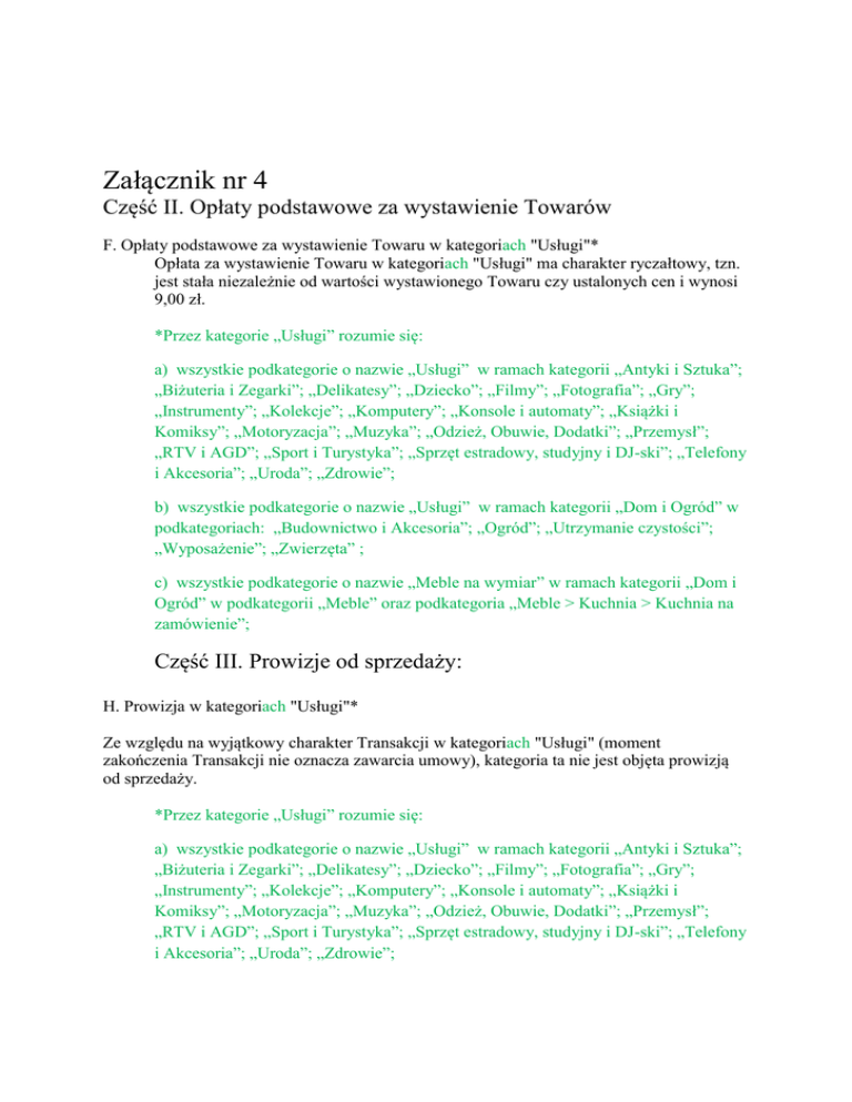 Załącznik nr 4 Część II. Opłaty podstawowe za wystawienie Towarów F. Opłaty podstawowe za wystawienie Towaru w kategoriach "Usługi"* Opłata za wystawienie Towaru w kategoriach "Usługi" ma charakter ryczałtowy, tzn. jest stała niezależnie od wartości wystawionego Towaru czy ustalonych cen i wynosi 9,00 zł. *Przez kategorie „Usługi” rozumie się: a) wszystkie podkategorie o nazwie „Usługi” w ramach kategorii „Antyki i Sztuka”; „Biżuteria i Zegarki”; „Delikatesy”; „Dziecko”; „Filmy”; „Fotografia”; „Gry”; „Instrumenty”; „Kolekcje”; „Komputery”; „Konsole i automaty”; „Książki i Komiksy”; „Motoryzacja”; „Muzyka”; „Odzież, Obuwie, Dodatki”; „Przemysł”; „RTV i AGD”; „Sport i Turystyka”; „Sprzęt estradowy, studyjny i DJ-ski”; „Telefony i Akcesoria”; „Uroda”; „Zdrowie”; b) wszystkie podkategorie o nazwie „Usługi” w ramach kategorii „Dom i Ogród” w podkategoriach: „Budownictwo i Akcesoria”; „Ogród”; „Utrzymanie czystości”; „Wyposażenie”; „Zwierzęta” ; c) wszystkie podkategorie o nazwie „Meble na wymiar” w ramach kategorii „Dom i Ogród” w podkategorii „Meble” oraz podkategoria „Meble > Kuchnia > Kuchnia na zamówienie”; Część III. Prowizje od sprzedaży: H. Prowizja w kategoriach "Usługi"* Ze względu na wyjątkowy charakter Transakcji w kategoriach "Usługi" (moment zakończenia Transakcji nie oznacza zawarcia umowy), kategoria ta nie jest objęta prowizją od sprzedaży. *Przez kategorie „Usługi” rozumie się: a) wszystkie podkategorie o nazwie „Usługi” w ramach kategorii „Antyki i Sztuka”; „Biżuteria i Zegarki”; „Delikatesy”; „Dziecko”; „Filmy”; „Fotografia”; „Gry”; „Instrumenty”; „Kolekcje”; „Komputery”; „Konsole i automaty”; „Książki i Komiksy”; „Motoryzacja”; „Muzyka”; „Odzież, Obuwie, Dodatki”; „Przemysł”; „RTV i AGD”; „Sport i Turystyka”; „Sprzęt estradowy, studyjny i DJ-ski”; „Telefony i Akcesoria”; „Uroda”; „Zdrowie”; b) wszystkie podkategorie o nazwie „Usługi” w ramach kategorii „Dom i Ogród” w podkategoriach: „Budownictwo i Akcesoria”; „Ogród”; „Utrzymanie czystości”; „Wyposażenie”; „Zwierzęta” ; c) wszystkie podkategorie o nazwie „Meble na wymiar” w ramach kategorii „Dom i Ogród” w podkategorii „Meble” oraz podkategoria „Meble > Kuchnia > Kuchnia na zamówienie”; Część IV. Opłaty za opcje dodatkowe A. Opłaty za opcje dodatkowe Stawki opłat za opcje dodatkowe wynoszą: Opcja dodatkowa Opłata Dodanie opcji Kup Teraz do Transakcji 0 zł licytacyjnej Planowane 0,05 zł wystawienie 2,00 zł przy równoczesnym zakupie Wyróżnienia (dla Transakcji wyróżnionych ikoną "Standard Allegro" cena wynosi Czas trwania 1,30 zł) Transakcji: 14 dni 0,50 zł bez równoczesnego zakupu Wyróżnienia (dla Transakcji wyróżnionych ikoną "Standard Allegro" cena wynosi 0,30 zł) 1,5% ceny minimalnej, nie mniej jednak niż 5,00 zł i nie więcej Cena minimalna niż 50,00 zł (Opłata zwracana w przypadku sprzedaży przedmiotu) Pierwsze zdjęcie do Zawarta w opłacie podstawowej za wystawienie Towaru (bez 200 KB* dodatkowych opłat) Każde dodatkowe zdjęcie (drugie i 0,10 zł kolejne) do 200 KB* Pogrubienie 2,00 zł Podświetlenie 3,00 zł 12,00 zł w kategoriach: Filmy; Gry; Konsole i automaty; Kolekcje; Książki i Komiksy; Muzyka; Instrumenty; Sprzęt estradowy, studyjny i DJ-ski; Rękodzieło; Antyki i Sztuka; Delikatesy; (dla Transakcji wyróżnionych ikoną "Standard Wyróżnienie Allegro" cena wynosi 6,00 zł); Strona działu 19,00 zł w pozostałych kategoriach (dla Transakcji wyróżnionych ikoną "Standard Allegro" cena wynosi 12,00 zł) 18,00 zł w kategoriach: Antyki i Sztuka; Kolekcje; Rękodzieło; Fotografia; Konsole i Automaty; Komputery; RTV i AGD; Telefony i Akcesoria; Sprzęt Estradowy, studyjny i DJ-ski; Biżuteria i Zegarki; Odzież, Obuwie, Dodatki; Uroda; Sport i Turystyka; Delikatesy; Dom i Ogród; Zdrowie; Dla Dzieci; Bilety; Filmy; Gry; Instrumenty; Książki i Komiksy; Muzyka; Biuro i Reklama; Przemysł; (dla Transakcji wyróżnionych ikoną "Standard Allegro" cena wynosi 15,00 zł) 22,00 zł w kategoriach Usługi** 14,99 w kategoriach Filmy; Gry; Konsole i automaty; Kolekcje; Książki i Komiksy; Muzyka; Instrumenty; Sprzęt estradowy, Pakiet Wyróżnienie studyjny i DJ-ski; Rękodzieło; Antyki i Sztuka; Delikatesy + Pogrubienie + Podświetlenie 19,99 zł w pozostałych kategoriach * dotyczy zdjęć wprowadzonych na serwer Allegro poprzez formularz sprzedaży; zamieszczanie zdjęć z zewnętrznych serwerów jest bezpłatne. ***Przez kategorie „Usługi” rozumie się: a) wszystkie podkategorie o nazwie „Usługi” w ramach kategorii „Antyki i Sztuka”; „Biżuteria i Zegarki”; „Delikatesy”; „Dziecko”; „Filmy”; „Fotografia”; „Gry”; „Instrumenty”; „Kolekcje”; „Komputery”; „Konsole i automaty”; „Książki i Komiksy”; „Motoryzacja”; „Muzyka”; „Odzież, Obuwie, Dodatki”; „Przemysł”; „RTV i AGD”; „Sport i Turystyka”; „Sprzęt estradowy, studyjny i DJ-ski”; „Telefony i Akcesoria”; „Uroda”; „Zdrowie”; b) wszystkie podkategorie o nazwie „Usługi” w ramach kategorii „Dom i Ogród” w podkategoriach: „Budownictwo i Akcesoria”; „Ogród”; „Utrzymanie czystości”; „Wyposażenie”; „Zwierzęta” ; c) wszystkie podkategorie o nazwie „Meble na wymiar” w ramach kategorii „Dom i Ogród” w podkategorii „Meble” oraz podkategoria „Meble > Kuchnia > Kuchnia na zamówienie”;