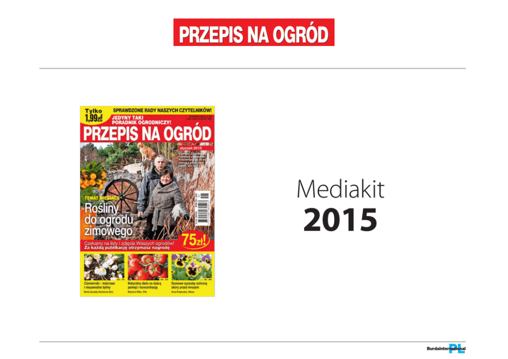 Mediakit 2015 Słowo wstępu Przepis na Ogród jest pierwszym i jedynym na rynku interaktywnym miesięcznikiem ogrodniczym. Przepis na Ogród to czasopismo, jakiego jeszcze nie było. W całości jest tworzone przez czytelników i dla czytelników. Tytuł kierujemy do szerokiego grona miłośników ogrodnictwa, aktywnie poszukujących praktycznych porad i chętnie dzielących się własnymi doświadczeniami. W tym wyjątkowym poradniku zdradzamy sprawdzone przez czytelników i wsparte opinią ekspertów sposoby uprawy, pielęgnacji i ochrony roślin. Jednocześnie doradzamy w innych dziedzinach, takich jak zdrowie, kulinaria, dom czy prawo. Tylu doświadczonych ogrodników jeszcze nigdy dotąd nie można było spotkać w żadnym czasopiśmie. Dlatego z każdym rokiem nasza rodzina ogrodnicza powiększa się o kolejne interaktywne wydania specjalne m.in. „Zdrowie z natury” i „Kwiaty w domu”. W Przepisie na Ogród za każdy opublikowany list, poradę lub zdjęcie miesiąca płacimy autorowi 75 złotych. Najciekawszy ogród wyróżniamy fotoreportażem, a jego właściciel trafia na okładkę i otrzymuje aż 300 złotych nagrody! Katarzyna Gubała redaktor naczelna wstęp Sprzedaż: 97 945 egz. Czytelnictwo: 496 000 Profil czytelnika: 17,5% mężczyzn, 82,5% kobiet Średni wiek: 50 lat Średnie i wyższe wykształcenie: 63,7% Dochód gospodarstwa domowego powyżej 3 000 zł: 56,2% Miejsce zamieszkania – miasta powyżej 50 000 mieszk.: 21,9% Źródło: P BC; 10/2013 – 09/2014; SCPW; wszyscy; n= 40 542; realizacja Millward Brown; opracowanie Burda ZKDP; 10/2013 – 09/2014 o tytule Online facebook Fan page Przepisu na Ogród 5 414 fanów (stan na 07.01.2015) mojpieknyogrod.pl 114 838 odsłon 25 758 unikalnych użytkowników (w grudniu 2014) online Formaty i cennik cała strona (5+148+5) x (5+210+5) mm 1/2 strony pion 1/2 strony poziom 1/3 strony pion 1/3 strony poziom II okładka 16 900 zł III okładka 15 900 zł IV okładka 19 900 zł cała strona 14 900 zł 1/2 strony 8 900 zł 1/3 strony 6 900 zł Dopłaty Reklama w pierwszej 1/2 pisma (5+73+5) x (5+210+5) mm (5+148+5) x (5+102+5) mm (5+50+5) x (5+210+5) mm (5+148+5) x (5+67+5) mm Reklama w pierwszej 1/3 pisma Reklama przy wybranym materiale Drugi reklamodawca 15% 30% 15% 10% Inne niestandardowe reklamy na podstawie odrębnych kalkulacji. Do cen należy dodać podatek VAT w obowiązującej stawce. formaty i cennik Harmonogram wydawniczy harmonogram Numer wydania Termin dostarczenia materiałów Pierwszy dzień sprzedaży 2/2015 24.12.2014 09.01.2015 3/2015 27.01.2015 06.02.2015 4/2015 24.02.2015 06.03.2015 5/2015 24.03.2015 03.04.2015 6/2015 22.04.2015 06.05.2015 7/2015 25.05.2015 05.06.2015 8/2015 26.06.2015 08.07.2015 9/2015 24.07.2015 05.08.2015 10/2015 25.08.2015 04.09.2015 11/2015 25.09.2015 07.10.2015 12/2015 23.10.2015 05.11.2015 1/2016 24.11.2015 04.12.2015 Dane techniczne i zasady przyjmowania reklam Format netto 148x210 mm Pliki PDF (format preferowany) Photoshop: TIFF, EPS, 300 dpi, CMYK Illustrator: EPS, CMYK, teksty zamienione na krzywe Total Ink Limit (TIL): o kładki maks. 320% środek maks 270% Spady min. 5 mm; minimalna odległość istotnych elementów od linii cięcia: 5 mm Nośniki CD Pliki do 10 MB e-mail: [email protected] ftp://ftp.burdamedia.pl/ login: reklama hasło: burdamedia Druk offset Szczegółową specyfikację techniczną przesyłamy na życzenie klienta. W razie pytań technicznych prosimy o kontakt: Tomasz Langsam, tel. +48 71 37 62 828, e-mail: [email protected] dane techniczne Szczegółowe warunki sprzedaży powierzchni reklamowej, w tym procedury zamawiania, publikacji oraz emisji ogłoszeń i/lub reklam w czasopismach wydawanych przez Burda Media Polska Sp. z o.o. oraz Spółki z grupy Burda Polska, tj. Burda Communications Sp. z o.o., Burda Publishing Polska Sp. z o.o. Sp. Komandytowa, Burda GL Polska Sp. z o.o. oraz Burda NG Polska Sp. z o.o. Sp. Komandytowa, określone są w Regulaminie Zamieszczania Reklam i Ogłoszeń, dostępnym pod adresem www.burdamedia.pl Dlaczego prasa 1 2 Prasa angażuje – czytanie odbywa się w skupieniu; trudno przy lekturze prasy oddawać się jednocześnie innym czynnościom. Prasa buduje wiarygodność – poprzez „towarzyszenie” czytelnikom i „rozmawianie” z nimi (poprzez e-maile, listy, ankiety, komentarze, polemiki) prasa ma opinię doradcy, który umożliwia dokonywanie wyboru. Zaufanie, jakim darzą czytelnicy swoje tytuły i ich wiarygodność wzmacniają przekaz reklamowy. 3 Prasa pogłębia przekaz – poprzez umieszczanie w reklamie pogłębionego komunikatu odbiorca może dowiedzieć się więcej o produkcie. Reklamy prasowe mogą świadomie prezentować inne treści i formy wyrazu niż reklama w innych mediach. W ten sposób reklama prasowa może wzmacniać i modyfikować wizerunek produktu. 4 Prasa dociera precyzyjnie – bogactwo tematyczne prasy oraz szeroko zakrojone badania czytelnictwa i badania konsumenckie pozwalają na precyzyjne opisanie czytelnika i tym samym dobre dopasowanie medium do reklamowanych produktów. benefity 5 Prasa to medium kreatywne – oferta dla reklamodawców jest bardzo szeroka. Poza ogromną liczbą formatów na stronach pisma istnieje cały szereg różnorodnych form, takich jak wrzutki, wklejki, wszywki, banderole, paski zapachowe, zakładki, kalki i wiele innych, które zapadają w pamięć i otwierają nowy rozdział w reklamie prasowej. Możliwości są niemal nieograniczone. 6 Prasa to intymny kontakt z czytelnikiem – jak wynika z badań prasy kobiecej, większości czytelnikom czytanie kojarzy się z relaksem i pewnego rodzaju intymnością, co wpływa na odbiór reklamy. Pismo skłania do dyskusji z koleżankami: o artykułach, kosmetykach, o tym, co jest skuteczne, co warto polecić. 7 Prasa nie irytuje – z najnowszych badań wynika, że widownia telewizyjna jest poirytowana liczbą reklam emitowanych w telewizji. Aż 80%* respondentów uznało reklamę telewizyjną za najbardziej dokuczliw