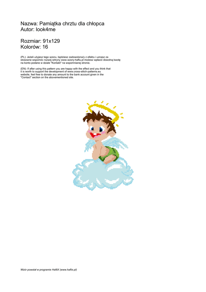 Nazwa: Pamiątka chrztu dla chłopca Autor: look4me Rozmiar: 91x129 Kolorów: 16 (PL): JeŜeli uŜyjesz tego wzoru, będziesz zadowolona/y z efektu i uznasz za stosowne wspomóc rozwój witryny www.wzory-haftu.pl moŜesz wpłacić dowolną kwotę na konto podane w dziale "Kontakt" na wspomnianej stronie. (EN): If after using this pattern you are happy with the effect and you think that it is worth to support the development of www.cross-stitch-patterns.eu website, feel free to donate any amount to the bank account given in the "Contact" section on the abovementioned site. Wzór powstał w programie HaftiX (www.haftix.pl) 10 20 30 40 ...19 10 ...19 ...19 ...19 ...19 ...19 ...19 ...19 ...19 ...19 ...19 20 ...19 ...19 ...19 ...19 ...19 ...19 ...19 ...19 ...19 ...19 30 ...19 ...19 ...19 ...19 ...19 ...19 ...19 ...19 ...19 ...19 40 ...19 ...19 ...19 ...19 ...19 ...19 ...19 ...19 ...19 ...19 50 ...19 ...19 ...19 ...19 ...19 ...19 ...19 ...19 ...19 ...19 60 ...19 ...19 ...19 ...19 ...19 10 Pamiątka chrztu dla chłopca 20 30 40 10 20 30 40 50 60 Strona nr 1 50 ...19 ...19 ...19 70 ...19 ...19 ...19 ...19 20 ...19 ...19 ...19 ...19 ...19 ...19 ...19 ...19 ...19 30 ...19 ...19 ...19 ...19 ...19 ...19 ...19 ...19 ...19 ...19 40 ...19 ...19 ...19 ...19 ...19 ...19 ...19 ...19 ...19 ...19 50 ...19 ...19 ...19 ...19 ...19 ...19 ...19 ...19 ...19 60 ...19 ...19 ...19 ...19 ...19 90 10 ...19 ...19 80 10 ...19 60 50 20 30 60 Pamiątka chrztu dla chłopca 40 50 70 60 80 90 Strona nr 2 10 20 ...19 ...19 ...19 ...19 70 ...19 ...19 ...19 30 ...19 ...19 ...19 ...19 ...19 ...19 80 ...19 ...19 ...19 ...19 ...19 ...19 ...19 ...19 ...19 90 ...19 ...19 ...19 ...19 ...19 ...19 ...19 100 ...19 ...19 ...19 ...19 ...19 ...19 ...19 ...19 110 ...19 ...19 ...19 ...19 ...19 ...19 ...19 120 ...19 ...19 ...19 ...19 40 70 80 90 100 110 120 ...19 10 Pamiątka chrztu dla chłopca 20 30 40 Strona nr 3 ...19 ...19 ...19 ...19 70 ...19 ...19 ...19 ...19 ...19 ...19 ...19 ...19 ...19 ...19 80 ...19 ...19 ...19 ...19 ...19 ...19 ...19 ...19 ...19 ...19 90 ...19 ...19 ...19 ...19 ...19 ...19 ...19 ...19 100 ...19 ...19 ...19 ...19 ...19 ...19 ...19 ...19 ...19 ...19 110 ...19 ...19 ...19 ...19 ...19 ...19 ...19 ...19 ...19 120 50 ...19 ...19 60 70 80 90 70 80 90 100 110 120 ...19 50 60 Pamiątka chrztu dla chłopca 70 80 90 Strona nr 4 Symbol Nr nici KrzyŜyki Motki 2 nitki Motki 3 nitki Motki 6 nitek Kanwa 6541 3 4 7 Ariadna (nowa) 1500 383 1 1 1 Ariadna (nowa) 1505 276 1 1 1 Ariadna (nowa) 1553 39 1 1 1 Ariadna (nowa) 1602 44 1 1 1 Ariadna (nowa) 1620 17 1 1 1 Ariadna (nowa) 1650 1989 1 2 3 Ariadna (nowa) 1651 724 1 1 1 Ariadna (nowa) 1684 105 1 1 1 Ariadna (nowa) 1686 70 1 1 1 Ariadna (nowa) 1698 31 1 1 1 Ariadna (nowa) 1725 79 1 1 1 Ariadna (nowa) 1731 331 1 1 1 Ariadna (nowa) 1753 838 1 1 1 Ariadna (nowa) 1767 258 1 1 1 Ariadna (nowa) 1819 14 1 1 2 Pamiątka chrztu dla chłopca