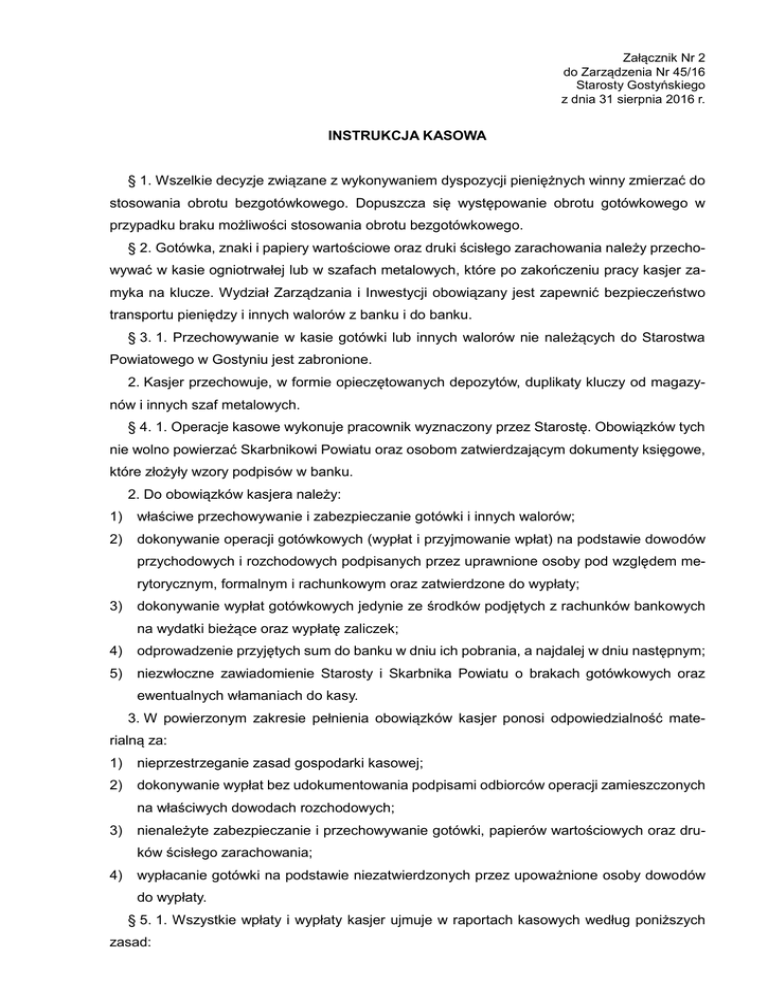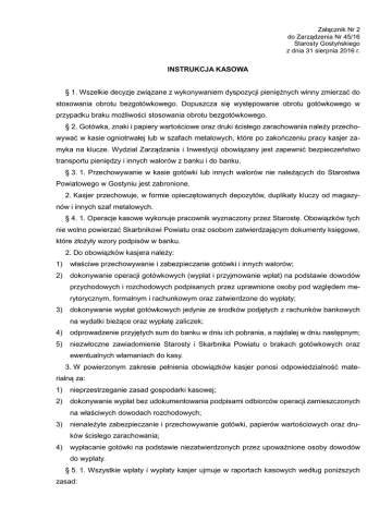 Załącznik Nr 2 do Zarządzenia Nr 45/16 Starosty Gostyńskiego z dnia 31 sierpnia 2016 r. INSTRUKCJA KASOWA § 1. Wszelkie decyzje związane z wykonywaniem dyspozycji pieniężnych winny zmierzać do stosowania obrotu bezgotówkowego. Dopuszcza się występowanie obrotu gotówkowego w przypadku braku możliwości stosowania obrotu bezgotówkowego. § 2. Gotówka, znaki i papiery wartościowe oraz druki ścisłego zarachowania należy przechowywać w kasie ogniotrwałej lub w szafach metalowych, które po zakończeniu pracy kasjer zamyka na klucze. Wydział Zarządzania i Inwestycji obowiązany jest zapewnić bezpieczeństwo transportu pieniędzy i innych walorów z banku i do banku. § 3. 1. Przechowywanie w kasie gotówki lub innych walorów nie należących do Starostwa Powiatowego w Gostyniu jest zabronione. 2. Kasjer przechowuje, w formie opieczętowanych depozytów, duplikaty kluczy od magazynów i innych szaf metalowych. § 4. 1. Operacje kasowe wykonuje pracownik wyznaczony przez Starostę. Obowiązków tych nie wolno powierzać Skarbnikowi Powiatu oraz osobom zatwierdzającym dokumenty księgowe, które złożyły wzory podpisów w banku. 2. Do obowiązków kasjera należy: 1) właściwe przechowywanie i zabezpieczanie gotówki i innych walorów; 2) dokonywanie operacji gotówkowych (wypłat i przyjmowanie wpłat) na podstawie dowodów przychodowych i rozchodowych podpisanych przez uprawnione osoby pod względem merytorycznym, formalnym i rachunkowym oraz zatwierdzone do wypłaty; 3) dokonywanie wypłat gotówkowych jedynie ze środków podjętych z rachunków bankowych na wydatki bieżące oraz wypłatę zaliczek; 4) odprowadzenie przyjętych sum do banku w dniu ich pobrania, a najdalej w dniu następnym; 5) niezwłoczne zawiadomienie Starosty i Skarbnika Powiatu o brakach gotówkowych oraz ewentualnych włamaniach do kasy. 3. W powierzonym zakresie pełnienia obowiązków kasjer ponosi odpowiedzialność mate- rialną za: 1) nieprzestrzeganie zasad gospodarki kasowej; 2) dokonywanie wypłat bez udokumentowania podpisami odbiorców operacji zamieszczonych na właściwych dowodach rozchodowych; 3) nienależyte zabezpieczanie i przechowywanie gotówki, papierów wartościowych oraz druków ścisłego zarachowania; 4) wypłacanie gotówki na podstawie niezatwierdzonych przez upoważnione osoby dowodów do wypłaty. § 5. 1. Wszystkie wpłaty i wypłaty kasjer ujmuje w raportach kasowych według poniższych zasad: 1) wpisanie do raportów kasowych wszystkich dowodów indywidualnie; 2) wpisanie sum podjętych z banku do kasy na podstawie dowodu przychodowego; 3) ustalanie w danym dniu pozostałości w kasie po zakończeniu przyjmowania wpłat i dokonywania wypłat; 4) dopuszcza się sporządzanie raportów kasowych zbiorczo za okresy kilkudniowe, nie dłuższe jednak niż 10 dni. 3. Raporty kasowe po uprzednim ich podpisaniu i wpisaniu ilości dowodów przychodowych i rozchodowych przekazuje kasjer do Wydziału Finansów za pokwitowaniem na kopii raportu kasowego. Załączone do raportu kasowego dowody wypłat muszą być zaopatrzone w klauzulę „wypłacono dnia” i podpis kasjera. 4. Prawidłowość sporządzania raportów kasowych sprawdza Naczelnik Wydziału Finansów. W szczególności ustala się, czy wykazane przez kasjera poszczególne przychody i rozchody są udokumentowane dowodami kasowymi, czy załączone dowody kasowe odpowiadają określonym wymogom oraz zaopatrzone są w odpowiednie klauzule i czy ustalono prawidłowy stan gotówki. § 6. 1. Od kasjera powinna być pobrana i złożona do akt osobowych deklaracja o odpowiedzialności materialnej o treści: „Przyjmuję do wiadomości, że ponoszę materialną odpowiedzialność za powierzone mi pieniądze i inne wartości. Zobowiązuje się do przestrzegania obowiązujących przepisów w zakresie operacji kasowych i ponoszę odpowiedzialność za ich naruszenie”. 2. Przejęcie obowiązków kasjera oraz każdorazowe przekazywanie kasy innej osobie należy dokonywać na podstawie protokołu zdawczo-odbiorczego. § 7. Kontroli kasy dokonuje Naczelnik Wydziału Finansów lub osoba przez niego upoważniona nie rzadziej niż raz w kwartale. § 8. 1. Czeki gotówkowe, rozrachunkowe, polecenia przelewu oraz inne dyspozycje pieniężne mogą podpisywać: 1) Starosta; 2) Wicestarosta; 3) Etatowy Członek Zarządu; 4) Skarbnik Powiatu; 5) Naczelnik Wydziału Finansów; 6) Sekretarz Powiatu; zgodnie ze złożonymi w banku wzorami podpisów. 2. Zabrania się podpisywania czeków i poleceń przelewu in blanco. 3. Osoby podpisujące czeki i polecenia przelewu są odpowiedzialne za zgodność ich treści z dowodami stanowiącymi podstawę ich wystawienia. § 9. Poza kasjerem lub osobą go zastępującą nie wolno powierzać przyjmowania wpłat innej osobie.