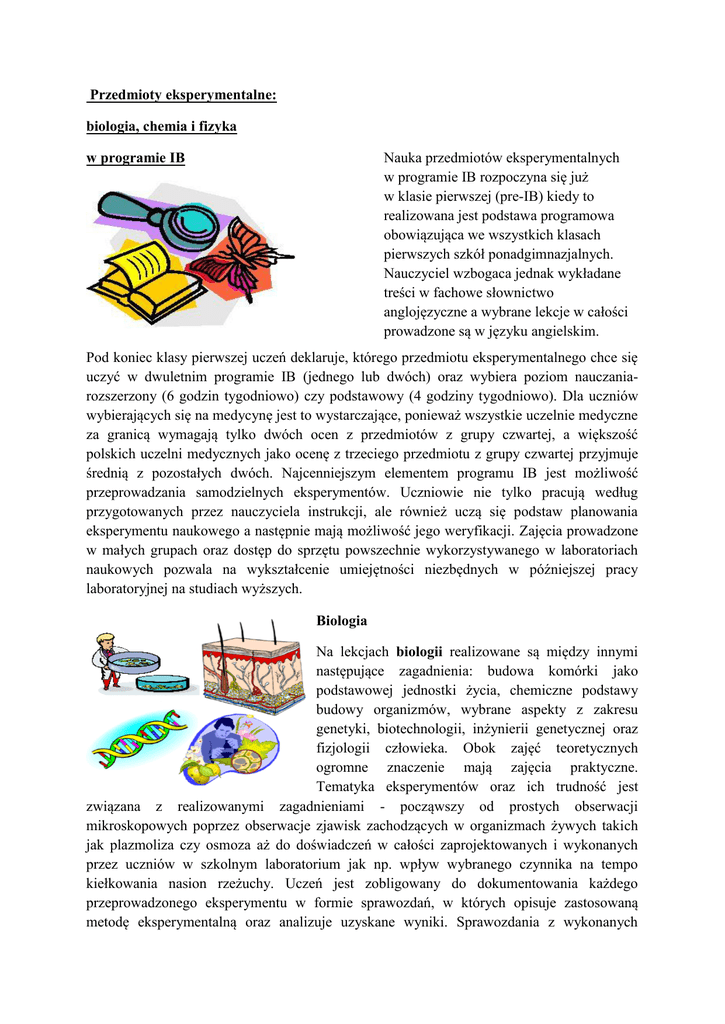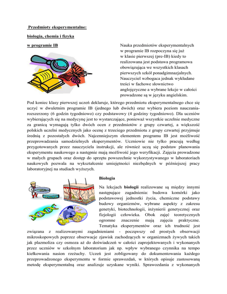 Przedmioty eksperymentalne: biologia, chemia i fizyka Nauka przedmiotów eksperymentalnych w programie IB rozpoczyna się już w klasie pierwszej (pre-IB) kiedy to realizowana jest podstawa programowa obowiązująca we wszystkich klasach pierwszych szkół ponadgimnazjalnych. Nauczyciel wzbogaca jednak wykładane treści w fachowe słownictwo anglojęzyczne a wybrane lekcje w całości prowadzone są w języku angielskim. w programie IB Pod koniec klasy pierwszej uczeń deklaruje, którego przedmiotu eksperymentalnego chce się uczyć w dwuletnim programie IB (jednego lub dwóch) oraz wybiera poziom nauczaniarozszerzony (6 godzin tygodniowo) czy podstawowy (4 godziny tygodniowo). Dla uczniów wybierających się na medycynę jest to wystarczające, ponieważ wszystkie uczelnie medyczne za granicą wymagają tylko dwóch ocen z przedmiotów z grupy czwartej, a większość polskich uczelni medycznych jako ocenę z trzeciego przedmiotu z grupy czwartej przyjmuje średnią z pozostałych dwóch. Najcenniejszym elementem programu IB jest możliwość przeprowadzania samodzielnych eksperymentów. Uczniowie nie tylko pracują według przygotowanych przez nauczyciela instrukcji, ale również uczą się podstaw planowania eksperymentu naukowego a następnie mają możliwość jego weryfikacji. Zajęcia prowadzone w małych grupach oraz dostęp do sprzętu powszechnie wykorzystywanego w laboratoriach naukowych pozwala na wykształcenie umiejętności niezbędnych w późniejszej pracy laboratoryjnej na studiach wyższych. Biologia Na lekcjach biologii realizowane są między innymi następujące zagadnienia: budowa komórki jako podstawowej jednostki życia, chemiczne podstawy budowy organizmów, wybrane aspekty z zakresu genetyki, biotechnologii, inżynierii genetycznej oraz fizjologii człowieka. Obok zajęć teoretycznych ogromne znaczenie mają zajęcia praktyczne. Tematyka eksperymentów oraz ich trudność jest związana z realizowanymi zagadnieniami - począwszy od prostych obserwacji mikroskopowych poprzez obserwacje zjawisk zachodzących w organizmach żywych takich jak plazmoliza czy osmoza aż do doświadczeń w całości zaprojektowanych i wykonanych przez uczniów w szkolnym laboratorium jak np. wpływ wybranego czynnika na tempo kiełkowania nasion rzeżuchy. Uczeń jest zobligowany do dokumentowania każdego przeprowadzonego eksperymentu w formie sprawozdań, w których opisuje zastosowaną metodę eksperymentalną oraz analizuje uzyskane wyniki. Sprawozdania z wykonanych doświadczeń sprawdzane są przez nauczyciela a następnie przez egzaminatorów z całego świata i stanowią jeden z komponentów końcowej oceny maturalnej. Chemia Program chemii w IB w niewielkim stopniu wykracza poza polski system nauczania (podobne zagadnienia m.in. budowa atomu, elementy kinetyki, chemia organiczna, elementy elektrochemii i termochemii, obliczenia stechiometryczne). Najważniejsze różnice dotyczą nie tyle treści, co typu zadań problemowych i możliwości eksperymentalnego sprawdzenia wielu informacji. Uczeń nie tyko zapoznaje się z podstawowym sprzętem laboratoryjnym i technikami badawczymi ale ma również sposobność wykorzystania nowych technologii informacyjnych (np. komputerowe wspomaganie pomiaru tzw data-logging czy symulacje) co pozwala lepiej zrozumieć wprowadzane zagadnienia. Punkty uzyskane za interpretację i ewaluację danych uzyskanych w eksperymentach są wliczane do oceny maturalnej. Poprzez realizację programu IB uczeń nie tylko wykorzystuje wiadomości i umiejętności zawarte w programie do rozwiązywania różnorodnych problemów, ale również - potrafi w pełni analizować jakościowe i ilościowe dane i dokonywać ich ewaluacji umie formułować problemy oraz dokonywać analizy nowych zjawisk szczegółowo wyjaśnia złożone procesy i zjawiska i stawia odpowiednie hipotezy potrafi komunikować się zwięźle i logicznie używając odpowiedniej terminologii chemicznej wykazuje się odpowiedzialnością, wytrwałością i dużymi umiejętnościami pracy w grupie w różnorodnych ćwiczeniach laboratoryjnych potrafi planować i bezpiecznie przeprowadzać eksperymenty chemiczne wykazując się oryginalnością i wnikliwością. Fizyka w IB to: - krok w kierunku zrozumienia otaczającego świata, - zadania prowokujące do nieszablonowego, łamiącego stereotypy myślenia, - samodzielnie przeprowadzone eksperymenty. Nauka fizyki w klasie IB obejmuje w większości takie same zagadnienia, jakie są realizowane w polskim systemie. Podstawowa różnica polega na typach zadań maturalnych, które w IB prowokują ucznia do myślenia nieszablonowego, łamiącego stereotypy i gruntownego zrozumienia zjawisk fizycznych w otaczającym świecie. Na lekcjach fizyki można się dowiedzieć, jak działa DVD, poznać zasadę działania okularów ze szkłami korekcyjnymi czy polaroidowymi czy też odkryć, co wynika z faktu, że w nocy jest ciemno. Ogromną zaletą programu jest też możliwość wyboru opcji, takich jak podstawy technologii cyfrowej, fizyka medyczna czy fizyka relatywistyczna w zależności od profilu i zainteresowań uczniów. Nowością jest tu również wspólny dla wszystkich przedmiotów z grupy 4 dział związany z ekologią. W jego ramach omawiamy najczęściej wykorzystywane źródła energii, ich zalety i wady dla środowiska oraz realność zagrożeń wynikających z globalnego ocieplenia. W ramach projektowanych przez siebie doświadczeń można zaspokoić ciekawość i sprawdzić postawione hipotezy, na przykład jak szybkość stygnięcia kawy zależy od jej gęstości, ciśnienia powietrza, czy zawartości tłuszczu. Egzamin maturalny z przedmiotów eksperymentalnych obejmuje trzy arkusze o różnym stopniu trudności sprawdzające inne zagadnienia realizowane w czasie zajęć. Po ukończeniu dwuletniego kursu w programie IB uczeń nie tylko sprawnie posługuje się specjalistyczną terminologią anglojęzyczną z różnych dziedzin biologii, 