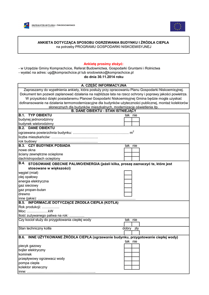 ANKIETA DOTYCZĄCA SPOSOBU OGRZEWANIA BUDYNKU I ŹRÓDŁA CIEPŁA na potrzeby PROGRAMU GOSPODARKI NISKOEMISYJNEJ Ankietę prosimy złożyć: - w Urzędzie Gminy Komprachcice, Referat Budownictwa, Gospodarki Gruntami i Rolnictwa - wysłać na adres: [email protected] lub [email protected] do dnia 30.11.2014 roku A. CZĘŚĆ INFORMACYJNA Zapraszamy do wypełnienia ankiety, która posłuży przy opracowaniu Planu Gospodarki Niskoemisyjnej. Dokument ten pozwoli zaplanować działania na najbliższe lata na rzecz ochrony i poprawy jakości powietrza. W przyszłości dzięki posiadanemu Planowi Gospodarki Niskoemisyjnej Gmina będzie mogła uzyskać dofinansowanie na działania termomodernizacyjne dla budynków użyteczności publicznej, montaż kolektorów słonecznych dla budynków mieszkalnych, modernizację oświetlenia itp. B. DANE OBIEKTU - STAN ISTNIEJĄCY B.1. TYP OBIEKTU tak nie budynej jednorodzinny budynek wielorodzinny B.2. DANE OBIEKTU ogrzewana powierzchnia budynku: ………………………………………… m2 liczba mieszkańców: …………………………………. rok budowy: …………………………………………… B.3. CZY BUDYNEK POSIADA tak nie nowe okna ściany zewnętrzne ocieplone dach/stropodach ocieplony B.4. STOSOWANE OBECNIE PALIWO/ENERGIA (jeżeli kilka, proszę zaznaczyć te, które jest stosowane w większości) węgiel (miał) olej opałowy energia elektryczna gaz sieciowy gaz propan-butan drewno inne (jakie): ………………………………………………………………………… B.5. INFORMACJE DOTYCZĄCE ŹRÓDŁA CIEPŁA (KOTŁA) Rok produkcji: …………… Moc: ………………kW Ilość zużywanego paliwa na rok: …………. Czy kocioł służy do przygotowania ciepłej wody tak nie Stan techniczny kotła dobry zły B.6. INNE UŻYTKOWANE ŹRÓDŁA CIEPŁA (ogrzewanie budynku, przygotowanie ciepłej wody) tak nie piecyk gazowy bojler elektryczny kominek przepływowy ogrzewacz wody pompa ciepła kolektor słoneczny inne: ………………………………………………….. C. DANE OBIEKTU - STAN PLANOWANY C.1. ZMIANY DOTYCZĄCE SYSTEMU GRZEWCZEGO tak nie Czy planują Państwo przeprowadzenie modernizacji polegajacej na zmianie systemu grzewczego? Planowany termin przeprowadzenia modernizacji w roku: 2015 2016 2017 później Planowany sposób ogrzewania budynku węgiel - ekogroszek gaz sieciowy gaz propan-butan energia elektryczna olej opałowy biomasa (m.in. pelety, drewno) energia elektryczna kolektory słoneczne pompa ciepła inne: ………………………………………………….. C.2. PRACE TERMOMODERNIZACYJNE tak nie Czy planują Państwo przeprowadzenie termomodernizacji polegajacej na: wymianie okien docieplenie ścian docieplenie dachu/stropodachu …………………………………. Data