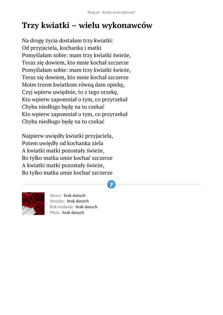 iSing.pl - Każdy może śpiewać! Trzy kwiatki – wielu wykonawców Na drogę życia dostałam trzy kwiatki: Od przyjaciela, kochanka i matki Pomyślałam sobie: mam trzy kwiatki świeże, Teraz się dowiem, kto mnie kochał szczerze Pomyślałam sobie: mam trzy kwiatki świeże, Teraz się dowiem, kto mnie kochał szczerze Moim trzem kwiatkom równą dam opiekę, Czyj wpierw uwiędnie, to z tego orzekę, Kto wpierw zapomniał o tym, co przyrzekał Chyba niedługo będę na to czekać Kto wpierw zapomniał o tym, co przyrzekał Chyba niedługo będę na to czekać Najpierw uwiędły kwiatki przyjaciela, Potem uwiędły od kochanka ziela A kwiatki matki pozostały świeże, Bo tylko matka umie kochać szczerze A kwiatki matki pozostały świeże, Bo tylko matka umie kochać szczerze Słowa: brak danych Muzyka: brak danych Rok wydania: brak danych Płyta: brak danych