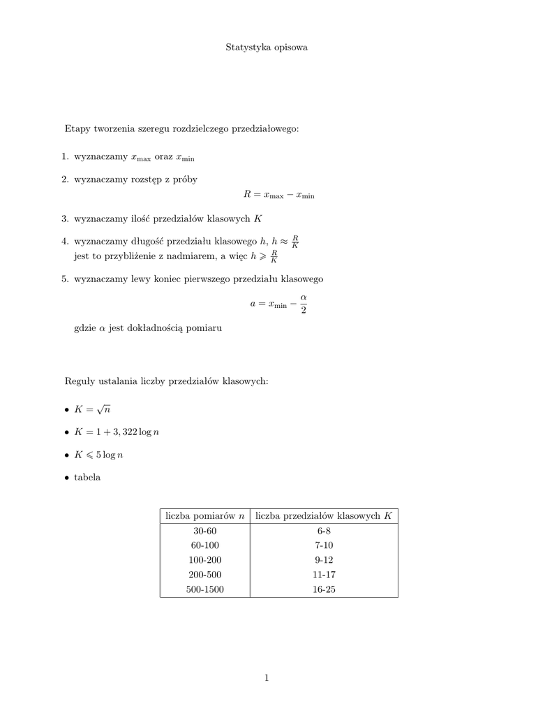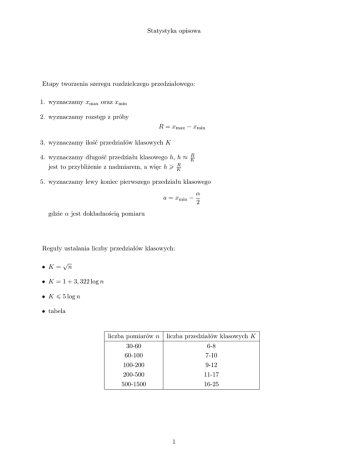 Statystyka opisowa Etapy tworzenia szeregu rozdzielczego przedziałowego: 1. wyznaczamy xmax oraz xmin 2. wyznaczamy rozstęp z próby R = xmax − xmin 3. wyznaczamy ilość przedziałów klasowych K 4. wyznaczamy długość przedziału klasowego h, h ≈ R jest to przybliżenie z nadmiarem, a więc h K R K 5. wyznaczamy lewy koniec pierwszego przedziału klasowego a = xmin − α 2 gdzie α jest dokładnością pomiaru Reguły ustalania liczby przedziałów klasowych: • K= √ n • K = 1 + 3, 322 log n • K ¬ 5 log n • tabela liczba pomiarów n liczba przedziałów klasowych K 30-60 60-100 100-200 200-500 500-1500 6-8 7-10 9-12 11-17 16-25 1 Miary statystyczne: 1. miary położenia a) średnia z próby x= n 1X xi - szereg wyliczający n i=1 x= n 1X xi ni - szereg rozdzielczy punktowy n i=1 n 1X x∗ ni - szereg rozdzielczy przedziałowy, gdzie x∗i - środek przedziału klasowego x= n i=1 i b) moda (dominanta) - wartość najczęstsza • szereg wyliczający i szereg rozdzielczy punktowy: moda to wartość najczęstsza, o ile nie jest to wartość skrajna (wówczas moda jest nieokreślona) • szereg rozdzielczy przedziałowy: M o = xm + (nm − nm−1 ) h (nm − nm−1 ) + (nm − nm+1 ) gdzie xm - lewy koniec przedziału z modą (czyli przedziału o największej liczebności, ale różnego od przedziału pierwszego i ostatniego), h - długość przedziału z modą, nm - liczebność przedziału z modą, nm−1 - liczebność przedziału poprzedzającego przedział z modą, nm+1 - liczebność przedziału następującego po przedziale z modą c) mediana - wartość środkowa w uporządkowanej próbie • szereg wyliczający i szereg rozdzielczy punktowy: Me = x ) ( n+1 2 1 x( n ) + x( n +1) 2 2 2 , gdy n jest nieparzyste , gdy n jest parzyste tzn. mediana jest to środkowa liczba, gdy n jest liczbą nieparzystą, albo średnia arytmetyczna dwóch środkowych liczb, gdy n jest liczbą parzystą • szereg rozdzielczy przedziałowy: M e = xM e + h nM e X n k−1 − ni 2 i=1 ! gdzie xM e - lewy koniec przedziału z medianą, h - długość przedziału z medianą, nM e - liczebność przedziału z medianą, k - numer przedziału zawierającego medianę 2 d) kwartyle (dolny Q1 i górny Q3 ) - wartości, które dzielą uporządkowaną próbę w stosunku 1:3 i 3:1 • szereg rozdzielczy przedziałowy: Q1 = xQ1 h + nQ1 X n k−1 − ni 4 i=1 Q3 = xQ3 h + nQ3 X 3n k−1 − ni 4 i=1 ! ! gdzie xQ1 - lewy koniec przedziału zawierającego Q1 , h - długość przedziału zawierającego Q1 , nQ1 - liczebność przedziału zawierającego Q1 , k - numer przedziału zawierającego Q1 2. miary rozproszenia (zmienności, rozrzutu) a) rozstęp R = xmax − xmin b) wariancja s2 = n 1X (xi − x)2 - szereg wyliczający n i=1 s2 = n 1X (xi − x)2 ni - szereg rozdzielczy punktowy n i=1 n 1X (x∗ − x)2 ni - szereg rozdzielczy przedziałowy, gdzie x∗i - środek przedziału klasowego s = n i=1 i 2 c) odchylenie standardowe √ s= s2 typowy przedział zmienności (x − s; x + s) d) odchylenie przeciętne od średniej n 1X |xi − x| - szereg wyliczający d1 = n i=1 d1 = n 1X |xi − x|ni - szereg rozdzielczy punktowy n i=1 d1 = n 1X |x∗ − x|ni - szereg rozdzielczy przedziałowy, gdzie x∗i - środek przedziału klasowego n i=1 i e) odchylenie przeciętne od mediany d2 = n 1X |xi − M e| - szereg wyliczający n i=1 d2 = n 1X |xi − M e|ni - szereg rozdzielczy punktowy n i=1 d2 = n 1X |x∗ − M e|ni - szereg rozdzielczy przedziałowy, gdzie x∗i - środek przedziału klasowego n i=1 i 3 f) odchylenie ćwiartkowe Q= 1 (Q3 − Q1 ) 2 g) współczynnik zmienności V = s · 100% x H= d1 · 100% x h) współczynnik nierównomierności 3. miary asymetrii a) wskaźnik asymetrii Ws = x − M o b) współczynnik asymetrii A= M3 , s3 gdzie M3 = n 1X (xi − x)3 - szereg wyliczający n i=1 M3 = n 1X (xi − x)3 ni - szereg rozdzielczy punktowy n i=1 M3 = n 1X (x∗ − x)3 ni - szereg rozdzielczy przedziałowy, gdzie x∗i - środek przedziału klasowego n i=1 i 4. miary koncentracji a) współczynnik skupienia (kurtoza) K= M4 , s4 gdzie n 1X M4 = (xi − x)4 - szereg wyliczający n i=1 M4 = n 1X (xi − x)4 ni - szereg rozdzielczy punktowy n i=1 M4 = n 1X (x∗ − x)4 ni - szereg rozdzielczy przedziałowy, gdzie x∗i - środek przedziału klasowego n i=1 i b) eksces q =K −3 4