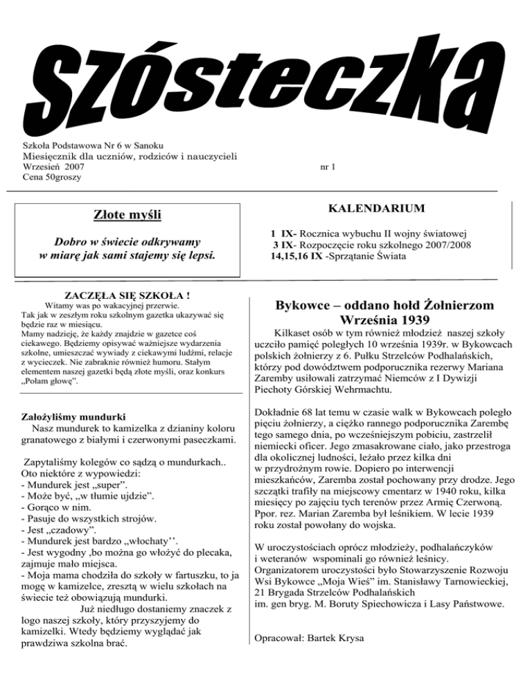 Szkoła Podstawowa Nr 6 w Sanoku Miesięcznik dla uczniów, rodziców i nauczycieli Wrzesień 2007 Cena 50groszy Złote myśli Dobro w świecie odkrywamy w miarę jak sami stajemy się lepsi. ZACZĘŁA SIĘ SZKOŁA ! Witamy was po wakacyjnej przerwie. Tak jak w zeszłym roku szkolnym gazetka ukazywać się będzie raz w miesiącu. Mamy nadzieję, że każdy znajdzie w gazetce coś ciekawego. Będziemy opisywać ważniejsze wydarzenia szkolne, umieszczać wywiady z ciekawymi ludźmi, relacje z wycieczek. Nie zabraknie również humoru. Stałym elementem naszej gazetki będą złote myśli, oraz konkurs „Połam głowę”. Założyliśmy mundurki Nasz mundurek to kamizelka z dzianiny koloru granatowego z białymi i czerwonymi paseczkami. Zapytaliśmy kolegów co sądzą o mundurkach.. Oto niektóre z wypowiedzi: - Mundurek jest „super”. - Może być, „w tłumie ujdzie”. - Gorąco w nim. - Pasuje do wszystkich strojów. - Jest „czadowy”. - Mundurek jest bardzo „włochaty’’. - Jest wygodny ,bo można go włożyć do plecaka, zajmuje mało miejsca. - Moja mama chodziła do szkoły w fartuszku, to ja mogę w kamizelce, zresztą w wielu szkołach na świecie też obowiązują mundurki. Już niedługo dostaniemy znaczek z logo naszej szkoły, który przyszyjemy do kamizelki. Wtedy będziemy wyglądać jak prawdziwa szkolna brać. nr 1 KALENDARIUM 1 IX- Rocznica wybuchu II wojny światowej 3 IX- Rozpoczęcie roku szkolnego 2007/2008 14,15,16 IX -Sprzątanie Świata Bykowce – oddano hołd Żołnierzom Września 1939 Kilkaset osób w tym również młodzież naszej szkoły uczciło pamięć poległych 10 września 1939r. w Bykowcach polskich żołnierzy z 6. Pułku Strzelców Podhalańskich, którzy pod dowództwem podporucznika rezerwy Mariana Zaremby usiłowali zatrzymać Niemców z I Dywizji Piechoty Górskiej Wehrmachtu. Dokładnie 68 lat temu w czasie walk w Bykowcach poległo pięciu żołnierzy, a ciężko rannego podporucznika Zarembę tego samego dnia, po wcześniejszym pobiciu, zastrzelił niemiecki oficer. Jego zmasakrowane ciało, jako przestroga dla okolicznej ludności, leżało przez kilka dni w przydrożnym rowie. Dopiero po interwencji mieszkańców, Zaremba został pochowany przy drodze. Jego szczątki trafiły na miejscowy cmentarz w 1940 roku, kilka miesięcy po zajęciu tych terenów przez Armię Czerwoną. Ppor. rez. Marian Zaremba był leśnikiem. W lecie 1939 roku został powołany do wojska. W uroczystościach oprócz młodzieży, podhalańczyków i weteranów wspominali go również leśnicy. Organizatorem uroczystości było Stowarzyszenie Rozwoju Wsi Bykowce „Moja Wieś” im. Stanisławy Tarnowieckiej, 21 Brygada Strzelców Podhalańskich im. gen bryg. M. Boruty Spiechowicza i Lasy Państwowe. Opracował: Bartek Krysa Sprzątamy Świat Akcja "Sprzątanie Świata" (Clean Up the World) została wymyślona w 1989 roku w Australii przez biznesmena i żeglarza Iana Kiernana, który bardzo chciał poprawić stan Zatoki Sydnejskiej, nad którą mieszkał. W tym celu udało mu się zmobilizować 40 tys. osób, które pracowały społecznie nad oczyszczaniem zatoki z całych ton plastikowych śmieci, butelek a nawet wraków samochodów. W kolejnych latach akcja roztaczała coraz szersze kręgi, a w 1993 roku za sprawą mieszkającej w Australii pani Miry Stanisławskiej-Meysztowicz trafiła również do Polski, gdzie jej koordynacją od lat zajmuje się Fundacja "Nasza Ziemia". W innych krajach akcja nie przyjęła się tak dobrze jak w Polsce, gdzie w 2003 roku brało w niej udział ok. 1,5 miliona . osób (dla porównania: w Niemczech - 35 tys. osób, we Francji - kilka tysięcy, w Holandii - kilkaset osób). Tegoroczna akcja "Sprzątanie Świata Polska 2007" odbyła się w dniach 14, 15 i 16 września. Tym razem hasłem przewodnim było: Oszczędzaj. Wyłączaj. Odzyskuj. Świeć przykładem! W tym roku szczególną uwagę zwracamy na oszczędzanie. Oszczędzanie surowców naturalnych, energii, materiałów, na przeciwdziałanie zmianom klimatycznym i na to, co każdy z nas może zrobić sam w domu aby środowisku było lżej. W naszej szkole akcja Sprzątania Świata zaplanowana była na sobotę. Niestety, pogoda pokrzyżowała nasze plany. Jeżeli zrobi się odrobinę cieplej zaraz wyruszamy posprzątać nasze osiedle. Ciekawe pytania i odpowiedzi. 1.Skąd się bierze woda na pustyni? Deszcze na pustyniach to wielka rzadkość. Jednak głęboko pod powierzchnią piasku jest woda, która pochodzi ze stron, w których padające częste deszcze przenikają pod ziemię. Ażeby dostać się do tej wody, trzeba wykopać głęboką studnię. W niektórych miejscach jednakże woda sama się przebija na powierzchnię. Takie miejsca na pustyni nazywane są oazami. 2.Jak powstaje oaza? Na ogół woda znajduje się głęboko pod piaskiem pustyni. Jednak czasami wodom podziemnym udaje się przedostać na powierzchnię i utworzyć sadzawkę. W takim miejscu od razu zmienia się krajobraz. W pobliżu często osiedlają się ludzie, gdyż dzięki wodzie mogą uprawiać różne rośliny dostarczające pożywienia. 3.Jak działa studnia na pustyni? Po wykopaniu studni wodę czerpie się wyciągiem z pomocą wielbłąda. Najpierw napełnia się zbiornik przy studni, a później woda z niego doprowadzona jest na pola uprawne. Opracowała: Basia Dżugan, Jowita Jaklik POŁAM GŁOWĘ Cały rok szkolny w gazetce ukazywać się będą zagadki i łamigłówki. Kto zbierze pięć prawidłowych rozwiązań i przyniesie je w czerwcu do naszej redakcji , weźmie udział w losowaniu atrakcyjnych nagród. m j ó ż m p m d u e s o a a g e c s t ł ś r ł s h i k ę l a a z o e o d a s r c m ń z z k o o z o s a i i l s k r z k e c z a a Wykreśl wyrazy: maślaki, jesień, kozak, żołędzie, parasol, deszcz, muchomor, rosa, mgła, pozostałe litery utworzą rozwiązanie naszej zagadki. HUMOR Na historii: - Dlaczego w powstaniu styczniowym najwięcej było chłopów? - Bo chłopi 