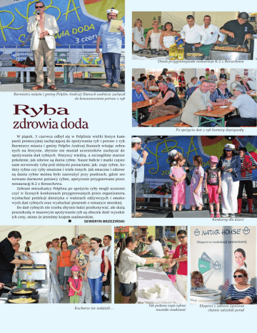 Dania przygotowywała restauracja K-2 z Borzechowa Burmistrz miasta i gminy Pelplin Andrzej Stanuch osobiście zachęcał do konsumowania potraw z ryb Ryba zdrowia doda Po spożyciu dań z ryb humory dopisywały W piątek, 3 czerwca odbył się w Pelplinie wielki festyn kampanii promocyjnej zachęcającej do spożywania ryb i potraw z ryb. Burmistrz miasta i gminy Pelplin Andrzej Stanuch witając zebranych na festynie, zbytnio nie musiał uczestników zachęcać do spożywania dań rybnych. Wszyscy wiedzą, a szczególnie starsze pokolenie, jak zdrowe są dania rybne. Nasze babcie i matki często nam serwowały rybę pod różnymi postaciami, jak: zupy rybne, kotlety rybne czy ryby smażone i wiele innych. Jak smaczne i zdrowe są dania rybne można było zauważyć przy punktach, gdzie serwowano darmowe potrawy rybne, apetycznie przygotowane przez restaurację K-2 z Borzechowa. Zebrani mieszkańcy Pelplina po spożyciu ryby mogli uczestniczyć w licznych konkursach przygotowanych przez organizatora, wysłuchać prelekcji dietetyka o walorach odżywczych i smakowych dań rybnych oraz wysłuchać piosenek o tematyce morskiej. Do dań rybnych nie trzeba zbytnio ludzi przekonywać, ale dużą przeszkodą w masowym spożywaniu ryb są obecnie dość wysokie ich ceny, mimo że jesteśmy krajem nadmorskim. Seweryn BrzezińSki  Kucharze nie nadążali… 8 INFORMATOR PELPLIŃSKI Konkursy dla dzieci Tak podana zupa rybna musiała smakować Eksperci z zakresu żywienia chętnie udzielali porad
