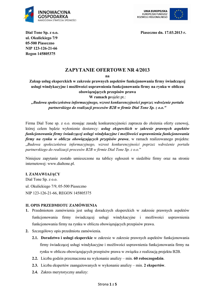 Dial Tone Sp. z o.o. ul. Okulickiego 7/9 05-500 Piaseczno NIP 123-126-21-66 Regon 145805375 Piaseczno dn. 17.03.2013 r. ZAPYTANIE OFERTOWE NR 4/2013 na Zakup usług eksperckich w zakresie prawnych aspektów funkcjonowania firmy świadczącej usługi windykacyjne i możliwości usprawnienia funkcjonowania firmy na rynku w obliczu obowiązujących przepisów prawa W ramach projekt pt.: „Budowa społeczeństwa informacyjnego, wzrost konkurencyjności poprzez wdrożenie portalu partnerskiego do realizacji procesów B2B w firmie Dial Tone Sp. z o.o." Firma Dial Tone sp. z o.o. stosując zasadę konkurencyjności zaprasza do złożenia oferty cenowej, której celem będzie wyłonienie dostawcy: usług eksperckich w zakresie prawnych aspektów funkcjonowania firmy świadczącej usługi windykacyjne i możliwości usprawnienia funkcjonowania firmy na rynku w obliczu obowiązujących przepisów prawa, w ramach realizowanego projektu: „Budowa społeczeństwa informacyjnego, wzrost konkurencyjności poprzez wdrożenie portalu partnerskiego do realizacji procesów B2B w firmie Dial Tone Sp. z o.o.” Niniejsze zapytanie zostało umieszczone na tablicy ogłoszeń w siedzibie firmy oraz na stronie internetowej: www.dialtone.pl. I. ZAMAWIAJĄCY Dial Tone Sp. z o.o. ul. Okulickiego 7/9, 05-500 Piaseczno NIP 123-126-21-66, REGON 145805375 II. OPIS PRZEDMIOTU ZAMÓWIENIA 1. Przedmiotem zamówienia jest usług doradczych eksperckich w zakresie prawnych aspektów funkcjonowania firmy świadczącej usługi windykacyjne i możliwości usprawnienia funkcjonowania firmy na rynku w obliczu obowiązujących przepisów prawa. 2. Szczegółowy opis przedmiotu zamówienia. 2.1. Doradztwo i usługi eksperckie w zakresie w zakresie prawnych aspektów funkcjonowania firmy świadczącej usługi windykacyjne i możliwości usprawnienia funkcjonowania firmy na rynku w obliczu obowiązujących przepisów prawa w związku z realizacją projektu B2B. 2.2. Liczba godzin przeznaczona na wykonanie analizy – min. 60 roboczogodzin. 2.3. Liczba ekspertów zaangażowanych w wykonanie analizy – min. 2 ekspertów. 2.4. Zakres merytoryczny analizy: Strona 1 z 5 2.4.1. Definicje (zgodnie z obowiązującym prawem). 2.4.2. Obowiązujące regulacje prawne na rynku usług windykacyjnych. 2.4.3. Analiza prawnych aspektów funkcjonowania firmy w kontekście obowiązującego prawa. 2.4.4. Możliwości ochrony interesów klienta/dłużnika w obliczu obowiązującego prawa. 2.4.5. Możliwości ochrony interesów partnera biznesowego w obliczu obowiązującego prawa. 2.4.6. Postępowanie w procesie windykacji. 2.4.7. Postępowanie z danymi osobowymi. 2.4.8. Dobre praktyki w procesie windykacji – zalecenia. 2.4.9. Wnioski. 2.4.10. Rekomendacje (procedury).. 3. Zamawiający nie dopuszcza możliwości składania ofert częściowych. 4. Zamawiający nie dopuszcza możliwości powierzenia części lub całości zamówienia podwykonawcy/om. III. TERMIN SKŁADANIA OFERT I WYKONANIA ZAMÓWIENIA 1. Termin składania ofert upływa dnia 08.04.2013 roku o godzinie 16.00. 2. Termin wykonania zamówienia do 30.05.2013 roku. IV. OPIS SPOSOBU PRZYGOTOWANIA OFERTY 1. Oferent powinien złożyć ofertę na formularzu załączonym do niniejszego zapytania (zał. nr 1 – wzór formularza ofertowego). 2. Oferta powinna być: 2.1. Opatrzona pieczątką firmową. 2.2. Zawierać datę sporządzenia oferty. 2.3. Zawierać nazwę firmy, adres, numer telefonu, faksu, numer NIP, REGON, informację o wpisaniu do CEiDG lub nr KRS. 2.4. Podpisana w sposób czytelny przez oferenta. 2.5. Powinna zawierać termin ważności oferty min. 30 dni od dnia złożenia oferty. V. MIEJSCE ORAZ TERMIN SKŁADANIA OFERT 1. Oferta powinna być przesłana przesyłką pocztową, kurierską lub dostarczona osobiście na adres: Dial Tone Sp. z o.o., ul. Okulickiego 7/9, 05-500 Piaseczno do dnia 08.04.2013 roku do godziny 16.00. 2. Oferta składana w postaci tradycyjnej przesyłki pocztowej, przesyłki kurierskiej lub składana osobiście winna zostać złożona w zaklejonej kopercie z dopiskiem "Zapytanie ofertowe nr 4/2013". Strona 2 z 5 3. O kwalifikowalności złożonej oferty w ramach Zapytania ofertowego nr 4/2013 decyduje data wpływu oferty do Zamawiającego. 4. Oferty złożone po terminie nie będą rozpatrywane. 5. Oferent przed upływem terminu składania ofert może swoją ofertę wycofać. 6. W toku badania i oceny ofert Zamawiający może żądać od oferentów wyjaśnień dotyczących treści złożonych ofert. VI. OCENA OFERT 1. Wybór najkorzystniejszej oferty nastąpi w oparciu o następujące kryteria: Lp. 1. Nazwa kryterium Cena Waga kryterium Liczba punktów 100% 100 Razem 100 2. Sposób wyliczania kryterium CENA: C = (Cmin / Cof) x 100, gdzie: Cmin - najniższa spośród wszystkich złożonych ofert, Cof - zaoferowana cena rozpatrywanej oferty, C - liczba punktów przyznanych danej ofercie. 3. Cena oferty uwzględniająca wszystkie zobowiązania, musi być podana w PLN w wartościach netto, VAT oraz brutto. 4. Cena podana w ofercie powinna obejmować wszystkie koszty i składniki związane z wykonaniem zamówienia oraz uwzględniać warunki stawiane przez Zamawiającego. 5. Termin realizacji zamówienia nie podlega negocjacji. VII. INFORMACJE DOTYCZĄCE WYBORU NAJKORZYSTNIEJSZEJ OFERTY 1. Ocena ofert zostanie dokonana w dniu 09.04.2013 roku do godziny 11.30. 2. Wyniki i wybór najkorzystniejszej oferty zostanie ogłoszony o godzinie 12.00 w siedzibie firmy Zamawiającego. VIII. DODATKOWE INFORMACJE 1. Dodatkowych informacji udziela Pani Barbara Kiełt-Wielgosz pod numerem telefonu (22) 270 09 73, adres e-mail: [email protected]. IX. ZASTRZEŻENIA 1. Firma Dial Tone Sp. z o.o. zastrzega sobie prawo do odwołania zaproszenia i/lub odstąpienia od ewentualnych negocjacji bez podania przyczyn. Z tego tytułu nie przysługują żadne roszczenia wobec zapraszającego. Strona 3 z 5 2. Jeżeli firma, której oferta została wybrana uchyla się od zawarcia umowy, zamawiaj