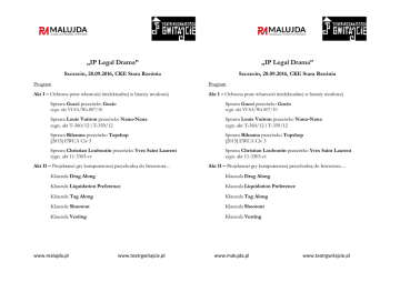 „IP Legal Drama” „IP Legal Drama” Szczecin, 28.09.2016, CKE Stara Rzeźnia Szczecin, 28.09.2016, CKE Stara Rzeźnia Program Program Akt I – Ochrona praw własności intelektualnej w branży modowej Akt I – Ochrona praw własności intelektualnej w branży modowej Sprawa Gucci przeciwko Gucio Sprawa Gucci przeciwko Gucio Sprawa Louis Vuitton przeciwko Nanu‑Nana sygn. akt T‑360/12 i T‑359/12 Sprawa Louis Vuitton przeciwko Nanu‑Nana sygn. akt T‑360/12 i T‑359/12 Sprawa Rihanna przeciwko Topshop [2015] EWCA Civ 3 Sprawa Rihanna przeciwko Topshop [2015] EWCA Civ 3 Sprawa Christian Louboutin przeciwko Yves Saint Laurent sygn. akt 11-3303-cv Sprawa Christian Louboutin przeciwko Yves Saint Laurent sygn. akt 11-3303-cv sygn. akt VI SA/Wa 807/10 sygn. akt VI SA/Wa 807/10 Akt II – Projektanci gry komputerowej przychodzą do Inwestora… Akt II – Projektanci gry komputerowej przychodzą do Inwestora… Klauzula Drag Along Klauzula Drag Along Klauzula Liquidation Preference Klauzula Liquidation Preference Klauzula Tag Along Klauzula Tag Along Klauzula Shootout Klauzula Shootout Klauzula Vesting Klauzula Vesting www.malujda.pl www.teatrgwitajcie.pl www.malujda.pl www.teatrgwitajcie.pl