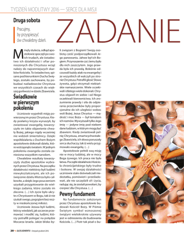TYDZIEŃ MODLITWY 2016 — SERCE DLA MISJI Druga sobota Pracujmy, by przyspieszyć ów chwalebny dzień. M inęły stulecia, odkąd apostołowie spoczęli po swoich trudach, ale świadectwo ich działalności i ofiar ponoszonych dla Chrystusa wciąż należy do najcenniejszych skarbów Kościoła. To świadectwo, spisane pod kierunkiem Ducha Świętego, zostało zachowane, by pobudzać naśladowców Chrystusa we wszystkich czasach do większej gorliwości w dziele Zbawiciela. Świadkowie w pierwszym pokoleniu Uczniowie wypełnili misję powierzoną im przez Chrystusa. Kiedy posłańcy krzyża wyruszyli, by zwiastować ewangelię, towarzyszyło im takie objawienie chwały Bożej, jakiego nigdy wcześniej nie widzieli śmiertelnicy. Dzięki współdziałaniu z Duchem Bożym apostołowie dokonali dzieła, które wstrząsnęło światem. W jednym pokoleniu ewangelia została zaniesiona wszystkim narodom. Chwalebne rezultaty towarzyszyły służbie apostołów wybranych przez Chrystusa. Na początku działalności niektórzy byli ludźmi niewykształconymi, ale ich poświęcenie dziełu Mistrza było całkowite, a dzięki Jego pouczeniom uzyskali przygotowanie do wielkiego zadania, które zostało im zlecone. (…) Ich życie było ukryte z Chrystusem w Bogu, tak iż nie szukali swego, pogrążeni bez reszty w nieskończonej miłości. Uczniowie Jezusa byli ludźmi, którzy wiedzieli, jak szczerze przemawiać i modlić się, ludźmi, którzy potrafili polegać na potędze Mocarza Izraela. Jakże blisko by20 GŁOS ADWENTU – listopad-grudzień 2016 ZADANIE li związani z Bogiem! Swoją osobistą cześć podporządkowali Jego panowaniu. Jahwe był ich Bogiem. Przynoszenie czci Jemu było dla nich zaszczytem. Jego prawda była ich prawdą. Boleśnie odczuwali każdy atak na ewangelię i ze wszystkich sił walczyli po stronie Chrystusa. Potrafili głosić Słowo żywota, gdyż otrzymali niebiańskie namaszczenie. Wiele oczekiwali i dlatego wiele dokonali. Chrystus objawił im siebie i od Niego oczekiwali kierownictwa. Ich zrozumienie prawdy i siła do odpierania przeciwników były proporcjonalne do ich uległości wobec woli Bożej. Jezus Chrystus — mądrość i moc Boża — był tematem ich rozmów. Wywyższali tylko Jego imię — jedyne imię pod niebem dane ludziom, w którym mogą być zbawieni. Kiedy zwiastowali pełnię Chrystusa, zmartwychwstałego Zbawiciela, ich słowa poruszały serca słuchaczy, tak iż wielu przyjmowało ewangelię. (…) Apostołowie pełnili swą misję nie w mocy ludzkiej, ale w mocy Boga żywego. Ich praca nie była łatwa. Początki działalności Kościoła chrześcijańskiego były trudne i bolesne. W swojej działalności uczniowie stale doświadczali niedostatku, pomówień i prześladowań, ale nie szczędzili sił i życia, radując się, że zostali powołani, by cierpieć dla Chrystusa. (…) Pewny fundament Na fundamencie założonym przez Chrystusa apostołowie budowali Kościół Boży. W Piśmie Świętym symbol wznoszonej świątyni wielokrotnie używany jest w odniesieniu do budowania Kościoła. (…) Piotr tak pisał o bu- TYDZIEŃ MODLITWY 2016 — SERCE DLA MISJI WYKONANE dowie tej świątyni: „Przystąpcie do niego, do kamienia żywego, przez ludzi wprawdzie odrzuconego, lecz przez Boga wybranego jako kosztowny. I wy sami jako kamienie żywe budujcie się w dom duchowy, w kapłaństwo święte, aby składać duchowe ofiary przyjemne Bogu przez Jezusa Chrystusa” (1 P 2,4-5). Apostołowie pracowali w kamieniołomie żydowsko-pogańskiego świata, wydobywając kamienie i budując fundamenty. W swoim liście do wierzących w Efezie Paweł napisał: „Tak więc już nie jesteście obcymi i przychodniami, lecz współobywatelami świętych i domownikami Boga, zbudowani na fundamencie apostołów i proroków, którego kamieniem węgielnym jest sam Chrystus Jezus, na którym cała budowa mocno spojona rośnie w przybytek święty w Panu, na którym i wy się wespół budujecie na mieszkanie Boże w Duchu” (Ef 2,19-22). (…) Apostołowie budowali na pewnej podstawie — na Skale Wiecznej. Na tej podstawie układali kamienie, które wydobywali ze świata. Praca budowniczych posuwała się naprzód nie bez przeszkód. Ich dzieło było niezwykle trudne wskutek sprzeciwu wrogów Chrystusa. © Depositedhar/Bank zdjęć Photogenica Niczego świat nie potrzebuje tak bardzo, jak objawienia w ludziach miłości Zbawiciela Srogie prześladowanie Jeden po drugim najlepsi budowniczowie padali z ręki wroga. Szczepan został ukamienowany, Jakub — ścięty mieczem, podobnie Paweł, Piotr — ukrzyżowany, Jan — zesłany. Jednak Kościół wzrastał. Nowi pracownicy zajęli miejsce tych, którzy odeszli, i kamień po kamieniu był dodawany do budowli. Tak stopniowo wznoszono świątynię Kościoła Bożego. Wieki zaciekłych prześladowań nastały wraz z powstaniem Kościoła chrześcijańskiego, ale nigdy nie brakło ludzi gotowych podjąć dzieło budowania świątyni Bożej i ceniących je ponad własne życie. (...) Wróg sprawiedliwości nie pominął niczego w swoich wysiłkach, by powstrzymać rozwój dzieła powierzonego budowniczym Pańskim. Jednak Bóg „nie omieszkał dawać o sobie świadectwa” (Dz 14,17). Powstali pracownicy, którzy umiejętnie bronili wiary raz na zawsze przekazanej świętym. Historia zachowała świadectwo męstwa i odwagi tych ludzi. Wielu z nich, podobnie jak apostołowie, oddało życie na posterunku, ale budowanie świątyni posuwało się wciąż naprzód. Pracownicy ginęli, ale dzieło nie ustawało. Waldensi, Jan Wiklif, Hus i Hieronim, Marcin Luter i Zwingli, Kranmer, Latimer i Knox, hugenoci, Jan i Karol Wesleyowie oraz inni wznosili mury z materiału, który przetrwa na wieczność. W naszych czasach ci, którzy czynili szlachetne starania, by upowszechnić Słowo Boże, oraz ci, którzy przez swą służbę w krajach pogańskich przygotowali drogę dla zwiastowania ostatniego doniosłego poselstwa, t