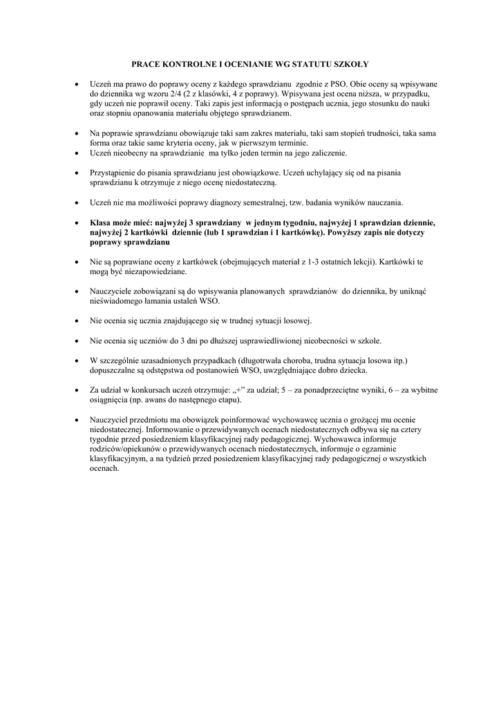 PRACE KONTROLNE I OCENIANIE WG STATUTU SZKOŁY Uczeń ma prawo do poprawy oceny z każdego sprawdzianu zgodnie z PSO. Obie oceny są wpisywane do dziennika wg wzoru 2/4 (2 z klasówki, 4 z poprawy). Wpisywana jest ocena niższa, w przypadku, gdy uczeń nie poprawił oceny. Taki zapis jest informacją o postępach ucznia, jego stosunku do nauki oraz stopniu opanowania materiału objętego sprawdzianem. Na poprawie sprawdzianu obowiązuje taki sam zakres materiału, taki sam stopień trudności, taka sama forma oraz takie same kryteria oceny, jak w pierwszym terminie. Uczeń nieobecny na sprawdzianie ma tylko jeden termin na jego zaliczenie. Przystąpienie do pisania sprawdzianu jest obowiązkowe. Uczeń uchylający się od na pisania sprawdzianu k otrzymuje z niego ocenę niedostateczną. Uczeń nie ma możliwości poprawy diagnozy semestralnej, tzw. badania wyników nauczania. Klasa może mieć: najwyżej 3 sprawdziany w jednym tygodniu, najwyżej 1 sprawdzian dziennie, najwyżej 2 kartkówki dziennie (lub 1 sprawdzian i 1 kartkówkę). Powyższy zapis nie dotyczy poprawy sprawdzianu Nie są poprawiane oceny z kartkówek (obejmujących materiał z 1-3 ostatnich lekcji). Kartkówki te mogą być niezapowiedziane. Nauczyciele zobowiązani są do wpisywania planowanych sprawdzianów do dziennika, by uniknąć nieświadomego łamania ustaleń WSO. Nie ocenia się ucznia znajdującego się w trudnej sytuacji losowej. Nie ocenia się uczniów do 3 dni po dłuższej usprawiedliwionej nieobecności w szkole. W szczególnie uzasadnionych przypadkach (długotrwała choroba, trudna sytuacja losowa itp.) dopuszczalne są odstępstwa od postanowień WSO, uwzględniające dobro dziecka. Za udział w konkursach uczeń otrzymuje: „+” za udział; 5 – za ponadprzeciętne wyniki, 6 – za wybitne osiągnięcia (np. awans do następnego etapu). Nauczyciel przedmiotu ma obowiązek poinformować wychowawcę ucznia o grożącej mu ocenie niedostatecznej. Informowanie o przewidywanych ocenach niedostatecznych odbywa się na cztery tygodnie przed posiedzeniem klasyfikacyjnej rady pedagogicznej. Wychowawca informuje rodziców/opiekunów o przewidywanych ocenach niedostatecznych, informuje o egzaminie klasyfikacyjnym, a na tydzień przed posiedzeniem klasyfikacyjnej rady pedagogicznej o wszystkich ocenach.