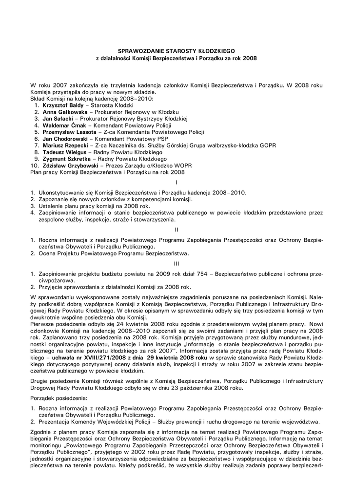 SPRAWOZDANIE STAROSTY KŁODZKIEGO z działalności Komisji Bezpieczeństwa i Porządku za rok 2008 W roku 2007 zakończyła się trzyletnia kadencja członków Komisji Bezpieczeństwa i Porządku. W 2008 roku Komisja przystąpiła do pracy w nowym składzie. Skład Komisji na kolejną kadencję 2008–2010: 1. Krzysztof Baldy – Starosta Kłodzki 2. Anna Gałkowska – Prokurator Rejonowy w Kłodzku 3. Jan Sałacki – Prokurator Rejonowy Bystrzycy Kłodzkiej 4. Waldemar Ćmak – Komendant Powiatowy Policji 5. Przemysław Lassota – Z-ca Komendanta Powiatowego Policji 6. Jan Chodorowski – Komendant Powiatowy PSP 7. Mariusz Rzepecki – Z-ca Naczelnika ds. Służby Górskiej Grupa wałbrzysko-kłodzka GOPR 8. Tadeusz Wielgus – Radny Powiatu Kłodzkiego 9. Zygmunt Szkretka – Radny Powiatu Kłodzkiego 10. Zdzisław Grzybowski – Prezes Zarządu o/Kłodzko WOPR Plan pracy Komisji Bezpieczeństwa i Porządku na rok 2008 I 1. 2. 3. 4. Ukonstytuowanie się Komisji Bezpieczeństwa i Porządku kadencja 2008–2010. Zapoznanie się nowych członków z kompetencjami komisji. Ustalenie planu pracy komisji na 2008 rok. Zaopiniowanie informacji o stanie bezpieczeństwa publicznego w powiecie kłodzkim przedstawione przez zespolone służby, inspekcje, straże i stowarzyszenia. II 1. Roczna informacja z realizacji Powiatowego Programu Zapobiegania Przestępczości oraz Ochrony Bezpi eczeństwa Obywateli i Porządku Publicznego. 2. Ocena Projektu Powiatowego Programu Bezpieczeństwa. III 1. Zaopiniowanie projektu budżetu powiatu na 2009 rok dział 754 – Bezpieczeństwo publiczne i ochrona przeciwpożarowa. 2. Przyjęcie sprawozdania z działalności Komisji za 2008 rok. W sprawozdaniu wyeksponowane zostały najważniejsze zagadnienia poruszane na posiedzeniach Komisji. Należy podkreślić dobrą współprace Komisji z Komisją Bezpieczeństwa, Porządku Publicznego i Infrastruktury Dr ogowej Rady Powiatu Kłodzkiego. W okresie opisanym w sprawozdaniu odbyły się trzy posiedzenia komisji w tym dwukrotnie wspólne posiedzenia obu Komisji. Pierwsze posiedzenie odbyło się 24 kwietnia 2008 roku zgodnie z przedstawionym wyżej planem pracy. Nowi członkowie Komisji na kadencję 2008–2010 zapoznali się ze swoimi zadaniami i przyjęli plan pracy na 2008 rok. Zaplanowano trzy posiedzenia na 2008 rok. Komisja przyjęła przygotowaną przez służby mundurowe, je dnostki organizacyjne powiatu, inspekcje i inne instytucje „Informację o stanie bezpieczeństwa i porządku publicznego na terenie powiatu kłodzkiego za rok 2007”. Informacja została przyjęta przez radę Powiatu Kłodzkiego – uchwała nr XVIII/271/2008 z dnia 29 kwietnia 2008 roku w sprawie stanowiska Rady Powiatu Kłodzkiego dotyczącego pozytywnej oceny działania służb, inspekcji i straży w roku 2007 w zakresie stanu bezpieczeństwa publicznego w powiecie kłodzkim. Drugie posiedzenie Komisji również wspólnie z Komisją Bezpieczeństwa, Porządku Publicznego i Infr astruktury Drogowej Rady Powiatu Kłodzkiego odbyło się w dniu 23 października 2008 roku. Porządek posiedzenia: 1. Roczna informacja z realizacji Powiatowego Programu Zapobiegania Przestępczości oraz Ochrony Bezpi eczeństwa Obywateli i Porządku Publicznego. 2. Prezentacja Komendy Wojewódzkiej Policji – Służby prewencji i ruchu drogowego na terenie województwa. Zgodnie z planem pracy Komisja zapoznała się z informacja na temat realizacji Powiatowego Programu Zapobiegania Przestępczości oraz Ochrony Bezpieczeństwa Obywateli i Porządku Publicznego. Informację na temat monitoringu „Powiatowego Programu Zapobiegania Przestępczości oraz Ochrony Bezpieczeństwa Obywateli i Porządku Publicznego”, przyjętego w 2002 roku przez Radę Powiatu, przygotowały inspekcje, służby i straże, jednostki organizacyjne i stowarzyszenia odpowiedzialne za bezpieczeństwo i współpracujące w dziedzinie bezpieczeństwa na terenie powiatu. Należy podkreślić, że wszystkie służby realizują zadania poprawy bezpiecze ń- stwa w ramach posiadanych środków. Adresatami tych programów są mieszkańcy powiatu oraz odwiedzający nas turyści. Musimy również nauczyć się i pamiętać o tym, że o bezpieczeństwo musimy zadbać także sami. Temu służą przygotowane przez służby, inspekcje ww. programy. Policja jest podstawową siłą do zapewnienia bezpieczeństwa. Funkcjonariusze prewencji, zespołu nie letnich, patologii i wykroczeń oraz dzielnicowi realizowali zadania z zakresu prewencji kryminalnej w ramach progr amów prewencyjnych takich jak: „Bezpieczne dziecko”, „Prawo a nieletni”, „Program pomocy ofiarom prz estępstw”, „Bezpieczna szkoła”, „Bezpieczna działka”. Działania te zmierzały do neutralizacji występujących patologii, wzrostu poczucia bezpieczeństwa wśród mieszkańców oraz przybliżenia społeczeństwu wizerunku Policji. Należy tu wymienić pozostałe programy realizowane przez KPP Kłodzko „Bezpieczna Polanica”, „KudowaZdrój bez graffiti”, „Szczytna bez graffiti”, „Olimpiada strzelecka”. Policja powiatu kłodzkiego opracowała i wdrożyła program prewencyjny pn. „Bezpieczny Senior Powiatu Kłodzkiego”, mający na celu podniesienie poczucia bezpieczeństwa najstarszych obywateli oraz zwiększenie aktywności wśród seniorów poprzez większy ich udział w życiu publicznym. Program skierowany jest do osób w zaawansowanym wieku, które stają się ofiarami takich przestępstw jak: oszustwa, kradzieże mieszkaniowe lub na tzw. „wyrwę” Celami tego programu są wzrost poczucia bezpieczeństwa wśród seniorów, a także ułatwienie komunikowania się z innymi ludźmi oraz instytucjami. Wymienić również należy porozumienie podpisane z policją czeską w sprawie wspólnych patroli. Państwowa Inspekcja Sanitarna powołana została do realizacji zadań z zakresu zdrowia publicznego, a szczególnie do ochrony zdrowia ludzkiego. Podejmowane przez Powiatową Stację Sanitarn