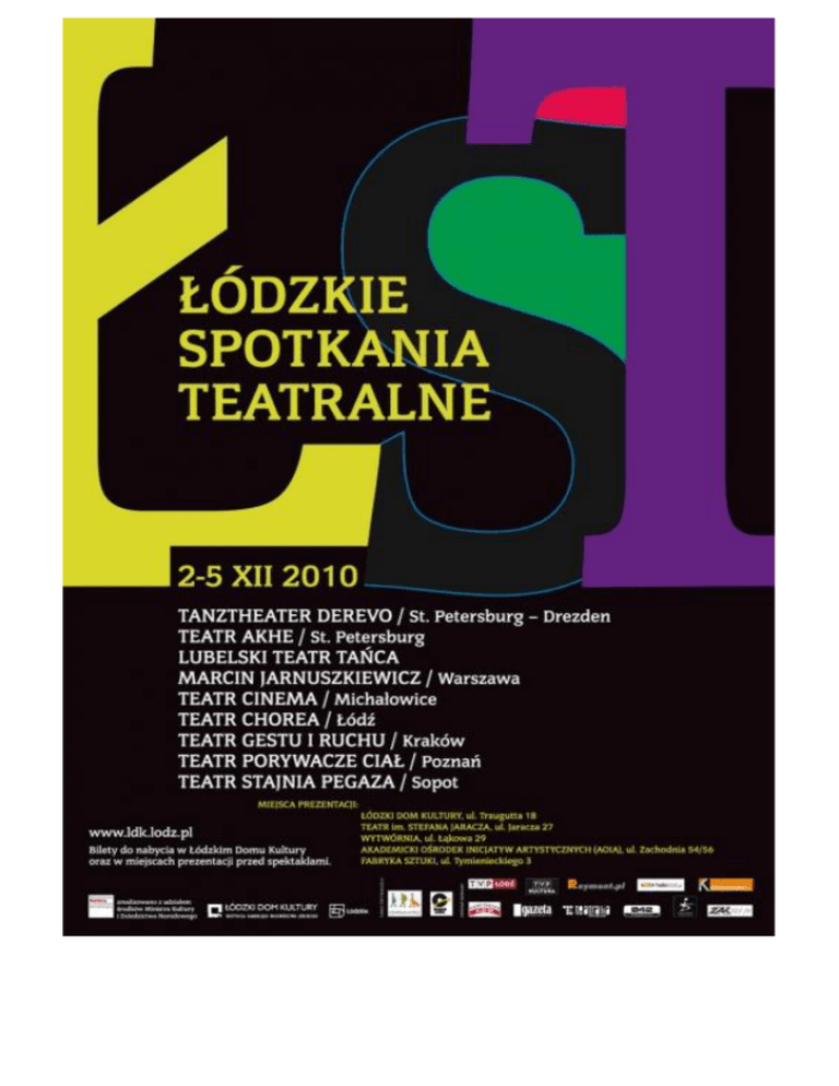 Łódzkie Spotkania Teatralne to od lat najważniejszy polski festiwal promujący nowe zjawiska w dziedzinie awangardy teatralnej i najstarsza impreza kulturalna w Łodzi (od 1964 roku zrealizowano 33 edycje). Edycje w latach 2008-2010 zrealizowano z udziałem środków Ministra Kultury i Dziedzictwa Narodowego. ŁST 2010 promowały i prezentowały dokonania wybitnych polskich oraz zagranicznych twórców związanych z teatrem i tańcem; poprzez szerokie spektrum gatunków, technik oraz praktyk interpretacyjnych i wykonawczych. Zwiększyły rolę kreacji artystycznej jako ważnego narzędzia komunikacjispołecznej i przyczyniły się do budowania dialogu kulturowego oraz społecznego przez sztukę. Złożyły się na nie: 4 spektakle zagraniczne, 3 spektakle krajowe w nurciePrezentacje, 4 spektakle krajowe w nurcie Laureat ŁST, wydawnictwa towarzyszące, 8 Dysput festiwalowych (dyskusji), film Anton Adassinski & DEREVO Süd Grenze. Marcin Wartalski dyrektor ŁST W związku z ŁST 2010 wystawę NATALII LL Prywatne magie można było oglądać w GALERIA FF - Forum Fotografii do 4 grudnia 2010 r., w ŁDK Najnowszy projekt Natalii Lach-Lachowicz Prywatne magie, w którym artystka analizuje mity i ich odniesienia do człowieka, twórcy we współczesności. Sama autorka tak o tym pisze: Magiczność potocznej rzeczywistości poraża swoją istotą. Wiele moich zachowań wynika z nieprzepartej potrzeby, której zasady nie mogę pojąć. Niewiadoma tego, co mnie oczekuje każe szukać mi oparcia w sobie i osobach mi bliskich. Między snem a przebudzeniem często doświadczam energii tych najbliższych mi osób. 3 grudnia od godz. 19.00, zaprosiliśmy z Łódź Art Center na impreza Towarzysząca Łódzkim Spotkaniom Teatralnym 2010 papARTy w Łódź Art Center 29 listopada 2010 r., o godz. 12.00 w Łódzkim Domu Kultury odbyła się konferencja prasowa. 27 listopada 2010 r., na ul. Piotrkowskiej pojawiły się Anioły Łódzkich Spotkań Teatralnych 2010. PROGRAM *** spektakl zagraniczny ** prezentacje * laureat ŁST 1. MARCIN JARNUSZKIEWICZ (Warszawa) Homework z cyklu prace domowe ** 2. dyskusja z MARCINEM JARNUSZKIEWICZEM 3. TEATR CINEMA (Michałowice) Hotel Dieu ** otwarta próba generalna 4. LUBELSKI TEATR TAŃCA (Lublin) NN. Wacławowi Niżyńskiemu * 5. dyskusja z LUBELSKIM TEATREM TAŃCA 6. TEATR CINEMA (Michałowice) Hotel Dieu ** premiera 7. dyskusja z TEATREM CINEMA 8. TANZTHEATER DEREVO (St. Petersburg / Dresden) Harlekin *** 9. TEATR STAJNIA PEGAZA (Sopot) Ja / Marilyn * ogólnopolska premiera 10. dyskusja 30 lat Teatru Stajnia Pegaza 11. TEATR AKHE (St. Petersburg) Mr Carmen – not Carmen *** 12. TANZTHEATER DEREVO (St. Petersburg / Dresden) Improvisation Anton & DEREVO *** premiera 13. DEREVO (St. Petersburg / Dresden) film Süd Grenze 14. dyskusja z ANTONEM ADASSINSKIM / DEREVO 15. TEATR GESTU I RUCHU (Kraków) projekt tanc.witkac Krótka historia pewnych miłości * 16. TEATR CHOREA (Łódź) Grotowski próba odwrotu ** 17. dyskusja Pierwsze 6 lat działalności z TEATREM CHOREA 18. TEATR AKHE (St. Petersburg) Plug’n play *** 19. dyskusja z TEATREM AKHE 20. Teatr Porywacze Ciał (Poznań) Inwazja według Porywaczy Ciał * 21. dyskusja 18 lat Teatru Porywacze Ciał SPEKTAKLE 2 GRUDNIA 17.00-18.20 Teatr im. Stefana Jaracza, Mała Scena MARCIN JARNUSZKIEWICZ(Warszawa) Homework z cyklu prace domowe ** spektakl autorski Marcina Jarnuszkiewicza współpraca autorska: Marta Zając, Tomek Walesiak światło: Prot Jarnuszkiewicz współpraca artystyczna: Roman Woźniak koordynacja projektu: Katarzyna Kraszewska, Adam Karol Drozdowski Jeżeli bezinteresowność w sztuce ma jeszcze jakiekolwiek znaczenie – to w tym przedstawieniu wartość ta zyskuje najpiękniejszy wymiar. Krzysztof Majchrzak Spektakl Marcina Jarnuszkiewicza NALEŻY zobaczyć. Ci, którzy nie poczuli magii teatru, będą mogli obcować ze sztuką w najlepszym wydaniu. Trudno opisać wszystkie doznania, jakie towarzyszą tej opowieści na scenie. Człowiek może odpowiedzieć sobie na wiele ważnych pytań […] A to wszystko odbywa się w ogromnym mistycznym skupieniu. Nie ma tekstu, słowa tworzy sam widz. Aktor, czyli Jarnuszkiewicz, kreuje ten sceniczny świat z ogromną pokorą, która cechuje największych twórców. Dla mnie było to najwspanialsze przeżycie teatralne, porównywalne ze słynnymi „Dziadami” Dejmka. Dziękuję Marcinowi za ogromne wzruszenie jakiego doznałam. Przecież o to chodzi w teatrze: o prawdziwe oczyszczenie. Stanisława Celińska 18.00-19.00 Łódzki Dom Kultury, sala 6 TEATR CINEMA(Michałowice) Hotel Dieu ** otwarta próba generalna Ktoś powiedział, że dziewięćdziesiąt dziewięć procent tego, co mieni się sztuką, sztuką nie jest. Wiem tak dobrze, jak na to, co wiem, że dzieło CINEMA mieści się w tym procencie zarezerwowanym przez sceptyków dla sztuki. W dobrym towarzystwie są tu Mathaler i Kantor. Jerzy Łukosz 20.00-20.50 LUBELSKI TEATR TAŃCA Teatr im. Stefana Jaracza, Duża Scena NN. Wacławowi Niżyńskiemu * choreografia: Ryszard Kalinowski wykonanie: Wojciech Kaproń, Ryszard Kalinowski muzyka: Piotr Kurek światło: James Clotfelter, Grzegorz Polak wizualizacje: Aleksander Janas produkcja: Centrum Kultury w Lublinie LTT poszukuje własnej formy wypowiedzi poprzez kreowanie ruchu opartego na fizyczności ciała, eksponującego indywidualną ekspresję tancerza oraz trójwymiarowe istnienie ciała w przestrzeni. Istotne jest wykorzystanie gestu, nadającego specyficzny rys kreowanej postaci i tworzącego swoisty klimat spektaklu. Celem choreografa jest również wykreowanie orginalnej architektury przestrzeni podkreślającej relacje i znaczenie układów przestrzenno czasowych. To dobry i intrygujący spektakl. Bez wątpienia powinien go zobaczyć każdy miłośnik tańca współczesnego. Może to być także ciekawa propozycja dla tych, którzy z tą formą teatru i tańca jeszcze nie obcowali. Miłosz Michał Zieliński, Gazeta Wyborcza Lublin (...) Co je
