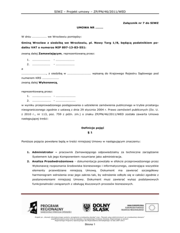 SIWZ – Projekt umowy – ZP/PN/46/2011/WED Załącznik nr 7 do SIWZ UMOWA NR ........ W dniu ............... we Wrocławiu pomiędzy: Gminą Wrocław z siedzibą we Wrocławiu, pl. Nowy Targ 1/8, będącą podatnikiem podatku VAT o numerze NIP 897-13-83-551: zwaną dalej Zamawiającym, reprezentowaną przez: 1. .................. - ................... 2. .................. - ................... a ........................., z siedzibą w ........................ wpisaną do Krajowego Rejestru Sądowego pod numerem KRS ................. zwaną dalej Wykonawcą, reprezentowaną przez: 1. ................... - .................... 2. ................... - .................... w wyniku przeprowadzonego postępowania o udzielenie zamówienia publicznego w trybie przetargu nieograniczonego zgodnie z ustawą z dnia 29 stycznia 2004 r. Prawo zamówień publicznych (Dz. U. z 2010 r., nr 113, poz. 759 z późn. zm.) o znaku ZP/PN/46/2011/WED została zawarta Umowa następującej treści: Definicje pojęć §1 PoniŜsze pojęcia powołane będą w treści niniejszej Umowy w następującym znaczeniu: 1. Administrator – pracownik Zamawiającego odpowiedzialny za techniczne zarządzanie Systemem lub jego Komponentem rozumiane jako administracja. 2. Analiza PrzedwdroŜeniowa – dokumentacja powstała w efekcie przeprowadzonego przez Wykonawcę rozpoznania środowiska biznesowego i informatycznego, zawierająca wszystkie elementy przewidziane niniejszą Umową. Dokument ma zawierać szczegółowy harmonogram wdroŜenia oraz jego zakres tak, by wdroŜenie odbyło się w całości zgodnie z postanowieniami niniejszej Umowy. Dokument musi zawierać wykaz podstawowych funkcjonalności związanych z obsługą kluczowych procesów biznesowych. Projekt pn. „Rozwój informatycznego systemu zarządzania wrocławską oświatą” oraz „”Rozwój usług elektronicznych we wrocławskiej oświacie” współfinansowane przez Unię Europejską z Europejskiego Funduszu Rozwoju Regionalnego w ramach Regionalnego Programu Operacyjnego dla Województwa Dolnośląskiego na lata 2007-2013 Strona 1 SIWZ – Projekt umowy – ZP/PN/46/2011/WED 3. Asysta –bezpośrednia gotowość konsultantów Wykonawcy do świadczenia wsparcia dla pracowników Zamawiającego oraz gotowość do usuwania Awarii Krytycznych i usuwanie Awarii Krytycznych na warunkach określonych w Umowie. 4. Awaria Krytyczna – awaria, której wystąpienie uniemoŜliwia realizację przez System podstawowych funkcjonalności związanych z obsługą kluczowych procesów biznesowych, określonych w Analizie PrzedwdroŜeniowej. 5. Awaria Niekrytyczna – awaria, która negatywnie wpływa na wydajność i funkcjonalność Systemu, lecz nie uniemoŜliwia realizacji podstawowych funkcjonalności przez System. W szczególności za Awarię Niekrytyczną uwaŜa się m.in. brak funkcjonalności tych elementów oprogramowania, które nie są krytyczne z punktu widzenia realizowanych przez System podstawowych funkcjonalności (w tym narzędzi pomocniczych i administracyjnych). Awaria Niekrytyczna zachodzi takŜe, gdy System kontynuuje pracę z mniejszą wydajnością. 6. Budowa – komplet usług wykonywanych przez Wykonawcę na rzecz Zamawiającego, będące przedmiotem niniejszej Umowy, mające na celu samodzielną eksploatację Systemu przez pracowników Zamawiającego. 7. Czas Przywrócenia Funkcjonalności – czas, jaki moŜe upłynąć pomiędzy przyjęciem Zgłoszenia Awarii a Przywróceniem Funkcjonalności. 8. Czas Przywrócenia Stanu Sprzed Awarii – czas, jaki moŜe upłynąć pomiędzy przyjęciem Zgłoszenia Awarii a Przywróceniem Stanu Sprzed Awarii. 9. Czas Reakcji Serwisu – czas, jaki moŜe upłynąć pomiędzy przyjęciem Zgłoszenia Awarii a Reakcją Serwisu. 10. Dni Robocze – przez dni robocze rozumie się dni, w których pracuje Zamawiający. 11. ESB – oznacza system informatyczny pełniący funkcję szyny integracyjnej (ang. Enterprise Service Bus). 12. Finanse-Księgowość i Zasoby – Komponent Systemu obejmujący swoim zakresem oprogramowanie uwzględnione w Projekcie_1: 1) oprogramowanie wspierającego działalność administracyjną szkoły i Projekcie_2: 2) część funkcjonalności oprogramowania do realizacji planowania i analiz budŜetowych. 13. Formatka – wydzielona część Komponentu Systemu, pojedynczy ekran Systemu wyświetlany w całości na ekranie monitora komputera. 14. HelpDesk – system informatyczny działający u Zamawiającego, za pośrednictwem którego Zamawiający będzie zgłaszał wszystkie awarie i uwagi do działania Systemu. Wykonawca będzie miał wgląd do Systemu Helpdesk i będzie realizował zadania w nim zgłoszone. 15. Incydent Helpdesku – przez incydent HelpDesku rozumie się serię działań podjętych przez Wykonawcę zainicjowanych zgłoszeniem jednego problemu do HelpDesku zmierzających do jego rozwiązania. Projekt pn. „Rozwój informatycznego systemu zarządzania wrocławską oświatą” oraz „”Rozwój usług elektronicznych we wrocławskiej oświacie” współfinansowane przez Unię Europejską z Europejskiego Funduszu Rozwoju Regionalnego w ramach Regionalnego Programu Operacyjnego dla Województwa Dolnośląskiego na lata 2007-2013 Strona 2 i SIWZ – Projekt umowy – ZP/PN/46/2011/WED 16. InŜynier Projektu – firma działająca na zlecenie Zamawiającego zarządzająca realizacją Projektu. 17. Kierownik Projektu – osoby wyznaczone do prowadzenia Projektu wdroŜenia Systemu, jedna osoba wyznaczona przez Wykonawcę i jedna przez Zamawiającego. 18. Komponent – oznacza część Systemu realizującą określony zespół zintegrowanych funkcjonalności. 19. Koordynator Merytoryczny – firma działająca na zlecenie Zamawiającego nadzorująca poprawność merytoryczną Systemu. 20. Licencja – prawo korzystania z Systemu lub z Oprogramowania Narzędziowego. 21. Migracja – Migracja oznacza przeniesienie danych z obecnie uŜytkowanych systemów obsługujących Zama