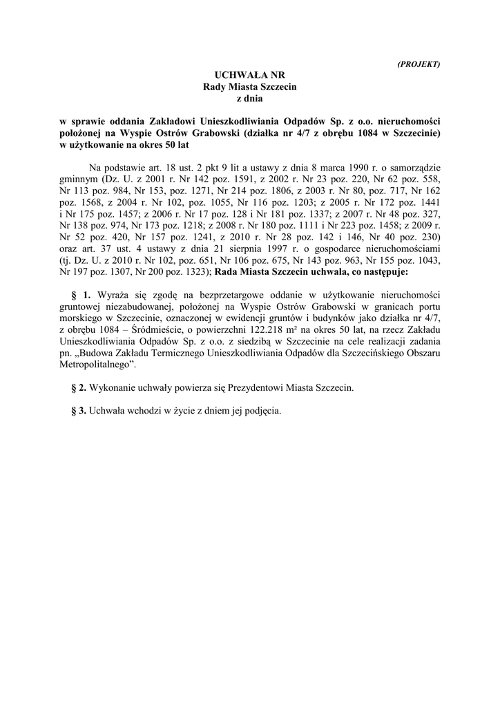 (PROJEKT) UCHWAŁA NR Rady Miasta Szczecin z dnia w sprawie oddania Zakładowi Unieszkodliwiania Odpadów Sp. z o.o. nieruchomości połoŜonej na Wyspie Ostrów Grabowski (działka nr 4/7 z obrębu 1084 w Szczecinie) w uŜytkowanie na okres 50 lat Na podstawie art. 18 ust. 2 pkt 9 lit a ustawy z dnia 8 marca 1990 r. o samorządzie gminnym (Dz. U. z 2001 r. Nr 142 poz. 1591, z 2002 r. Nr 23 poz. 220, Nr 62 poz. 558, Nr 113 poz. 984, Nr 153, poz. 1271, Nr 214 poz. 1806, z 2003 r. Nr 80, poz. 717, Nr 162 poz. 1568, z 2004 r. Nr 102, poz. 1055, Nr 116 poz. 1203; z 2005 r. Nr 172 poz. 1441 i Nr 175 poz. 1457; z 2006 r. Nr 17 poz. 128 i Nr 181 poz. 1337; z 2007 r. Nr 48 poz. 327, Nr 138 poz. 974, Nr 173 poz. 1218; z 2008 r. Nr 180 poz. 1111 i Nr 223 poz. 1458; z 2009 r. Nr 52 poz. 420, Nr 157 poz. 1241, z 2010 r. Nr 28 poz. 142 i 146, Nr 40 poz. 230) oraz art. 37 ust. 4 ustawy z dnia 21 sierpnia 1997 r. o gospodarce nieruchomościami (tj. Dz. U. z 2010 r. Nr 102, poz. 651, Nr 106 poz. 675, Nr 143 poz. 963, Nr 155 poz. 1043, Nr 197 poz. 1307, Nr 200 poz. 1323); Rada Miasta Szczecin uchwala, co następuje: § 1. WyraŜa się zgodę na bezprzetargowe oddanie w uŜytkowanie nieruchomości gruntowej niezabudowanej, połoŜonej na Wyspie Ostrów Grabowski w granicach portu morskiego w Szczecinie, oznaczonej w ewidencji gruntów i budynków jako działka nr 4/7, z obrębu 1084 – Śródmieście, o powierzchni 122.218 m² na okres 50 lat, na rzecz Zakładu Unieszkodliwiania Odpadów Sp. z o.o. z siedzibą w Szczecinie na cele realizacji zadania pn. „Budowa Zakładu Termicznego Unieszkodliwiania Odpadów dla Szczecińskiego Obszaru Metropolitalnego”. § 2. Wykonanie uchwały powierza się Prezydentowi Miasta Szczecin. § 3. Uchwała wchodzi w Ŝycie z dniem jej podjęcia. UZASADNIENIE Prezydent Miasta Szczecin zwraca się z wnioskiem o oddanie Zakładowi Unieszkodliwiania Odpadów Sp. z o.o. nieruchomości połoŜonej na Wyspie Ostrów Grabowski (działka nr 4/7 z obrębu 1084) w Szczecinie w uŜytkowanie na okres 50 lat. Przedmiotowa Spółka powstała na mocy Uchwały nr III/24/10 Rady Miasta Szczecin z dnia 28 grudnia 2010 roku. Podstawowym przedmiotem działalności Spółki jest wykonywanie zadań własnych gminy, określonych w art. 7 ust. 1 pkt 3 ustawy z dnia 8 marca 1990 r. o samorządzie gminnym (Dz. U. z 2001 r. Nr 142, poz. 1591 ze zm.) polegających na zaspokajaniu potrzeb mieszkańców Gminy Miasto Szczecin w zakresie utrzymania czystości, porządku oraz urządzeń sanitarnych, wysypisk i unieszkodliwiania odpadów komunalnych. Oddanie przedmiotowego terenu w uŜytkowanie ma na celu realizację zadania pn. „Budowa Zakładu Termicznego Unieszkodliwiania Odpadów dla Szczecińskiego Obszaru Metropolitalnego”. Uchwała w sprawie utworzenia jednoosobowej Spółki Gminy Miasto Szczecin pod nazwą „Zakład Termicznego Unieszkodliwiania Odpadów” Spółka z ograniczoną odpowiedzialnością w Szczecinie jest konsekwencją deklaracji złoŜonej w uchwale Nr XLVI/1163/10 Rady Miasta Szczecin z dnia 26 kwietnia 2010 r. w sprawie przystąpienia przez Gminę Miasto Szczecin do realizacji projektu w ramach Programu Operacyjnego Infrastruktura i Środowisko priorytet II Gospodarka odpadami i ochrona powierzchni ziemi, Działanie 2.1. Kompleksowe przedsięwzięcia w zakresie gospodarki odpadami ze szczególnym uwzględnieniem odpadów niebezpiecznych. Wybór spółki prawa handlowego do przeprowadzenia przedsięwzięcia pn. „Budowa Zakładu Termicznego Unieszkodliwiania Odpadów dla Szczecińskiego Obszaru Metropolitalnego” został zarekomendowany w Studium wykonalności dla tego projektu, jako najbardziej optymalny. Spółka prawa handlowego, w której Gmina Miasto Szczecin będzie posiadała 100% udziałów, będzie pełnić rolę beneficjenta i operatora, zapewniając tym samym pełną kontrolę nad projektem, nie obciąŜając Gminy prowadzeniem przedsięwzięcia. Ma to szczególne znaczenie, przy zaciąganiu zobowiązań finansowych przez Miasto na realizację potencjalnych inwestycji. Zgodnie z projektem budŜetu na 2011 r. oraz wieloletnią prognozą finansową na rok 2011 i lata następne zabezpieczono środki finansowe na realizację zadania pn. „Budowa zakładu termicznego unieszkodliwiania odpadów dla SOM” w łącznej wysokości 42.335.525 zł. W ramach tego zadania inwestycyjnego w latach 2011-2014 na udziały w spółce przeznacza się następujące środki budŜetowe: - 2011 r. – 12.335.500 zł, - 2012 r. – 10.000.000 zł, - 2013 r. – 10.000.000 zł, - 2014 r. – 10.000.000 zł. Prezydent Miasta Szczecin proponuje oddanie przedmiotowego terenu ww. Spółce w uŜytkowanie na okres 50 lat celem realizacji zadań wyznaczonych Spółce Uchwałą nr III/24/10 Rady Miasta Szczecina, wraz ustanowieniem nadzoru właścicielskiego sprawowanego przez Wydział Gospodarki Komunalnej i Ochrony Środowiska tut. Urzędu.