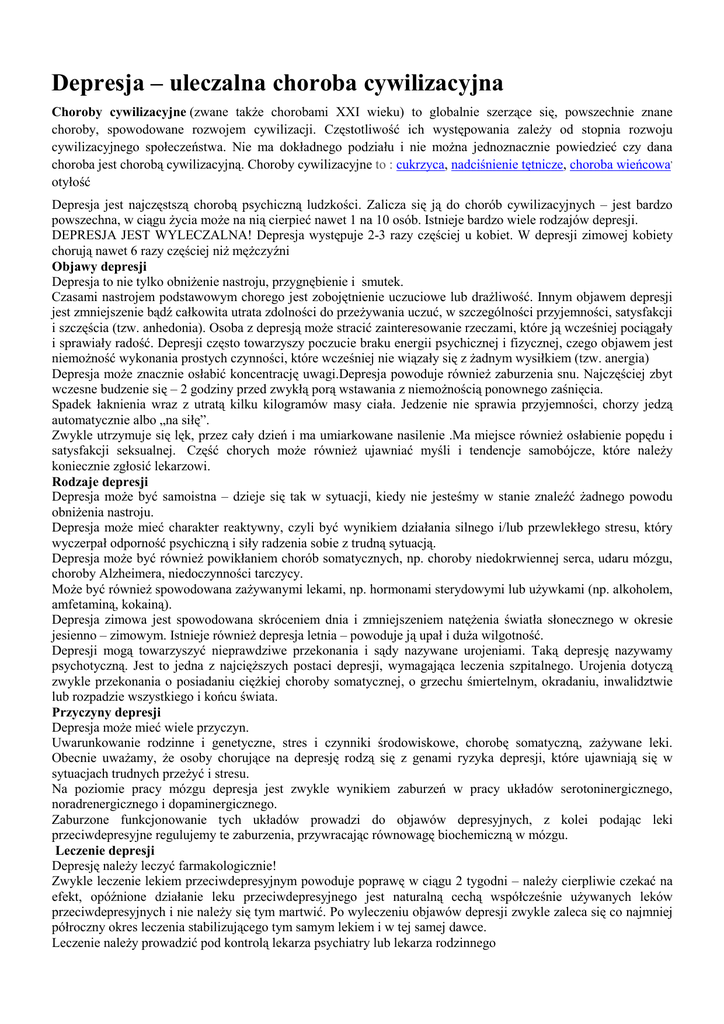 Depresja – uleczalna choroba cywilizacyjna Choroby cywilizacyjne (zwane także chorobami XXI wieku) to globalnie szerzące się, powszechnie znane choroby, spowodowane rozwojem cywilizacji. Częstotliwość ich występowania zależy od stopnia rozwoju cywilizacyjnego społeczeństwa. Nie ma dokładnego podziału i nie można jednoznacznie powiedzieć czy dana choroba jest chorobą cywilizacyjną. Choroby cywilizacyjne to : cukrzyca, nadciśnienie tętnicze, choroba wieńcowa, otyłość Depresja jest najczęstszą chorobą psychiczną ludzkości. Zalicza się ją do chorób cywilizacyjnych – jest bardzo powszechna, w ciągu życia może na nią cierpieć nawet 1 na 10 osób. Istnieje bardzo wiele rodzajów depresji. DEPRESJA JEST WYLECZALNA! Depresja występuje 2-3 razy częściej u kobiet. W depresji zimowej kobiety chorują nawet 6 razy częściej niż mężczyźni Objawy depresji Depresja to nie tylko obniżenie nastroju, przygnębienie i smutek. Czasami nastrojem podstawowym chorego jest zobojętnienie uczuciowe lub drażliwość. Innym objawem depresji jest zmniejszenie bądź całkowita utrata zdolności do przeżywania uczuć, w szczególności przyjemności, satysfakcji i szczęścia (tzw. anhedonia). Osoba z depresją może stracić zainteresowanie rzeczami, które ją wcześniej pociągały i sprawiały radość. Depresji często towarzyszy poczucie braku energii psychicznej i fizycznej, czego objawem jest niemożność wykonania prostych czynności, które wcześniej nie wiązały się z żadnym wysiłkiem (tzw. anergia) Depresja może znacznie osłabić koncentrację uwagi.Depresja powoduje również zaburzenia snu. Najczęściej zbyt wczesne budzenie się – 2 godziny przed zwykłą porą wstawania z niemożnością ponownego zaśnięcia. Spadek łaknienia wraz z utratą kilku kilogramów masy ciała. Jedzenie nie sprawia przyjemności, chorzy jedzą automatycznie albo „na siłę”. Zwykle utrzymuje się lęk, przez cały dzień i ma umiarkowane nasilenie .Ma miejsce również osłabienie popędu i satysfakcji seksualnej. Część chorych może również ujawniać myśli i tendencje samobójcze, które należy koniecznie zgłosić lekarzowi. Rodzaje depresji Depresja może być samoistna – dzieje się tak w sytuacji, kiedy nie jesteśmy w stanie znaleźć żadnego powodu obniżenia nastroju. Depresja może mieć charakter reaktywny, czyli być wynikiem działania silnego i/lub przewlekłego stresu, który wyczerpał odporność psychiczną i siły radzenia sobie z trudną sytuacją. Depresja może być również powikłaniem chorób somatycznych, np. choroby niedokrwiennej serca, udaru mózgu, choroby Alzheimera, niedoczynności tarczycy. Może być również spowodowana zażywanymi lekami, np. hormonami sterydowymi lub używkami (np. alkoholem, amfetaminą, kokainą). Depresja zimowa jest spowodowana skróceniem dnia i zmniejszeniem natężenia światła słonecznego w okresie jesienno – zimowym. Istnieje również depresja letnia – powoduje ją upał i duża wilgotność. Depresji mogą towarzyszyć nieprawdziwe przekonania i sądy nazywane urojeniami. Taką depresję nazywamy psychotyczną. Jest to jedna z najcięższych postaci depresji, wymagająca leczenia szpitalnego. Urojenia dotyczą zwykle przekonania o posiadaniu ciężkiej choroby somatycznej, o grzechu śmiertelnym, okradaniu, inwalidztwie lub rozpadzie wszystkiego i końcu świata. Przyczyny depresji Depresja może mieć wiele przyczyn. Uwarunkowanie rodzinne i genetyczne, stres i czynniki środowiskowe, chorobę somatyczną, zażywane leki. Obecnie uważamy, że osoby chorujące na depresję rodzą się z genami ryzyka depresji, które ujawniają się w sytuacjach trudnych przeżyć i stresu. Na poziomie pracy mózgu depresja jest zwykle wynikiem zaburzeń w pracy układów serotoninergicznego, noradrenergicznego i dopaminergicznego. Zaburzone funkcjonowanie tych układów prowadzi do objawów depresyjnych, z kolei podając leki przeciwdepresyjne regulujemy te zaburzenia, przywracając równowagę biochemiczną w mózgu. Leczenie depresji Depresję należy leczyć farmakologicznie! Zwykle leczenie lekiem przeciwdepresyjnym powoduje poprawę w ciągu 2 tygodni – należy cierpliwie czekać na efekt, opóźnione działanie leku przeciwdepresyjnego jest naturalną cechą współcześnie używanych leków przeciwdepresyjnych i nie należy się tym martwić. Po wyleczeniu objawów depresji zwykle zaleca się co najmniej półroczny okres leczenia stabilizującego tym samym lekiem i w tej samej dawce. Leczenie należy prowadzić pod kontrolą lekarza psychiatry lub lekarza rodzinnego Najczęstszą przyczyną niepowodzeń w leczeniu depresji jest przerywanie leczenia bez konsultacji z lekarzem. Przerwanie leczenia farmakologicznego może spowodować nawrót wszystkich objawów depresji! Z tego powodu należy bezwzględnie przestrzegać zaleceń lekarza i nie zmieniać sposobu dawkowania bez rozmowy z lekarzem prowadzącym. Należy mieć świadomość, że powrót do tego samego leku, który wcześniej powodował poprawę może być związany z gorszą odpowiedzią i wytworzeniem się oporności na leczenie. Poprawę w leczeniu depresji oprócz leczenia lekami przeciwdepresyjnymi może przynieść również stosowanie dodatkowo psychoterapii.