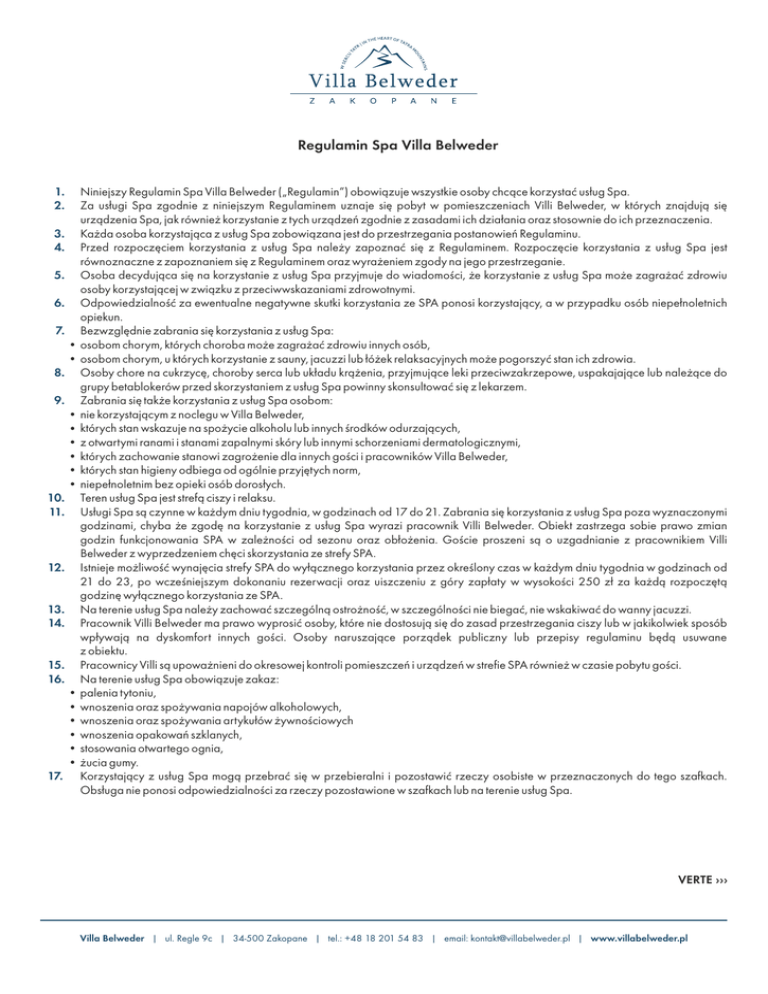 Regulamin Spa Villa Belweder 1. 2. Niniejszy Regulamin Spa Villa Belweder („Regulamin”) obowiązuje wszystkie osoby chcące korzystać usług Spa. Za usługi Spa zgodnie z niniejszym Regulaminem uznaje się pobyt w pomieszczeniach Villi Belweder, w których znajdują się urządzenia Spa, jak również korzystanie z tych urządzeń zgodnie z zasadami ich działania oraz stosownie do ich przeznaczenia. 3. Każda osoba korzystająca z usług Spa zobowiązana jest do przestrzegania postanowień Regulaminu. 4. Przed rozpoczęciem korzystania z usług Spa należy zapoznać się z Regulaminem. Rozpoczęcie korzystania z usług Spa jest równoznaczne z zapoznaniem się z Regulaminem oraz wyrażeniem zgody na jego przestrzeganie. 5. Osoba decydująca się na korzystanie z usług Spa przyjmuje do wiadomości, że korzystanie z usług Spa może zagrażać zdrowiu osoby korzystającej w związku z przeciwwskazaniami zdrowotnymi. 6. Odpowiedzialność za ewentualne negatywne skutki korzystania ze SPA ponosi korzystający, a w przypadku osób niepełnoletnich opiekun. 7. Bezwzględnie zabrania się korzystania z usług Spa: • osobom chorym, których choroba może zagrażać zdrowiu innych osób, • osobom chorym, u których korzystanie z sauny, jacuzzi lub łóżek relaksacyjnych może pogorszyć stan ich zdrowia. 8. Osoby chore na cukrzycę, choroby serca lub układu krążenia, przyjmujące leki przeciwzakrzepowe, uspakajające lub należące do grupy betablokerów przed skorzystaniem z usług Spa powinny skonsultować się z lekarzem. 9. Zabrania się także korzystania z usług Spa osobom: • nie korzystającym z noclegu w Villa Belweder, • których stan wskazuje na spożycie alkoholu lub innych środków odurzających, • z otwartymi ranami i stanami zapalnymi skóry lub innymi schorzeniami dermatologicznymi, • których zachowanie stanowi zagrożenie dla innych gości i pracowników Villa Belweder, • których stan higieny odbiega od ogólnie przyjętych norm, • niepełnoletnim bez opieki osób dorosłych. 10. Teren usług Spa jest strefą ciszy i relaksu. 11. Usługi Spa są czynne w każdym dniu tygodnia, w godzinach od 17 do 21. Zabrania się korzystania z usług Spa poza wyznaczonymi godzinami, chyba że zgodę na korzystanie z usług Spa wyrazi pracownik Villi Belweder. Obiekt zastrzega sobie prawo zmian godzin funkcjonowania SPA w zależności od sezonu oraz obłożenia. Goście proszeni są o uzgadnianie z pracownikiem Villi Belweder z wyprzedzeniem chęci skorzystania ze strefy SPA. 12. Istnieje możliwość wynajęcia strefy SPA do wyłącznego korzystania przez określony czas w każdym dniu tygodnia w godzinach od 21 do 23, po wcześniejszym dokonaniu rezerwacji oraz uiszczeniu z góry zapłaty w wysokości 250 zł za każdą rozpoczętą godzinę wyłącznego korzystania ze SPA. 13. Na terenie usług Spa należy zachować szczególną ostrożność, w szczególności nie biegać, nie wskakiwać do wanny jacuzzi. 14. Pracownik Villi Belweder ma prawo wyprosić osoby, które nie dostosują się do zasad przestrzegania ciszy lub w jakikolwiek sposób wpływają na dyskomfort innych gości. Osoby naruszające porządek publiczny lub przepisy regulaminu będą usuwane z obiektu. 15. Pracownicy Villi są upoważnieni do okresowej kontroli pomieszczeń i urządzeń w strefie SPA również w czasie pobytu gości. 16. Na terenie usług Spa obowiązuje zakaz: • palenia tytoniu, • wnoszenia oraz spożywania napojów alkoholowych, • wnoszenia oraz spożywania artykułów żywnościowych • wnoszenia opakowań szklanych, • stosowania otwartego ognia, • żucia gumy. 17. Korzystający z usług Spa mogą przebrać się w przebieralni i pozostawić rzeczy osobiste w przeznaczonych do tego szafkach. Obsługa nie ponosi odpowiedzialności za rzeczy pozostawione w szafkach lub na terenie usług Spa. VERTE ››› Villa Belweder | ul. Regle 9c | 34-500 Zakopane | tel.: +48 18 201 54 83 | email: [email protected] | www.villabelweder.pl 18. Zabrania się: • samodzielnego uruchamiania lub obsługi urządzeń Spa o ile uruchomienie lub obsługa taka nie wynika z właściwości urządzenia oraz instrukcji użytkowania określonej dla danego urządzenia; • samodzielnego podłączania urządzeń Spa do instalacji elektrycznej; • samodzielnego naprawiania urządzeń Spa; • wnoszenia i podłączania własnych urządzeń elektrycznych do instalacji elektrycznej, m. in. suszarek do włosów, prostownic, golarek itp.; • niszczenia sprzętu oraz wszelkich urządzeń wyposażenia w strefie SPA; • używania sprzętu do innych celów niż jest przeznaczony; • przesuwania, dotykania gorących kamieni i pieca w saunie; • siedzenia i leżenia na deskach ławek w saunie bez użycia własnego ręcznika. 19. Osoby, które spowodują szkody w sprzęcie lub wyposażeniu Strefy SPA ponoszą pełną odpowiedzialność odszkodowawczą za wyrządzoną szkodę w pełnej wysokości. Za szkody spowodowane przez osoby niepełnoletnie odpowiedzialność ponoszą ich przedstawiciele ustawowi lub opiekunowie, pod opieką których osoby niepełnoletnie się znajdują. 20. O wszelkich usterkach lub niedogodnościach należy niezwłocznie poinformować pracownika Villi Belweder. 21. Na terenie usług Spa należy poruszać się w zamiennym obuwiu. Villa Belweder | ul. Regle 9c | 34-500 Zakopane | tel.: +48 18 201 54 83 | email: [email protected] | www.villabelweder.pl