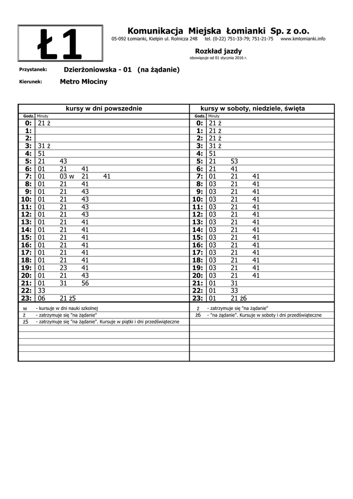 Ł1 Przystanek: Kierunek: Komunikacja Miejska Łomianki Sp. z o.o. 05-092 Łomianki, Kiełpin ul. Rolnicza 248 Rozkład jazdy Dzierżoniowska - 01 (na żądanie) Metro Młociny kursy w dni powszednie w ż ż5 kursy w soboty, niedziele, święta Godz. Minuty 21 ż 31 ż 51 21 01 01 01 01 01 01 01 01 01 01 01 01 01 01 01 01 33 06 www.kmlomianki.info obowiązuje od 01 stycznia 2016 r. Godz. Minuty 0: 1: 2: 3: 4: 5: 6: 7: 8: 9: 10: 11: 12: 13: 14: 15: 16: 17: 18: 19: 20: 21: 22: 23: tel. (0-22) 751-33-79; 751-21-75 43 21 03 w 21 21 21 21 21 21 21 21 21 21 21 23 21 31 41 21 41 43 43 43 43 41 41 41 41 41 41 41 43 56 41 21 ż5 - kursuje w dni nauki szkolnej - zatrzymuje się "na żądanie" - zatrzymuje się "na żądanie". Kursuje w piątki i dni przedświąteczne 0: 1: 2: 3: 4: 5: 6: 7: 8: 9: 10: 11: 12: 13: 14: 15: 16: 17: 18: 19: 20: 21: 22: 23: ż ż6 21 21 21 31 51 21 21 01 03 03 03 03 03 03 03 03 03 03 03 03 03 01 01 01 ż ż ż ż 53 41 21 21 21 21 21 21 21 21 21 21 21 21 21 21 31 33 21 ż6 41 41 41 41 41 41 41 41 41 41 41 41 41 41 - zatrzymuje się "na żądanie" - "na żądanie". Kursuje w soboty i dni przedświąteczne