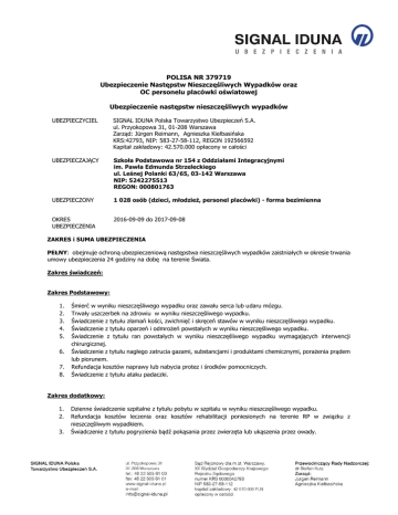 POLISA NR 379719 Ubezpieczenie Następstw Nieszczęśliwych Wypadków oraz OC personelu placówki oświatowej Ubezpieczenie następstw nieszczęśliwych wypadków UBEZPIECZYCIEL SIGNAL IDUNA Polska Towarzystwo Ubezpieczeń S.A. ul. Przyokopowa 31, 01-208 Warszawa Zarząd: Jürgen Reimann, Agnieszka Kiełbasińska KRS:42793, NIP: 583-27-58-112, REGON 192566592 Kapitał zakładowy: 42.570.000 opłacony w całości UBEZPIECZAJĄCY Szkoła Podstawowa nr 154 z Oddziałami Integracyjnymi im. Pawła Edmunda Strzeleckiego ul. Leśnej Polanki 63/65, 03-142 Warszawa NIP: 5242275513 REGON: 000801763 UBEZPIECZONY 1 028 osób (dzieci, młodzież, personel placówki) - forma bezimienna OKRES UBEZPIECZENIA 2016-09-09 do 2017-09-08 ZAKRES i SUMA UBEZPIECZENIA PEŁNY: obejmuje ochroną ubezpieczeniową następstwa nieszczęśliwych wypadków zaistniałych w okresie trwania umowy ubezpieczenia 24 godziny na dobę na terenie Świata. Zakres świadczeń: Zakres Podstawowy: 1. 2. 3. 4. 5. 6. 7. 8. Śmierć w wyniku nieszczęśliwego wypadku oraz zawału serca lub udaru mózgu. Trwały uszczerbek na zdrowiu w wyniku nieszczęśliwego wypadku. Świadczenie z tytułu złamań kości, zwichnięć i skręceń stawów w wyniku nieszczęśliwego wypadku. Świadczenie z tytułu oparzeń i odmrożeń powstałych w wyniku nieszczęśliwego wypadku. Świadczenie z tytułu ran powstałych w wyniku nieszczęśliwego wypadku wymagających interwencji chirurgicznej. Świadczenie z tytułu nagłego zatrucia gazami, substancjami i produktami chemicznymi, porażenia prądem lub piorunem. Refundacja kosztów naprawy lub nabycia protez i środków pomocniczych. Świadczenie z tytułu ataku padaczki. Zakres dodatkowy: 1. 2. 3. Dzienne świadczenie szpitalne z tytułu pobytu w szpitalu w wyniku nieszczęśliwego wypadku. Refundacja kosztów leczenia oraz kosztów rehabilitacji poniesionych na terenie RP w związku z nieszczęśliwym wypadkiem. Świadczenie z tytułu pogryzienia bądź pokąsania przez zwierzęta lub ukąszenia przez owady. 4. 5. 1. Refundacja kosztów odbudowy zębów stałych uszkodzonych lub utraconych w wyniku nieszczęśliwego wypadku. Czasowa niezdolność do nauki spowodowana nieszczęśliwym wypadkiem. ZAKRES PODSTAWOWY: 1) Śmierć wskutek nieszczęśliwego wypadku oraz zawału serca lub udaru mózgu – świadczenie w wysokości 100% sumy ubezpieczenia z tytułu trwałego uszczerbku na zdrowiu w wyniku nieszczęśliwego wypadku. 2) Świadczenie z tytułu trwałego uszczerbku na zdrowiu w wyniku nieszczęśliwego wypadku — zakres udzielanej ochrony oraz wysokość poszczególnych świadczeń zgodnie z następującą tabelą: Lp. Rodzaj uszkodzenia ciała 1) Całkowita utrata kończyny górnej w obrębie barku lub ramienia 2) Całkowita utrata kończyny górnej w obrębie łokcia lub przedramienia 3) 4) 5) 8) 9) 10) 11) 12) 13) 14) 15) 16) Całkowita utrata ręki Całkowita utrata palców II, III, IV, V ręki Całkowita utrata kciuka Całkowita utrata kończyny dolnej w obrębie stawu biodrowego lub kości udowej Całkowita utrata kończyny dolnej w obrębie stawu kolanowego, podudzia lub stawów skokowych Całkowita utrata stopy Całkowita utrata palców stopy II, III, IV, V Całkowita utrata palucha Całkowita utrata wzroku w jednym oku Całkowita utrata wzroku w obu oczach Całkowita utrata słuchu w jednym uchu Całkowita utrata słuchu w obu uszach Całkowita utrata małżowiny usznej Całkowita utrata nosa 17) Całkowita utrata zębów stałych 18) 19) 20) 21) 22) 23) Całkowita utrata śledziony Całkowita utrata jednej nerki Całkowita utrata obu nerek Całkowita utrata macicy Całkowita utrata jajnika lub jądra Całkowita utrata mowy Porażenie lub niedowład co poniżej 3 stopnia w skali Lovette’a Śpiączka trwająca dłużej niż 30 dni 6) 7) 24) 25) 3) świadczenie jako % sumy ubezpieczenia 80 najmniej dwóch 60 50 7 - za każdy palec 22 75 60 40 4 - za każdy palec 15 50 100 30 50 15 20 2 - za każdy ząb, 20 - maksymalnie z tytułu utraty zębów 20 35 75 40 20 100 kończyn 100 100 Świadczenie z tytułu złamań kości, zwichnięć i skręceń stawów w wyniku nieszczęśliwego wypadku — zakres udzielanej ochrony oraz wysokość poszczególnych świadczeń zgodnie z następującą tabelą: Lp. Rodzaj uszkodzenia ciała 1) 2) 3) Złamania kości sklepienia i podstawy czaszki Złamania kości twarzoczaszki Złamania łopatki, obojczyka, mostka 4) Złamania żebra, żeber 5) 6) 7) 8) Złamania kości ramiennej Zwichnięcie stawu barkowego Złamania w obrębie kości przedramienia (jednej lub obu) Zwichnięcie w obrębie stawu łokciowego 9) Złamania w obrębie kości ręki z wyłączeniem kości palców 10) Złamania w obrębie kości palców ręki II-V Zwichnięcia stawów w obrębie palców II-V Złamania w obrębie kciuka Zwichnięcie kciuka Niestabilne złamania miednicy Stabilne złamania miednicy Zwichnięcie stawu biodrowego Złamania kości udowej Złamania w obrębie kości podudzia (jednej lub obu) Złamania rzepki Zwichnięcie stawu kolanowego Złamania w obrębie stopy z wyłączeniem kości palców Złamania w obrębie palucha Złamania w obrębie kości palców stopy II-V Zwichnięcie w stawach skokowych Złamania w obrębie kręgosłupa – dotyczy trzonów, łuków kręgów (z wyłączeniem kości ogonowej) Złamania w obrębie kręgosłupa – dotyczy wyrostków poprzecznych, kolczystych kręgów Złamania kości ogonowej 11) 12) 13) 14) 15) 16) 17) 18) 19) 20) 21) 22) 23) 24) 25) 26) 27) 28) Złamania zębów stałych 29) Skręcenia stawu świadczenie jako % sumy ubezpieczenia z tytułu trwałego uszczerbku na zdrowiu w wyniku nieszczęśliwego wypadku 5,0 4,0 4,5 - za każdą kość 1,0 - za każde żebro, 10,0 – maks. z tytułu złamania wielu żeber 7,0 7,0 4,0 5,0 3,0 1,5 – za każdy palec 2,0 – za każdy palec 3,0 3,0 10,0 4,5 10,0 10,5 7,0 4,0 5,0 4,0 2,5 1,0 – za każdy palec 4,0 11,0 - za każdy krąg 2,5 - za każdy krąg 3,5 0,5 - za każdy ząb, max