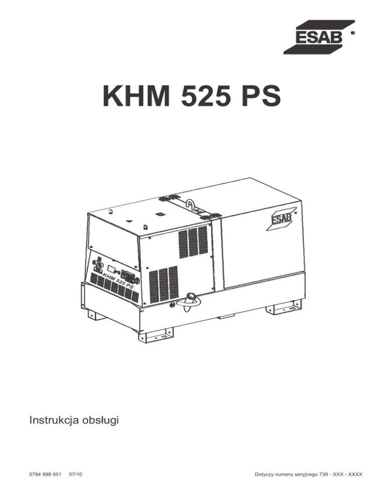 KHM 525 PS Instrukcja obsługi 0794 999 951 07/10 Dotyczy numeru seryjnego 739 - XXX - XXXX KHM 525 PS/PSX Spis treści M 1 Szanowny Kliencie, Chcielibyśmy podziękować za zakup naszego produktu. Prosimy uważnie przeczytać niniejszy dokument i zapoznać się z urządzeniem przed użyciem. W razie jakichkolwiek pytań lub problemów zalecamy skontaktowanie się z najbliższym Centrum Obsługi. Centrum obsługi posiada niezbędne doświadczenie i dysponuje oryginalnymi częściami zamiennymi. Korzystanie z części nieoryginalnych spowoduje utratę gwarancji. SPIS TREŚCI STRONA INFORMACJE OGÓLNE INFORMACJE NA TEMAT NINIEJSZEGO PODRĘCZNIKA OPIS - SYMBOLE ŚRODKI OSTROŻNOŚCI - OGÓLNE ŚRODKI OSTROŻNOŚCI – SPAWARKA O NAPĘDZIE SPALINOWYM TRANSPORT MONTAŻ ZESTAWU HOLOWNICZEGO DLA KHM 525 INFORMACJE O INSTALACJI MONTAŻ M 2.5.1 M4 M 6,3 M 2,6 M 2,7 DZIAŁANIE ROZPAKOWYWANIE DANE TECHNICZNE I OPIS MASZYNY PRZYGOTOWYWANIE URZĄDZENIA URUCHAMIANIE SILNIKA ZATRZYMYWANIE SILNIKA STEROWANIE OBSŁUGA CYFROWE STEROWANIE SPAWANIA ZDALNE STEROWANIE PHG1B KONSERWACJA PRZECHOWYWANIE DANE TECHNICZNE M3 M 1.5, M 1.6 M 20 M 21 M 22 M 31 M 32 M 33, 33.1, 33.2 M 38,8 M 43, M 43.3 M 45 M 53 SCHEMATY I CZĘŚCI ZAMIENNE SCHEMAT POŁĄCZEŃ - SILNIK SCHEMAT POŁĄCZEŃ – DODATKOWY Y400V / 3 x 1230V SCHEMAT POŁĄCZEŃ – MOC SPAWANIA SCHEMAT POŁĄCZEŃ – KONTROLA SPAWANIA M 61,1 M 61,2 M 61,3 M 61,4 M2 M 2,1 M 2,5 10/10/07 78515-GB OPIS INFORMACJE KHM M 2 INFORMACJE OGÓLNE NAGŁÓWKI W NINIEJSZEJ INSTRUKCJI − W kopercie, która zawierała niniejszą instrukcję znajduje się również instrukcja Właściciela dla silnika oraz akcesoria (jeśli wymagane). Nagłówki używane w niniejszej instrukcji mają na celu zwrócenie uwagi na potencjalne zagrożenia i ważne aspekty działania maszyny… Niniejszy produkt przeznaczony jest do spawania i wytwarzania energii elektrycznej dla narzędzi i innych urządzeń elektrycznych wykorzystywanych w budownictwie; WSZELKIE INNE WYKORZYSTANIE jest zabronione i nie ponosimy odpowiedzialności za urazy lub szkody wynikające z takiego nieprawidłowego wykorzystania. Nasze produkty wykonane są zgodnie z normami bezpieczeństwa w celu uniknięcia urazów ciała lub uszkodzenia maszyny lub innych obiektów. NIEBEZPIECZEŃSTWO Wskazuje na możliwość odniesienia ciężkich urazów lub śmierci w wyniku nieprzestrzegania instrukcji. OSTRZEŻENIE Wskazuje na możliwość odniesienia ciężkich urazów lub uszkodzenia sprzętu w wyniku nieprzestrzegania instrukcji. PRZESTROGA Wskazuje na możliwość uszkodzenia sprzętu lub własności w Gwarancja ważna jest jedynie gdy przeprowadzana jest wyniku nieprzestrzegania instrukcji. przez upoważnionego pracownika obsługi ESAB. WAŻNE Wszelkie zmiany wprowadzane do maszyny bez naszej pisemnej zgody naruszają warunki gwarancji i zwalniają nas z odpowiedzialności. O NINIEJSZYM PODRĘCZNIKU ZAPAMIĘTAJ UWAGA Nagłówki te dostarczają pomocnych informacji na temat przygotowania, działania i konserwacji maszyny. Proszę uważnie zapoznać się z treścią niniejszego podręcznika i postępować zgodnie z zawartymi w nim instrukcjami. Pomoże to uniknąć problemów, możliwych urazów oraz uszkodzenia maszyny. Niniejszy podręcznik stworzony jest dla doświadczonego, wykwalifikowanego personelu, który zaznajomiony jest z przepisami dotyczącymi zdrowia i bezpieczeństwa w pracy. Niniejszy podręcznik stanowi integralną część produktu i należy przechowywać go w bezpiecznym miejscu, tak aby można było skorzystać z niego podczas obsługi produktu. W przypadku sprzedaży maszyny, podręcznik należy przekazać nowemu właścicielowi. Część danych zawartych w niniejszym podręczniku zostało opracowanych w celu umożliwienia identyfikacji określonych części i może nie być zgodna z Państwa maszyną. zmiany w produkcie lub jego akcesoriach bez konieczności aktualizacji informacji w podręczniku. 07/01/08 M2GB Uwaga: producent może wprowadzić usprawnienia i SYMBOLE SYMBOLE OGÓLNE STOP – Przeczytaj bardzo uważnie KHM M 2.1 SYMBOLE BEZPIECZEŃSTWA Używaj odpowiednich urządzeń ochronnych dla danego rodzaju spawania Używaj ubrania ochronnego, itd. specjalnie opracowywanego dla wykonywanego rodzaju spawania. Przeczytaj uważnie Podczas konserwacji maszyny pamiętaj o ochronie Zaleca się ochronę podczas przeprowadzania prac konserwacyjnych, takich jak napełnianie akumulatorów, uzupełnianie paliwa, itd. KLUCZ - Korzystaj z narzędzi odpowiednich do wykonywanej pracy W czasie przesuwania maszyny, zwróć uwagę na środki ostrożności Przed przemieszczaniem maszyny zapoznaj się z instrukcjami SYMBOLE OSTRZEGAWCZE Noś wskazane ubrania ochronne Noszenie elementów ochrony osobistej jest obowiązkowe przy korzystaniu ze sprzętu. UWAGA –Nieprzestrzeganie tej porady może doprowadzić do urazów lub uszkodzenia sprzętu. WYSOKIE NAPIĘCIE - Nie dotykać – ryzyko obrażeń lub śmierci. Korzystaj z wymaganych urządzeń ochronnych Należy stosować urządzenia ochronne odpowiednie dla rodzaju i miejsca spawania. Nie używaj wody w przypadku pożarów w instalacjach elektrycznych - POŻAR - Ryzyko pożaru. CIEPŁO - Gorące powierzchnie. Zakazane jest używanie wody do gaszenia pożarów w instalacjach elektrycznych. Nie dotykaj bez odłączenia elektryczności Praca na maszynie zakazana jest aż do wyłączenia elektryczności. MATERIAŁY WYBUCHOWE - Materiały wybuchowe lub niebezpieczeństwo eksplozji. Spawanie zakazane Spawanie w obszarach zawierających gazy wybuchowe jest zabronione. ZAKAZ WODY - Nie używaj wody, ponieważ może spowodować zwarcia lub inne awarie. ZAKAZ PALENIA - Palenie papierosów, zapalanie zapałek lub zapalniczek może wzniecić ogień lub spowodować wybuch. KWASY – Niebezpieczeństwo korozji lub poparzeń. INSTALACJA I PORADY PRZED UŻYCIEM WAŻNE M 2.5 KHM UZUPEŁNIANIE PALIWA W SILNIKU Zapoznaj się z niniejszymi instrukcjami. Przed rozpoczęciem instalacji,
