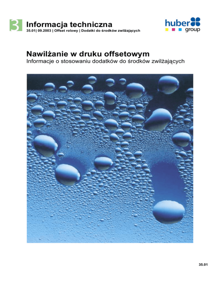 Informacja techniczna 35.01| 09.2003 | Offset rolowy | Dodatki do rodków zwilajcych Nawilanie w druku offsetowym Informacje o stosowaniu dodatków do rodków zwilajcych 35.01 Druk offsetowy Najczciej stosowan technik do druku zarówno niskich, jak i wysokich nak adów, jest druk offsetowy. Powoduje to jego elastyczno i rónorodno moliwoci, wysoka jako druku i korzystna struktura kosztów. W odrónieniu od innych technik druku, w offsecie uywa si p askiej formy drukowej. Specjalnie spreparowana chemicznie powierzchnia p yty dzieli si na miejsca drukujce, przyjmujce farb a odpychajce wod (hydrofobowe) i miejsca niedrukujce, przyjmujce wod a odpychajce farb (hydrofilne). Aby rozdzieli obszary drukujce od niedrukujcych, zachowujc ostro punktu, oprócz farby konieczny jest rodek zwilajcy na bazie wody. Zarówno stosowana woda, jak i rodek zwilajcy musz spe nia okrelone wymagania. Woda W aciwoci wody s kszta towane przez warunki geologiczne na obszarze jej pozyskiwania i ewentualnie przez jej póniejsze uzdatnianie. Do druku offsetowego znaczenie maj ponisze parametry. Twardo wody Pod pojciem twardoci wody rozumie si zawarto rozpuszczonych w niej soli wapnia i magnezu. Miar twardoci wody jest stopie twardoci (°d). Optymalny zakres twardoci wody do druku offsetowego mieci si w przedziale pomidzy 8-12°d. W przypadku uywania wody o wyszej twardoci, jak równie przy zadruku pod oy powlekanych matowo, moe wystpi zjawisko ysienia wa ków, szczególnie w zespole z farb czerwon. Przyczyn tego s trudno rozpuszczalne zwizki wapnia, które odk adaj si w porach gumowych obcigów wa ków. Prowadzi to do wzrostu hydrofilnoci i moe zak óca przenoszenie farby. Aby zapobiega zjawisku ysienia wa ków mona stosowa dwie metody: • • Zmikczanie i odsalanie wody wodocigowej Stosowanie specjalnie zrecepturowanych dodatków do rodka zwilajcego, które zapobiegaj wytrcaniu si trudno rozpuszczalnych soli wapnia. W kadym przypadku naley oczyci pow oki wa ków z istniejcych osadów przy pomocy rodka czyszczcego Walzenreinigungsgelee 10 T 0023. Stopnie niemieckiej skali twardoci b. mikka mikka r. twarda do twarda twarda Milimole tlenku wapnia w litrze 1 stopie w niemieckiej skali twardoci (1°d) = 10 mg tlenku wapnia (CaO) w litrze – 0,178 milimoli tlenku wapnia w litrze = 1,785 ° fH (francuska skala twardoci) = 1,250 ° clark (angielska skala twardoci) b. twarda UWAGA Przed zastosowaniem do druku offsetowego, woda zmikczona lub odsolona, powinna by doprowadzona do twardoci ok. 8-12°d przez dodanie SALINOFIX-u 5005 09. Udzia wodorow glanów Wodorowglany zawarte we wszystkich wodach naturalnych reaguj lekko alkalicznie i prowadz do podniesienia wartoci pH rodka zwilajcego. Przy wysokiej zawartoci wodorowglanów w wodzie, warto pH moe przekroczy korzystny zakres technologiczny, dlatego te zdolno buforowania dodatków do rodków zwilajcych dostosowana jest do zawartoci wodorowglanów w wodzie. Chlorki, azotany i siarczany Zawarte w wodzie chlorki, azotany i siarczany mog wywoywa lub sprzyja powstawaniu korozji okrelonych metali, dlatego te producenci maszyn okrelaj graniczne zawartoci tych zwizków w wodzie. Jeli wartoci te s przekraczane, konieczne jest zainstalowanie urzdze do uzdatniania wody (osmoza odwrotna) W przypadku, kiedy parametry wody nie s znane, a dostawca nie potrafi ich okreli, moemy w ramach naszego serwisu wykona bezpatn analiz wody. Nasi przeszkoleni technicy su doradztwem na temat moliwoci i rodzaju urzdze do uzdatniania wody. Zasada odwrotnej osmozy Czysta woda (50%) z max. zawartoci 5% wszystkich soli Koncentrat (50%) z zawartoci 95% wszystkich soli cznie z chlorkami, azotanami i siarczanami powodujcymi twardo wody Membrana Woda uytkowa z rónymi solami cznie ze zwizkami utwardzajcymi wod (wap, magnez, chlorki, azotany, siarczany) Dodatki do rodków zwilajcych rodek zwilajcy musi by waciwie dobrany do maszyny, pyty drukowej, podoa drukowego, farby i dostosowany do jakoci wody. Ju dawno okazao si, e woda pobierana wprost z wodocigu tylko w ograniczonym zakresie odpowiada wymaganiom druku offsetowego. Aby dostosowa si do dzisiejszych wymogów technologicznych dotyczcych rodków zwilajcych, naley stosowa odpowiednie dodatki do wody. Speniaj one nastpujce zadania: • Ustalanie i stabilizacja wartoci pH • Ustalanie napicia powierzchniowego • Ochrona okrelonych czci maszyny przed korozj Oprócz tego istnieje moliwo dodatkowego stosowania specjalnych substancji (np. przeciwdzia ajcych ysieniu wa ków, przyspieszajcych proces schnicia, zastpujcych alkohol). Warto pH Warto pH okrela kwasowo danego medium. Skala wartoci pH jest bezwymiarowym cigiem liczbowym. Zakres od 0 do 7 okrela rodowisko jako kwane, zakres od 7 0d 14 jako alkaliczne, a warto pH 7 jest wartoci neutraln. Na przestrzeni rozwoju techniki druku offsetowego okaza o si, e najkorzystniejsz wartoci pH pod ktem przydatnoci do druku jest zakres od 5,0 do 5,3. W dziedzinie druku gazetowego, zastosowanie najnowszych rozwiza, pozwala na drukowanie z dodatkami zwilajcymi o neutralnym odczynie pH. Do pomiaru wartoci pH stosuje si dwie metody: • • pomiar przy pomocy papierków lakmusowych. B d pomiaru buforowanych roztworów wynosi czsto 0,5 jednostki pH i dlatego te, metoda ta nie jest zalecana pomiar pH-metrem elektrycznym ze szklanymi elektrodami. Pozwala na bardzo dok adne okrelenie wartoci pH, równie w przypadku roztworów buforowanych. Niezbdne jest jednak przestrzeganie zasad konserwacji i skalowania urzdzenia • Warto pH i stenie kwasów zakres zalecany dla technologii offsetowej Warto pH wzrastajca kwasowo punkt neutralny Koncentracja jonów wodoru (mol/l) wzrastajca zasadowo Przewodnictwo elektryczne Drugim, wanym parametrem pomiarowym stosowanym w praktyce jest oznaczanie przewodnictwa elektrycznego. Nie okrela ono jednak w aciwoci drukowo-technicznych roztworu zwilajcego, a s uy raczej do sprawdzania w aciwego dozowania dodatków do rodka zwilajcego. Naley zwróci uwag na zalecenia opisane w naszej informacji „Przewodnictw
