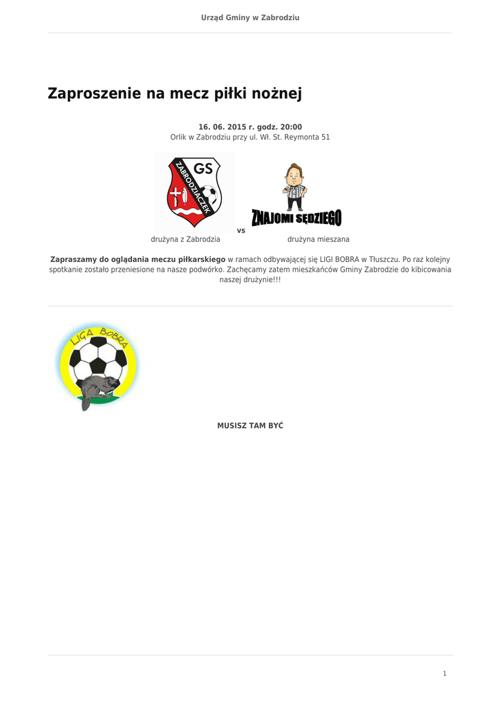 Urząd Gminy w Zabrodziu Zaproszenie na mecz piłki nożnej 16. 06. 2015 r. godz. 20:00 Orlik w Zabrodziu przy ul. Wł. St. Reymonta 51 vs drużyna z Zabrodzia drużyna mieszana Zapraszamy do oglądania meczu piłkarskiego w ramach odbywającej się LIGI BOBRA w Tłuszczu. Po raz kolejny spotkanie zostało przeniesione na nasze podwórko. Zachęcamy zatem mieszkańców Gminy Zabrodzie do kibicowania naszej drużynie!!! MUSISZ TAM BYĆ 1