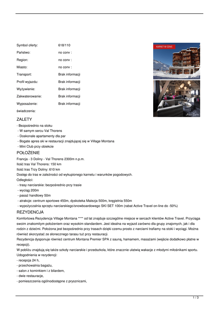Symbol oferty: 618/110 Państwo: no conv : Region: no conv : Miasto: no conv : Transport: Brak informacji Profil wyjazdu: Brak informacji Wyżywienie: Brak informacji Zakwaterowanie: Brak informacji Wyposażenie: Brak informacji świadczenia: ZALETY - Bezpośrednio na stoku - W samym sercu Val Thorens - Doskonałe apartamenty dla par - Bogate apres ski w restauracji znajdującej się w Village Montana - Mini Club przy obiekcie POŁOŻENIE Francja - 3 Doliny - Val Thorens 2300m n.p.m. Ilość tras Val Thorens: 150 km Ilość tras Trzy Doliny: 610 km Dostęp do tras w zależności od wykupionego karnetu i warunków pogodowych. Odległości: - trasy narciarskie: bezpośrednio przy trasie - wyciąg 200m - pasaż handlowy 50m - atrakcje: centrum sportowe 450m, dyskoteka Malezja 500m, kręgielnia 550m - wypożyczalnia sprzętu narciarskiego/snowboardowego SKI SET 100m (rabat Active Travel on-line do -50%) REZYDENCJA Komfortowa Rezydencja Village Montana **** od lat znajduje szczególne miejsce w sercach klientów Active Travel. Przyciąga swoim znakomitym położeniem oraz wysokim standardem. Jest idealna na wyjazd zarówno dla grupy znajomych, jak i dla rodzin z dziećmi. Położona jest bezpośrednio przy trasach dzięki czemu prosto z narciarni trafiamy na stoki i wyciągi. Można również skorzystać ze słonecznego tarasu tuż przy restauracji. Rezydencja dysponuje również centrum Montana Premier SPA z sauną, hamamem, masażami (wejście dodatkowo płatne w recepcji). W pobliżu znajdują się także szkoły narciarskie i przedszkola, które znacznie ułatwią wakacje z młodymi miłośnikami sportu. Udogodnienia w rezydencji: - recepcja 24 h, - przechowalnia bagażu, - salon z kominkiem i z bilardem, - dwie restauracje, - pomieszczenia ogólnodostępne z prysznicami, 1/3 - zadaszony parking (po wcześniejszej rezerwacji), - łóżeczko i krzesła dzieciece (po wcześniejszej rezerwacji), - codzienne sprzątanie (dodatkowo płatne). APARTAMENTY Rezydencja oferuje komfortowo wyposażone i przestronne apartamenty. Na wyposażeniu każdego z nich znajdziemy suszarke do włosów, telefon, TV w pokoju dziennym oraz aneks kuchenny z piekarnikiem, kuchenka mikrofalową, płyta grzewczą, lodówką, zmywarką, ekspresem do kawy, czajnikiem, tosterem i naczyniami kuchennymi. Usługi hotelowe w Rezydencji (bezpłatne): ścielenie łóżek w dniu przyjazdu (oprócz sofy), zmiana ręczników, mini zestaw do sprzątania, sprzątnie końcowe. Apartament 2/3 - apartament dla 3 osób (32 m2): 1 sypialnia z 2 łóżkami pojedynczymi, 1 pokój dzienny z rozkładaną sofą (1 miejsce), telewizor z płaskim ekranem (satelita), telefon z bezpośrednim połączeniem, 1 aneks kuchenny z piekarnikiem, kuchenka mikrofalowa, płyta grzewcza, lodówka, zmywarka, ekspres do kawy, czajnik, toster i naczynia kuchenne, 1 łazienka z WC, suszarką do włosów, balkon. Apartament 2P4 cabine - apartament dla 4 osób (35 m2): 1 sypialnia z 2 łóżkami pojedynczymi, 1 sypialnia z 2 łóżkami typu cabine, 1 pokój dzienny z TV z płaskim ekranem (satelita), telefon z bezpośrednim połączeniem, 1 aneks kuchenny z piekarnikiem, kuchenką mikrofalową, płytą grzewczą, lodówka, zmywarka, ekspres do kawy, czajnik, toster i naczynia kuchenne, 1 łazienka z suszarką do włosów, 1 oddzielne WC, balkon. Apartament 2/4 - apartament dla 4 osób (45 m2): 2 sypialnie z 2 łóżkami pojedynczymi, 1 pokój dzienny z TV z płaskim ekranem (satelita), telefon z bezpośrednim połączeniem, 1 aneks kuchenny z piekarnikiem, kuchenką mikrofalową, płytą grzewczą, lodówka, zmywarka, ekspres do kawy, czajnik, toster i naczynia kuchenne, 1 łazienka z suszarką do włosów, 1 oddzielne WC, balkon. Apartament 3P6 cabine - apartament dla 6 osób (49 m2): 2 sypialnie z 2 łóżkami pojedynczymi, 1 sypialnia typu cabine z łóżkiem piętrowym dla 2 osób, 1 pokój dzienny z TV z płaskim ekranem (satelita), telefon z bezpośrednim połączeniem, 1 aneks kuchenny z piekarnikiem, kuchenka mikrofalowa, płyta grzewcza, lodówka, zmywarka, ekspres do kawy, czajnik, toster i naczynia kuchenne, 1 łazienka z prysznicem, 1 łazienka z wanną, 1 oddzielne WC, balkon. MONTANA PREMIER SPA W czasie pobutu można odpłatnie korzystać zaplecze SPA w Rezydencji Montana Premier / Plein Sud. Do dyspozycji: sauna, hammam, sala relaksacyjna. Wstęp 10 EUR/os. Zabiegi SPA dodatkowo płatne (wymagana rezerwacja). WYŻYWIENIE RO - bez wyżywienia. KARNET W cenie 6-dniowy karnet na region Val Thorens obejmujący łącznie 150 km tras! 30 tras łatwych 31 tras średnich 8 tras trudnych Dzieci do 5 lat oraz seniorzy powyżej 75 lat: karnet gratis! Istnieje możliwość rozszerzenia karnetu na całe Trzy Doliny (ponad 600 km tras, z wyłączeniem terminu 3-10.12.2016) CENA Cena zawiera: - zakwaterowanie w wybranym apartamencie z pościelą i ręcznikami (1 komplet/osoba/tydzień), - 6-dniowy karnet narciarski na region Val Thorens, - ścielenie łóżek w dniu przyjazdu, - obowiązkowe ubezpieczenie KL i NNW, - korzystanie z narciarni, - sprzątanie końcowe za wyjątkiem kuchni, - zestaw startowy środków czystości, - opiekę pilota lub rezydenta, 2/3 - Autokar: przejazd autokarem typu LUX przystosowanym do rejsów międzynarodowych, bagaż główny, bagaż podręczny i bagaz narciarski. Cena nie zawiera dopłat obowiązkowych: - kaucji zwrotnej 500 EUR/apartament, - opłaty klimatycznej 2,47 EUR/osoba/dzień, Cena nie zawiera dopłat opcjonalnych: - wyżywienia, - rozszerzena karnetu na region Trzech Dolin (niedostępny w terminie 3-10.12.2016), - garażu 75EUR/tydzień (konieczna wcześniejsza rezerwacja), - wejścia do Montana Premiere SPA 10EUR/os./dzień (sauna, hammam, pokój releksacyjny), - ubezpieczenia narciarskiego 6 dni na nartach, - ubezpieczenia od kosztów rezygnacji 3% AXA (wariant zwrotu 100% zgnodnie z warunkami ubezpieczyciela), - ubezpieczenia od chorób przewlekłych. Atrakcje: Clubing przy rezydencji <a rel="nofollow" href="http:/