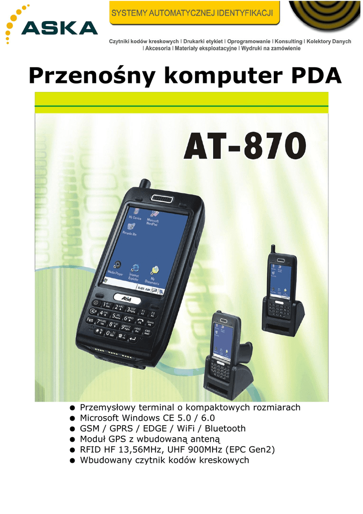 Przenośny komputer PDA ● ● ● ● ● ● Przemysłowy terminal o kompaktowych rozmiarach Microsoft Windows CE 5.0 / 6.0 GSM / GPRS / EDGE / WiFi / Bluetooth Moduł GPS z wbudowaną anteną RFID HF 13,56MHz, UHF 900MHz (EPC Gen2) Wbudowany czytnik kodów kreskowych Akcesoria Podstawowe cechy Procesor: Marvel PXA270 520MHz Marvel PXA320 820MHz (opcjonalnie) Antena zewnętrzna RFID UHF 900MHz Pamięć: 128MB RAM / 256MB ROM System Operacyjny: Windows CE 5.0 (opcjonalnie WIN CE 6.0) Wyświetlacz: kolorowy 240x320 punktów – 3,5” QVGA, dotykowy z podświetleniem, 256 tys. kolorów RFID: Antena wbudowana RFID HF 13,56MHz HF 13,56MHz ISO 14443A/B , ISO15693, MIFARE UHF 900MHz (EPC Gen2) przez dodatkową antenę zewnętrzną. Czytnik kodów kreskowych: Do wyboru 1D laser lub 2D imager Interfejs użytkownika: Klawiatura numeryczna, ekran dotykowy, głośnik, słuchawki stereofoniczne, mikrofon Wymiary: 146mm x 74mm x 26mm. Waga 270g-330g (w zależności od wyposażenia) Uchwyt pistoletowy Aparat fotograficzny: 1.3Mpix z lampą blyskową Złącza specjalne: Gniazdo pamięci MicroSD, 1 gniazdo slim. Złącza komunikacyjne: USB 1.1, RS-232, Ethernet (poprzez dok) Komunikacja bezprzewodowa: WLAN(802.11b/g), Bluetooth v2.0 GSM/GPRS/EDGE Dok komunikacyjny GPS: Odbiornik GPS z wbudowaną anteną Klasa odporności: IP54, wielokrotne upadki z 1,5m na beton. Warunki otoczenia: Temp. pracy od -20° do 50°C Temp. przechowywania od -30° do 60°C Wilgotność max. 95% niekondensująca Zasilanie: Dok samochodowy Akumulator 3000mAh Akumulator 4400mAh (z uchwytem pistoletowym) Bateria podtrzymująca 100mAh Dodatkowe opcje i akcesoria: Dok pojedynczy (z Ethernetem), Dok samochodowy, kabel do synchronizacji, uchwyt pistoletowy (z baterią 4400mAh), klips do paska, Dok poczwórny. ASKA 04-869 Warszawa, ul. Wędkarska 2A/B1 tel. (22) 498 59 08/9, fax. (22) 617 70 20 www.kodykreskowe.com [email protected]