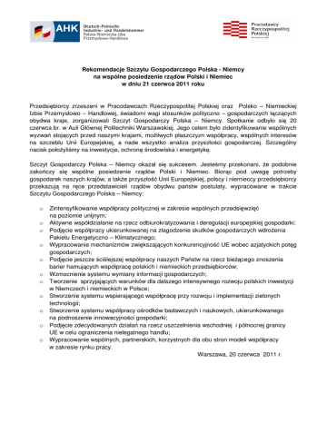 Rekomendacje Szczytu Gospodarczego Polska - Niemcy na wspólne posiedzenie rządów Polski i Niemiec w dniu 21 czerwca 2011 roku Przedsiębiorcy zrzeszeni w Pracodawcach Rzeczypospolitej Polskiej oraz Polsko – Niemieckiej Izbie Przemysłowo – Handlowej, świadomi wagi stosunków polityczno – gospodarczych łączących obydwa kraje, zorganizowali Szczyt Gospodarczy Polska – Niemcy. Spotkanie odbyło się 20 czerwca br. w Auli Głównej Politechniki Warszawskiej. Jego celem było zidentyfikowanie wspólnych wyzwań stojących przed naszymi krajami, możliwych płaszczyzn współpracy, wspólnych interesów na szczeblu Unii Europejskiej, a nade wszystko analiza przyszłości gospodarczej. Szczególny nacisk położyliśmy na inwestycje, ochronę środowiska i energetykę. Szczyt Gospodarczy Polska – Niemcy okazał się sukcesem. Jesteśmy przekonani, że podobnie zakończy się wspólne posiedzenie rządów Polski i Niemiec. Biorąc pod uwagę potrzeby gospodarek naszych krajów, a także przyszłość Unii Europejskiej, polscy i niemieccy przedsiębiorcy przekazują na ręce przedstawicieli rządów obydwu państw postulaty, wypracowane w trakcie Szczytu Gospodarczego Polska – Niemcy: o o o o o o o o o o o Zintensyfikowanie współpracy politycznej w zakresie wspólnych przedsięwzięć na poziomie unijnym; Aktywne współdziałanie na rzecz odbiurokratyzowania i deregulacji europejskiej gospodarki; Podjęcie współpracy ukierunkowanej na złagodzenie skutków gospodarczych wdrożenia Pakietu Energetyczno – Klimatycznego; Wypracowanie mechanizmów zwiększających konkurencyjność UE wobec azjatyckich potęg gospodarczych; Podjęcie jeszcze ściślejszej współpracy naszych Państw na rzecz bieżącego znoszenia barier hamujących współpracę polskich i niemieckich przedsiębiorców; Wzmocnienie systemu wymiany informacji gospodarczych; Tworzenie sprzyjających warunków dla dalszego intensywnego rozwoju polskich inwestycji w Niemczech i niemieckich w Polsce; Stworzenie systemu wspierającego współpracę przy rozwoju i implementacji zielonych technologii; Stworzenie systemu współpracy ośrodków badawczych i naukowych, ukierunkowanego na podnoszenie innowacyjności gospodarki; Podjęcie zdecydowanych działań na rzecz uszczelnienia wschodniej i północnej granicy UE w celu ograniczenia nielegalnego handlu; Wypracowanie wspólnych, partnerskich, korzystnych dla obu stron modeli współpracy w zakresie rynku pracy. Warszawa, 20 czerwca 2011 r.