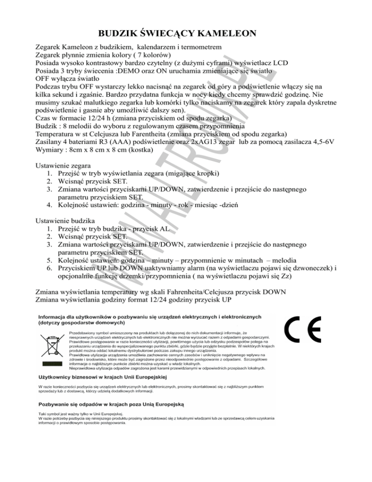 BUDZIK ŚWIECĄCY KAMELEON .ALLTR ONIX. PL Zegarek Kameleon z budzikiem, kalendarzem i termometrem Zegarek płynnie zmienia kolory ( 7 kolorów) Posiada wysoko kontrastowy bardzo czytelny (z dużymi cyframi) wyświetlacz LCD Posiada 3 tryby świecenia :DEMO oraz ON uruchamia zmieniające się światło OFF wyłącza światło Podczas trybu OFF wystarczy lekko nacisnąć na zegarek od góry a podświetlenie włączy się na kilka sekund i zgaśnie. Bardzo przydatna funkcja w nocy kiedy chcemy sprawdzić godzinę. Nie musimy szukać malutkiego zegarka lub komórki tylko naciskamy na zegarek który zapala dyskretne podświetlenie i gasnie aby umożliwić dalszy sen). Czas w formacie 12/24 h (zmiana przyciskiem od spodu zegarka) Budzik : 8 melodii do wyboru z regulowanym czasem przypomnienia Temperatura w st Celcjusza lub Farentheita (zmiana przyciskiem od spodu zegarka) Zasilany 4 bateriami R3 (AAA) podświetlenie oraz 2xAG13 zegar lub za pomocą zasilacza 4,5-6V Wymiary : 8cm x 8 cm x 8 cm (kostka) Ustawienie zegara 1. Przejść w tryb wyświetlania zegara (migające kropki) 2. Wcisnąć przycisk SET. 3. Zmiana wartości przyciskami UP/DOWN, zatwierdzenie i przejście do następnego parametru przyciskiem SET. 4. Kolejność ustawień: godzina - minuty - rok - miesiąc -dzień WWW Ustawienie budzika 1. Przejść w tryb budzika - przycisk AL 2. Wcisnąć przycisk SET. 3. Zmiana wartości przyciskami UP/DOWN, zatwierdzenie i przejście do następnego parametru przyciskiem SET. 5. Kolejność ustawień: godzina – minuty – przypomnienie w minutach – melodia 6. Przyciskiem UP lub DOWN uaktywniamy alarm (na wyświetlaczu pojawi się dzwoneczek) i opcjonalnie funkcję drzemki/przypomnienia ( na wyświetlaczu pojawi się Zz) Zmiana wyświetlania temperatury wg skali Fahrenheita/Celcjusza przycisk DOWN Zmiana wyświetlania godziny format 12/24 godziny przycisk UP